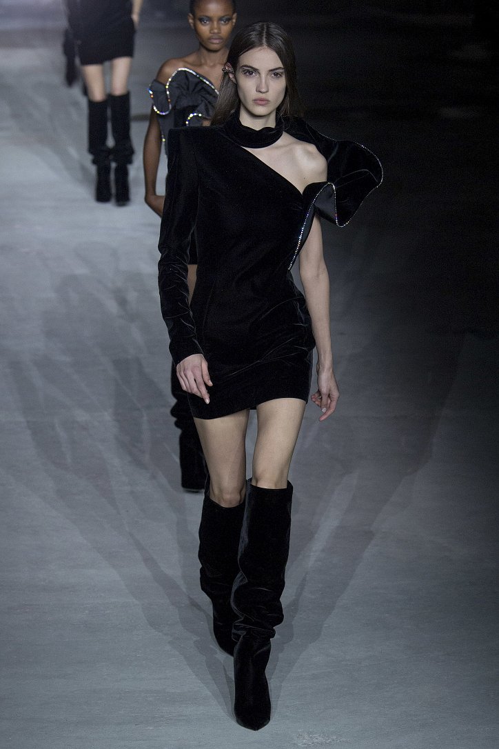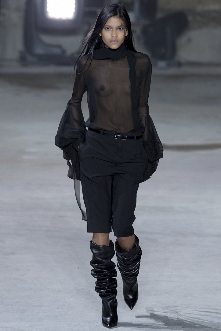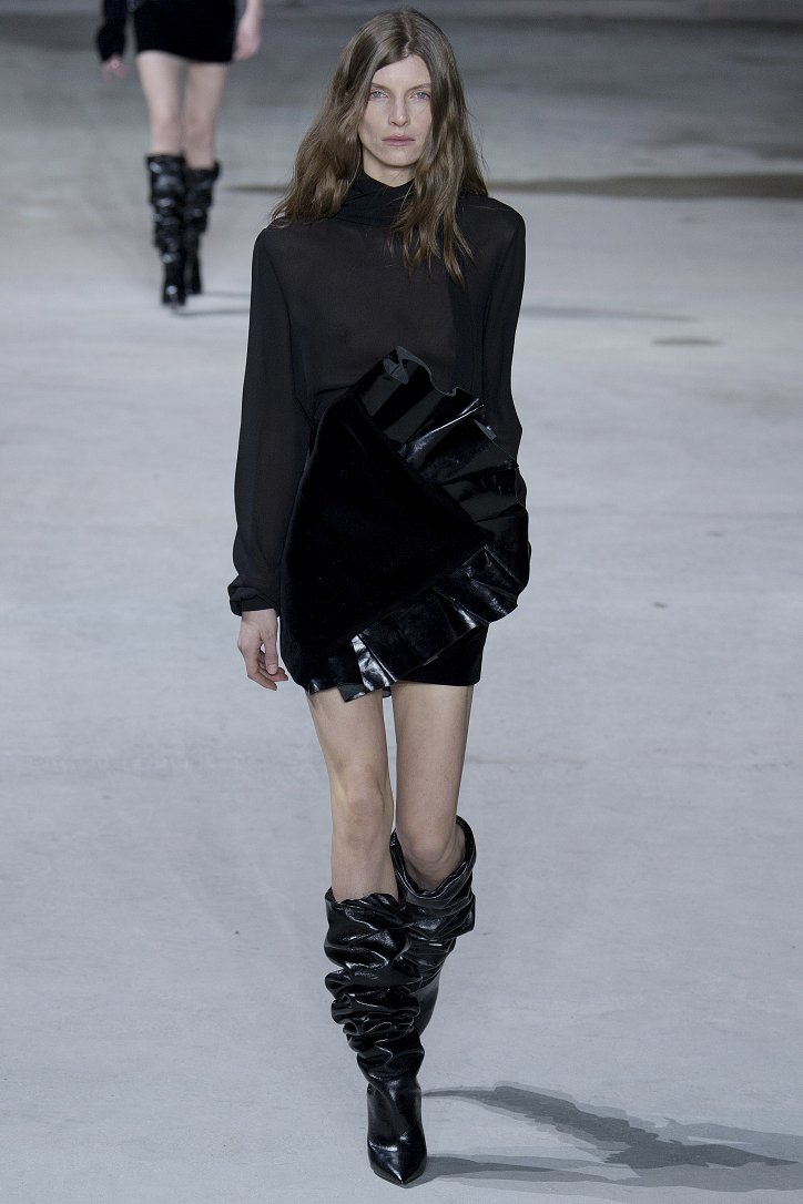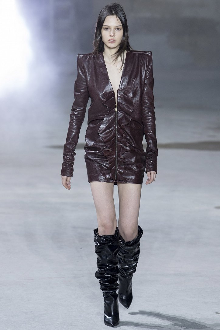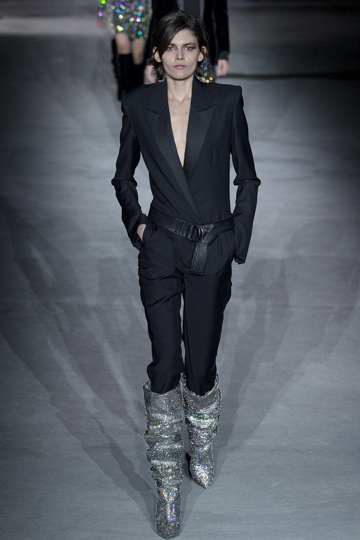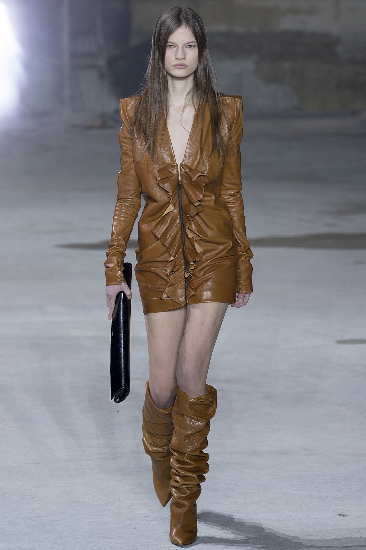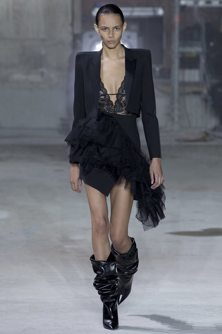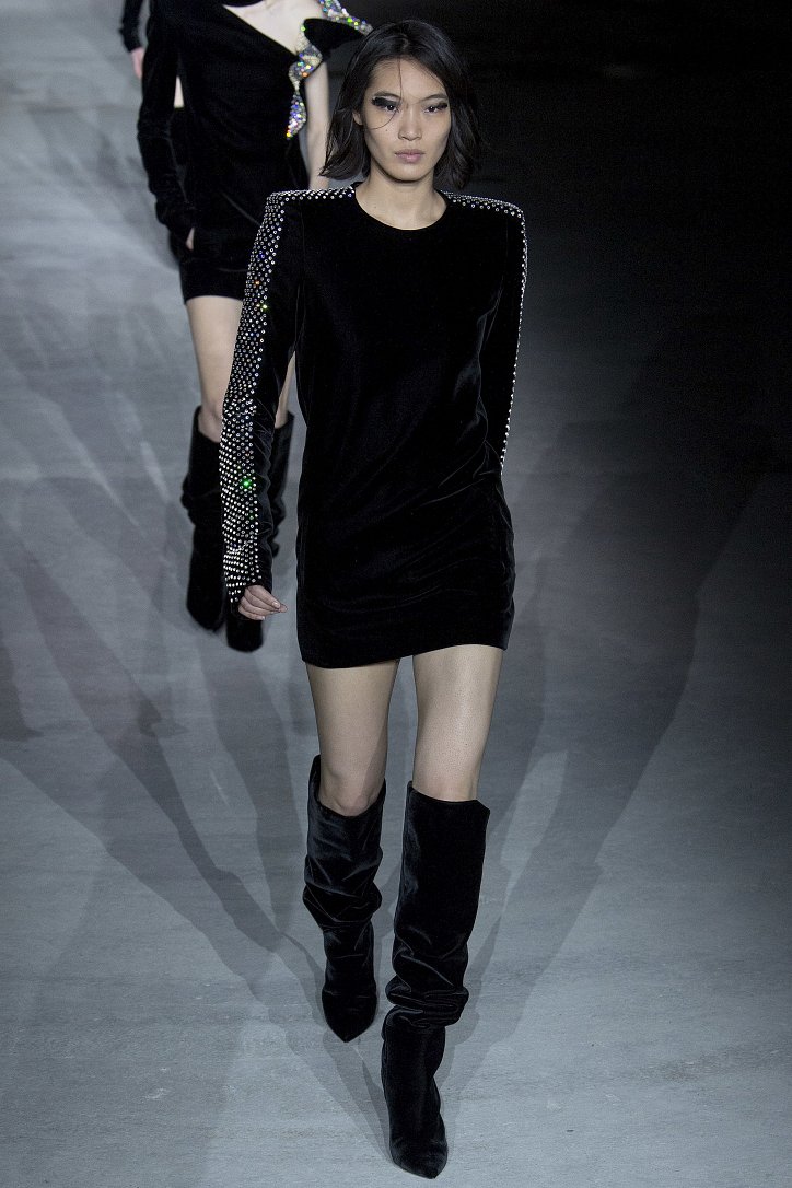 С чем ассоциируется бренд Saint Laurent? У Anthony Vaccarello – с ночными клубами и вечеринками. Так что свою коллекцию Saint Laurent осень-зима 2017-2018 дизайнер решил продемонстрировать в соответствующей обстановке: в штаб-квартире бренда были возведены очень своеобразные декорации, напоминающие модный «альтернативный» клуб. Среди бетонных стен и строительных лесов в свете резких огней дефилировали модели в эпатажных нарядах: мини-юбках и бомберах-оверсайз, джинсах и ультракоротких дубленках, асимметричных платьях с разрезами почти до талии и сапогах-гармошках. Латекс, кожа, сверхоткровенные вырезы и разрезы, дерзкое мини – коллекция получилась очень сексуальной и смелой.
