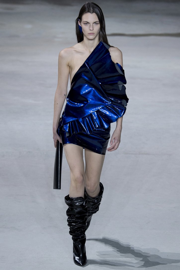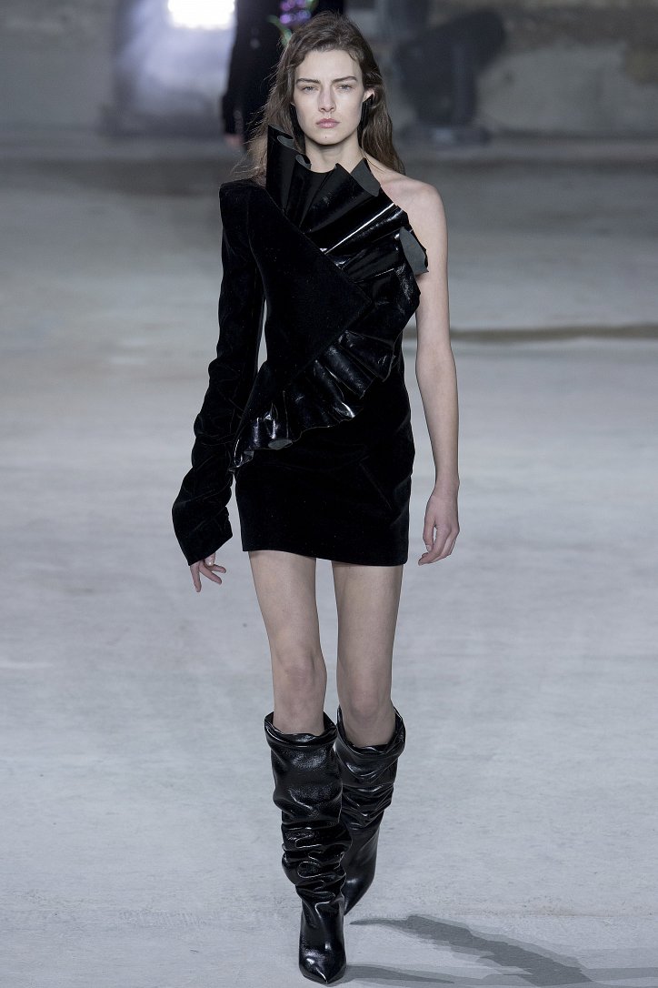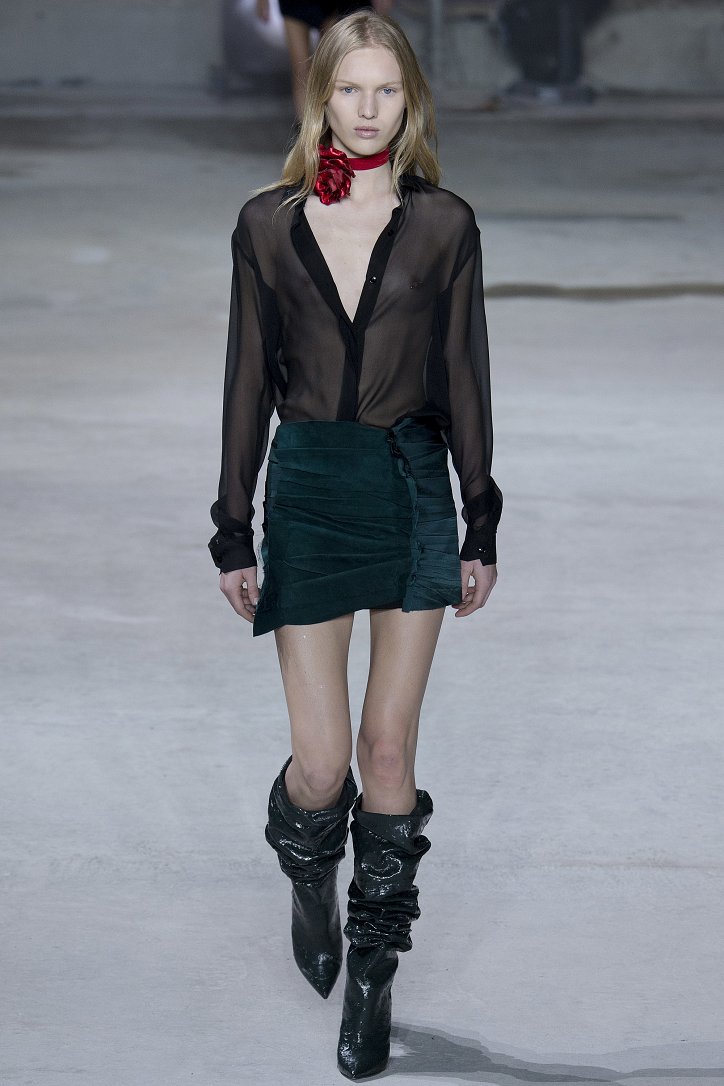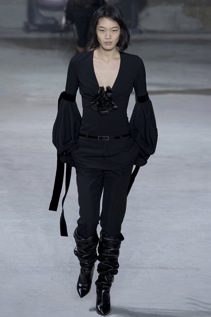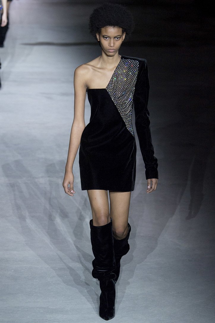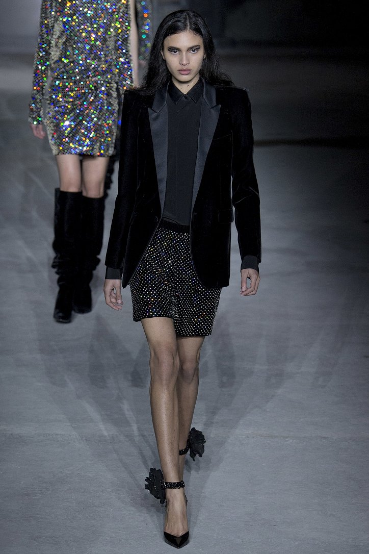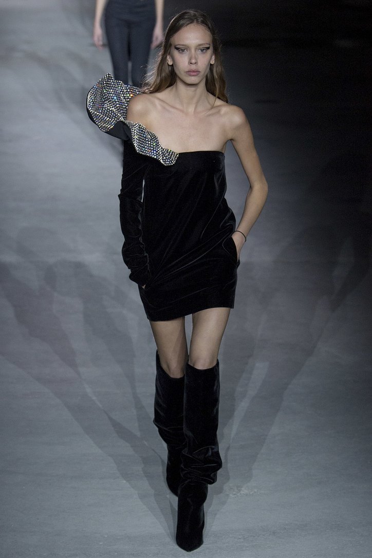 С чем ассоциируется бренд Saint Laurent? У Anthony Vaccarello – с ночными клубами и вечеринками. Так что свою коллекцию Saint Laurent осень-зима 2017-2018 дизайнер решил продемонстрировать в соответствующей обстановке: в штаб-квартире бренда были возведены очень своеобразные декорации, напоминающие модный «альтернативный» клуб. Среди бетонных стен и строительных лесов в свете резких огней дефилировали модели в эпатажных нарядах: мини-юбках и бомберах-оверсайз, джинсах и ультракоротких дубленках, асимметричных платьях с разрезами почти до талии и сапогах-гармошках. Латекс, кожа, сверхоткровенные вырезы и разрезы, дерзкое мини – коллекция получилась очень сексуальной и смелой.