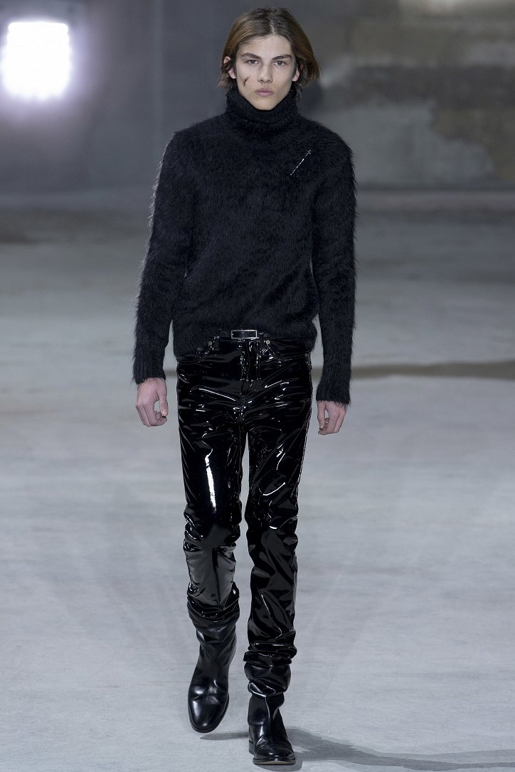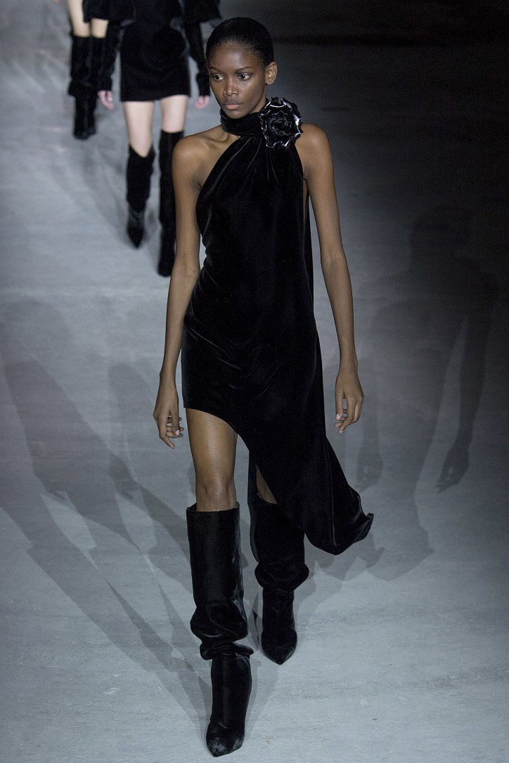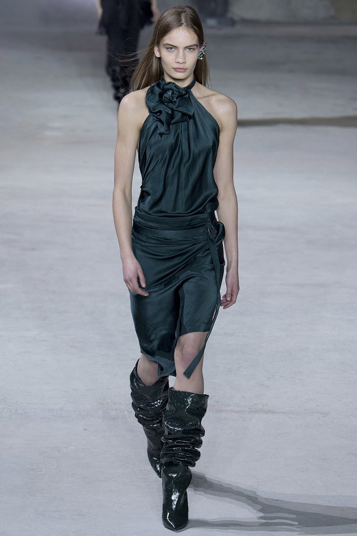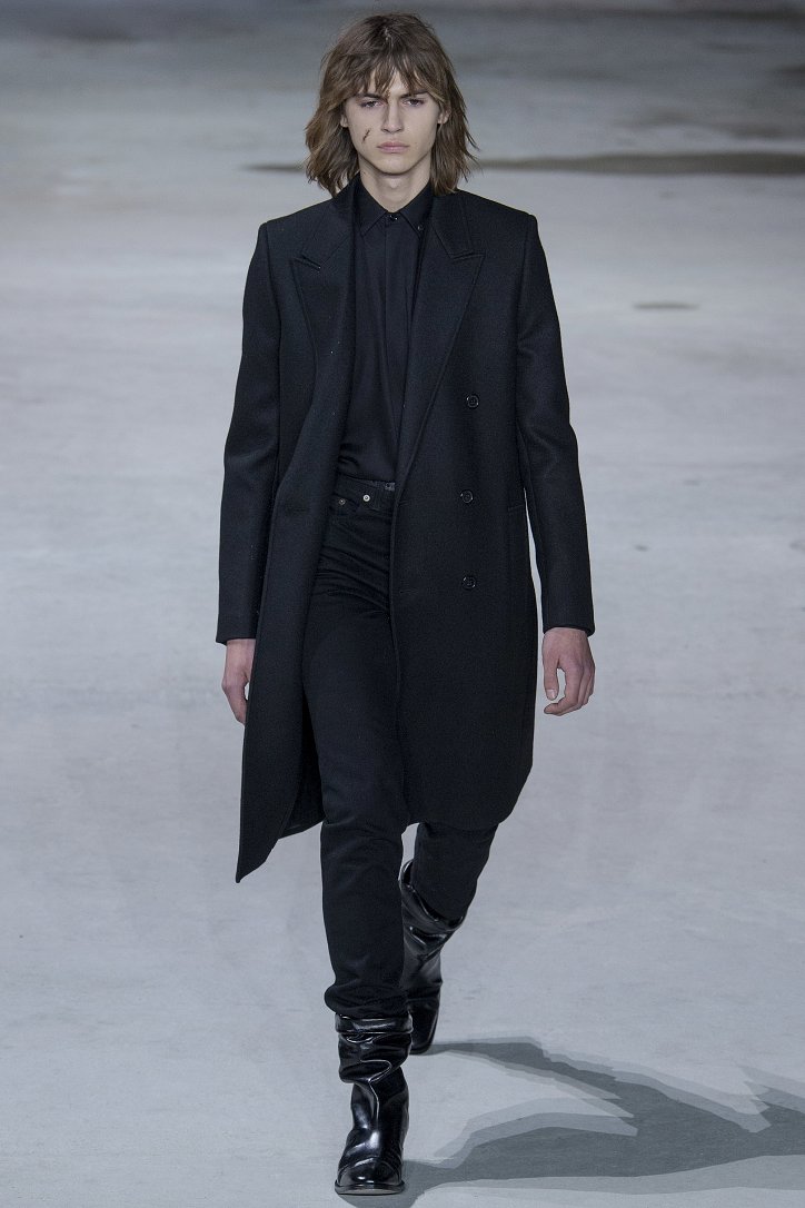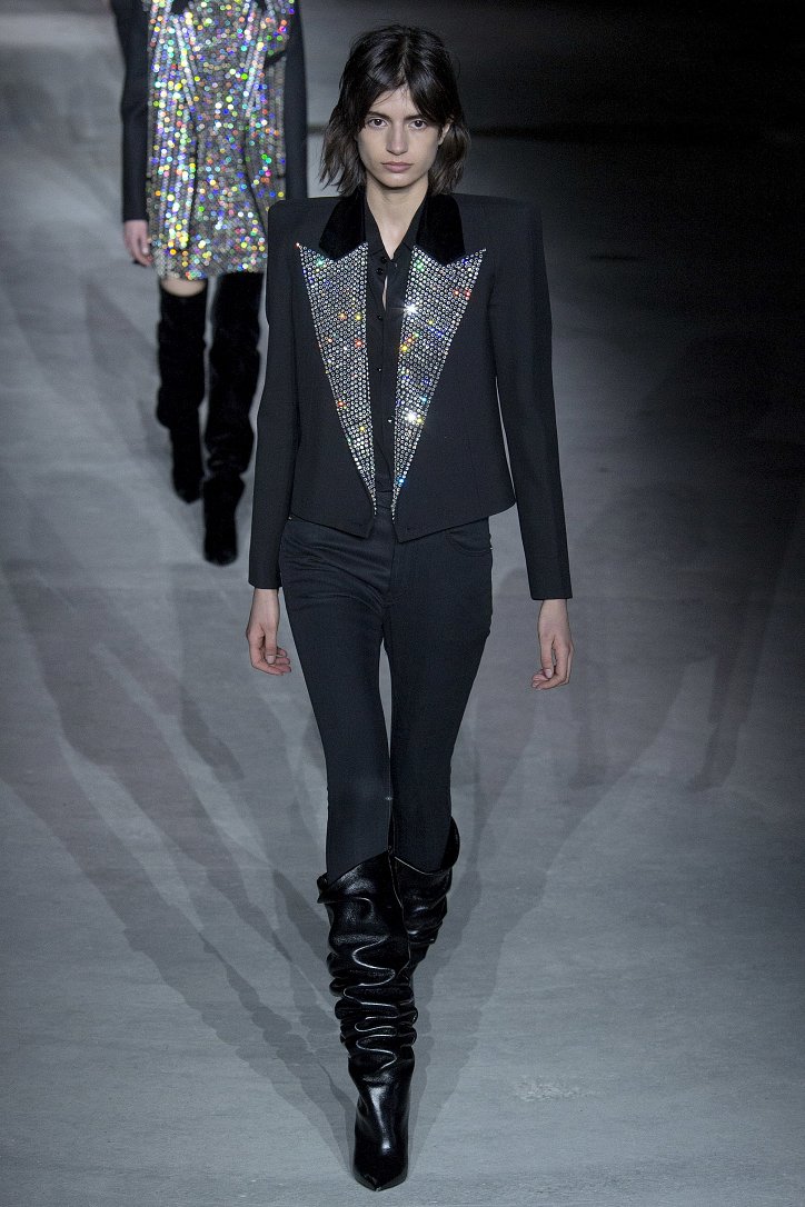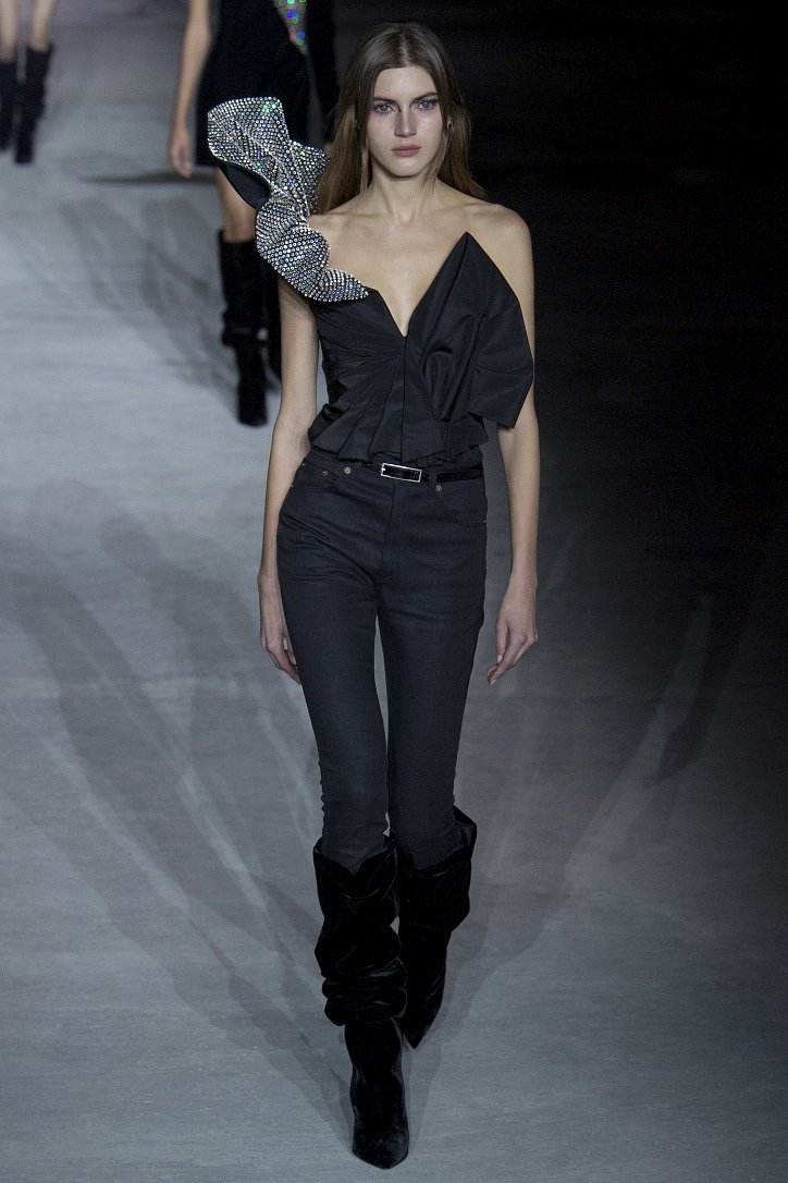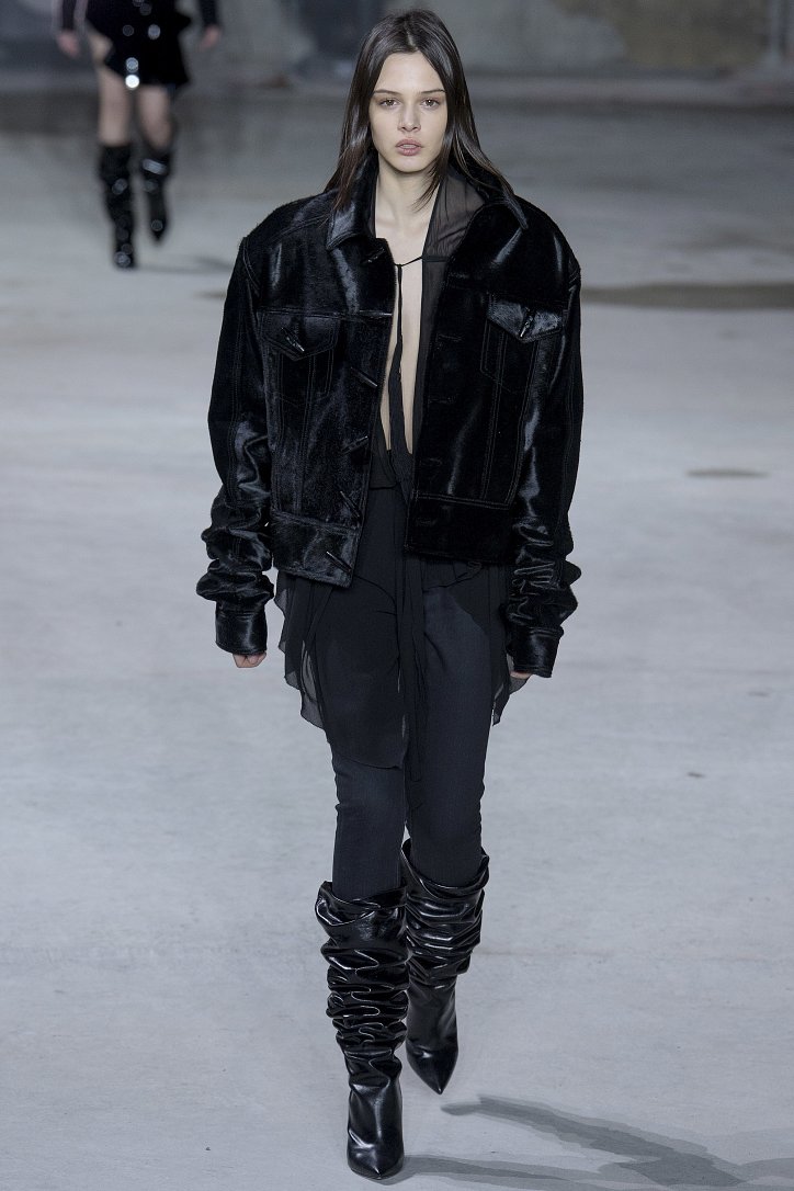 С чем ассоциируется бренд Saint Laurent? У Anthony Vaccarello – с ночными клубами и вечеринками. Так что свою коллекцию Saint Laurent осень-зима 2017-2018 дизайнер решил продемонстрировать в соответствующей обстановке: в штаб-квартире бренда были возведены очень своеобразные декорации, напоминающие модный «альтернативный» клуб. Среди бетонных стен и строительных лесов в свете резких огней дефилировали модели в эпатажных нарядах: мини-юбках и бомберах-оверсайз, джинсах и ультракоротких дубленках, асимметричных платьях с разрезами почти до талии и сапогах-гармошках. Латекс, кожа, сверхоткровенные вырезы и разрезы, дерзкое мини – коллекция получилась очень сексуальной и смелой.