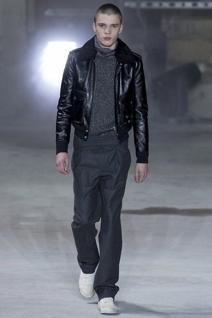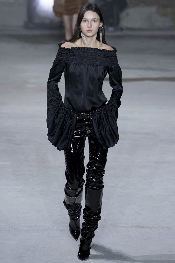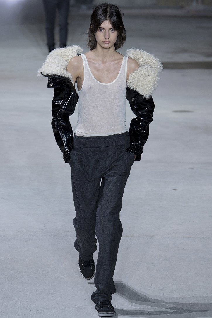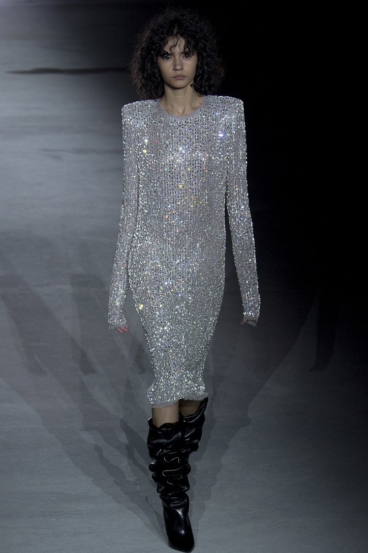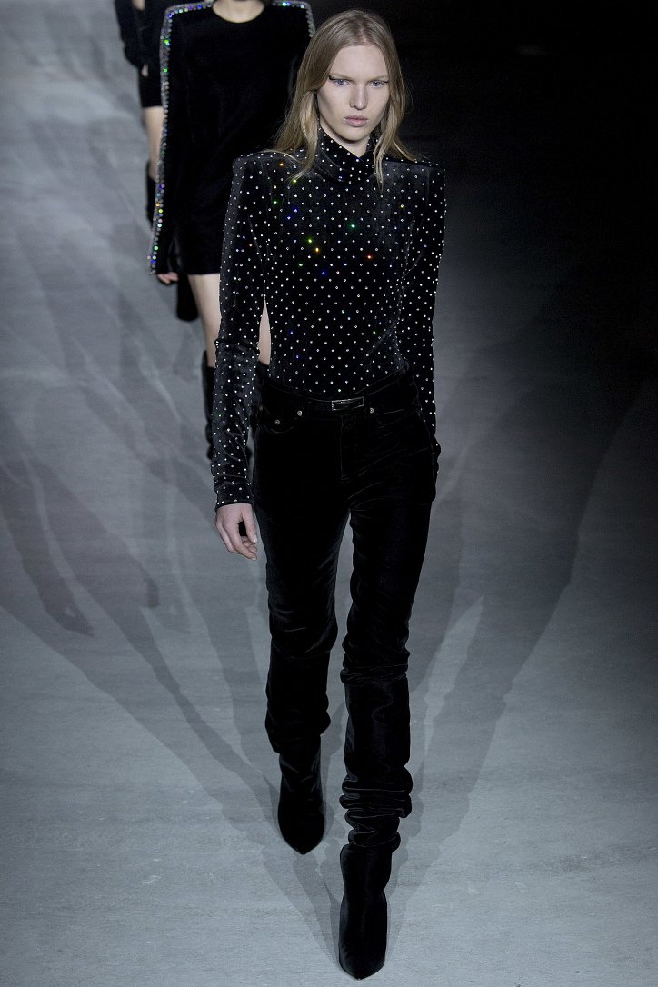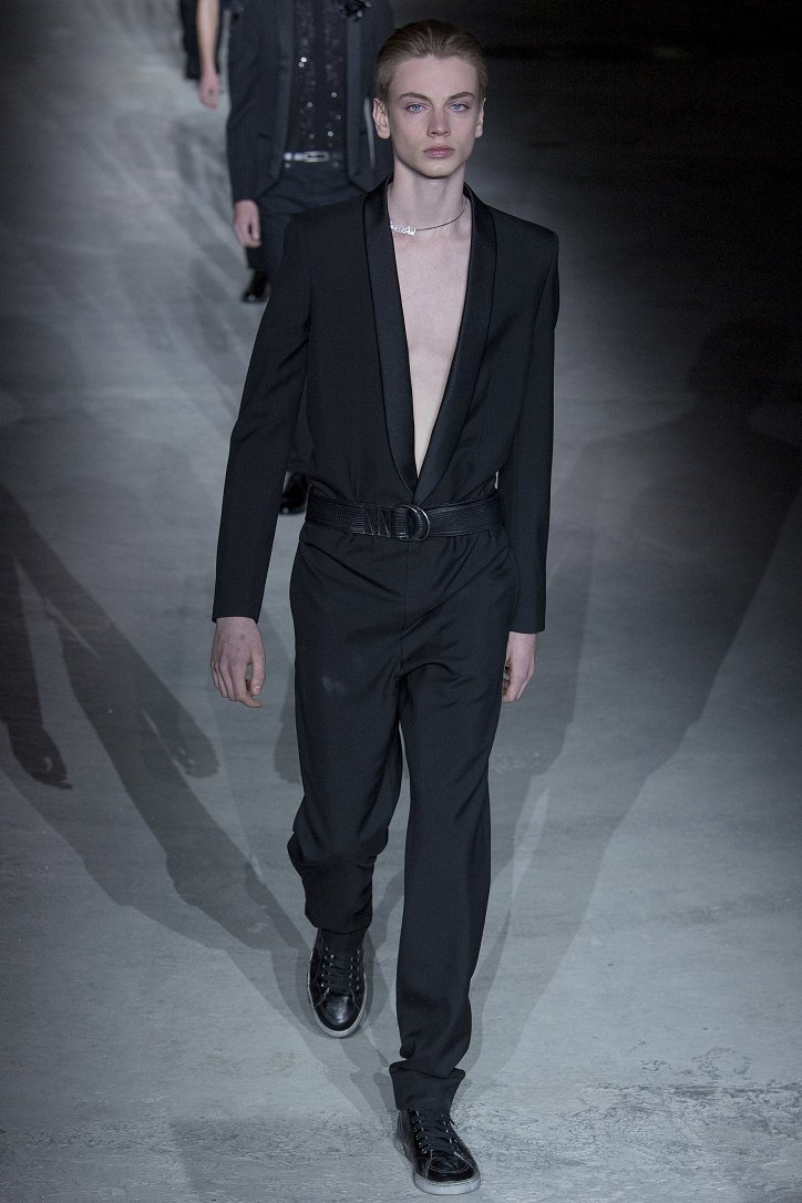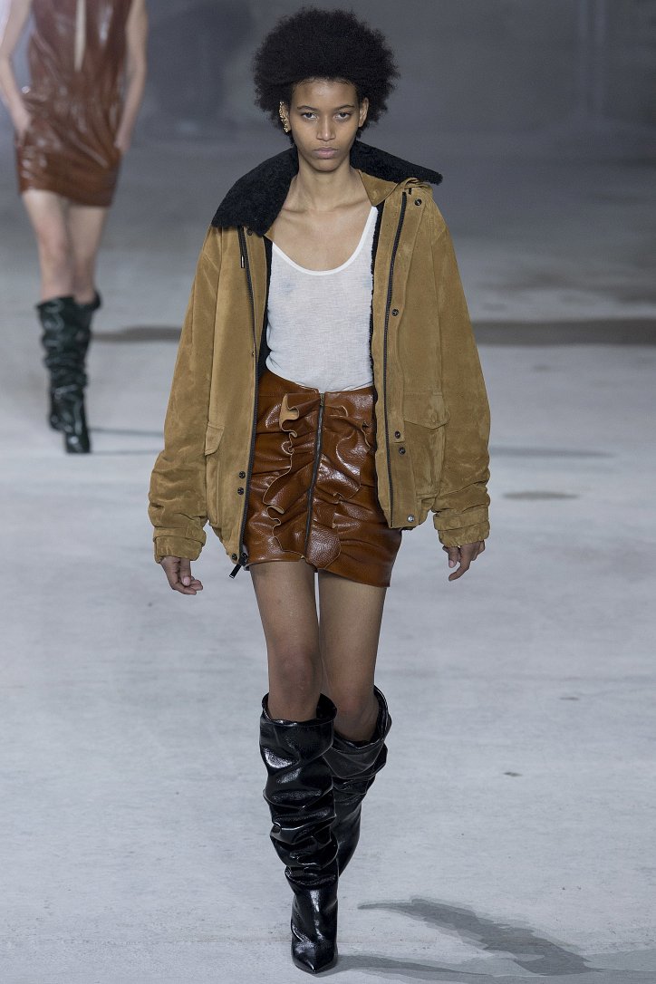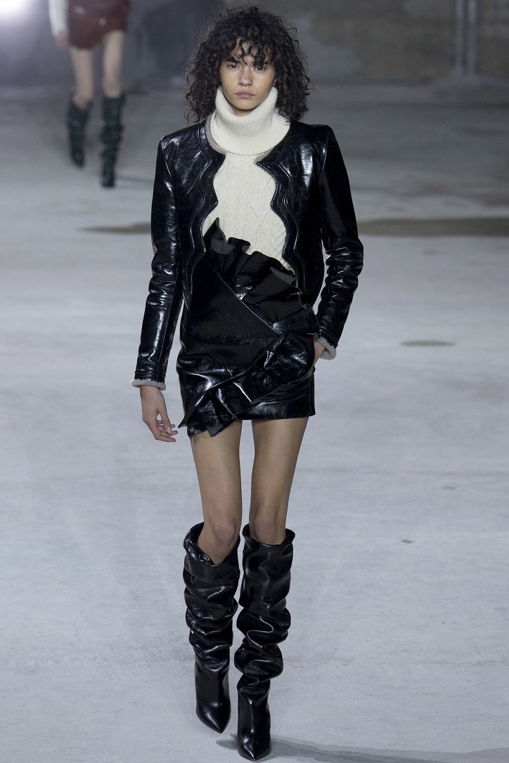 С чем ассоциируется бренд Saint Laurent? У Anthony Vaccarello – с ночными клубами и вечеринками. Так что свою коллекцию Saint Laurent осень-зима 2017-2018 дизайнер решил продемонстрировать в соответствующей обстановке: в штаб-квартире бренда были возведены очень своеобразные декорации, напоминающие модный «альтернативный» клуб. Среди бетонных стен и строительных лесов в свете резких огней дефилировали модели в эпатажных нарядах: мини-юбках и бомберах-оверсайз, джинсах и ультракоротких дубленках, асимметричных платьях с разрезами почти до талии и сапогах-гармошках. Латекс, кожа, сверхоткровенные вырезы и разрезы, дерзкое мини – коллекция получилась очень сексуальной и смелой.