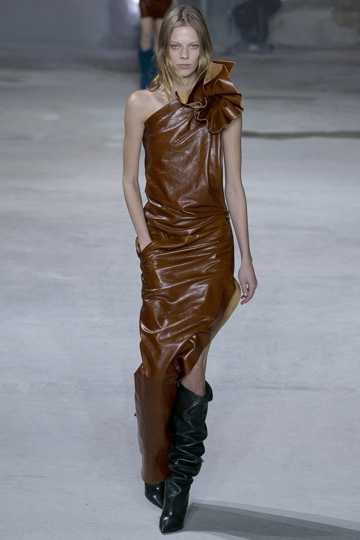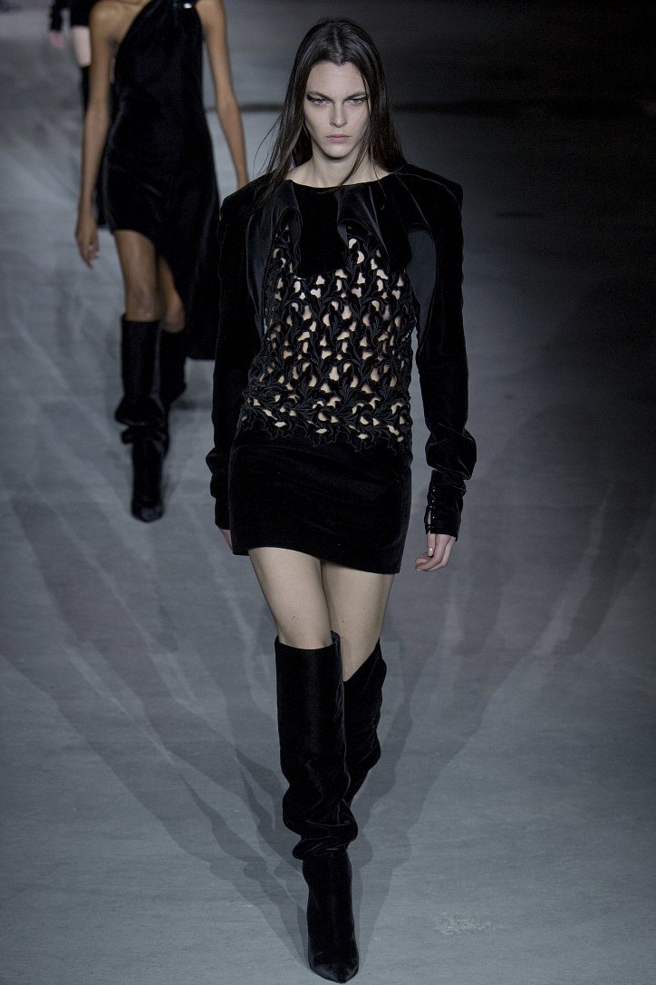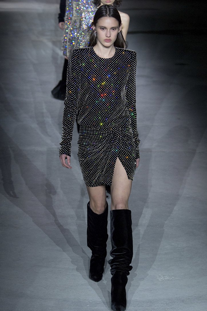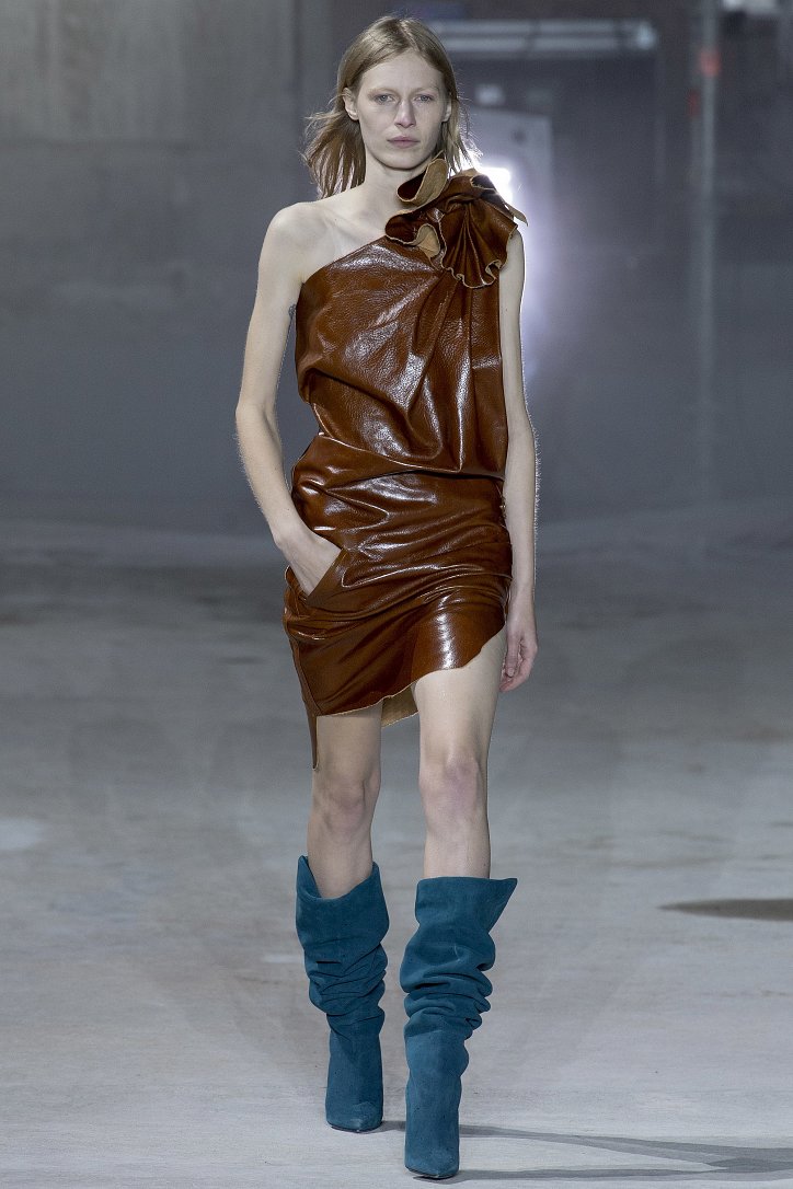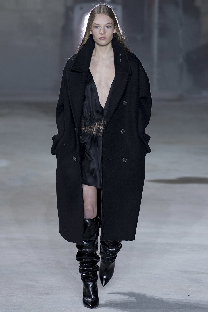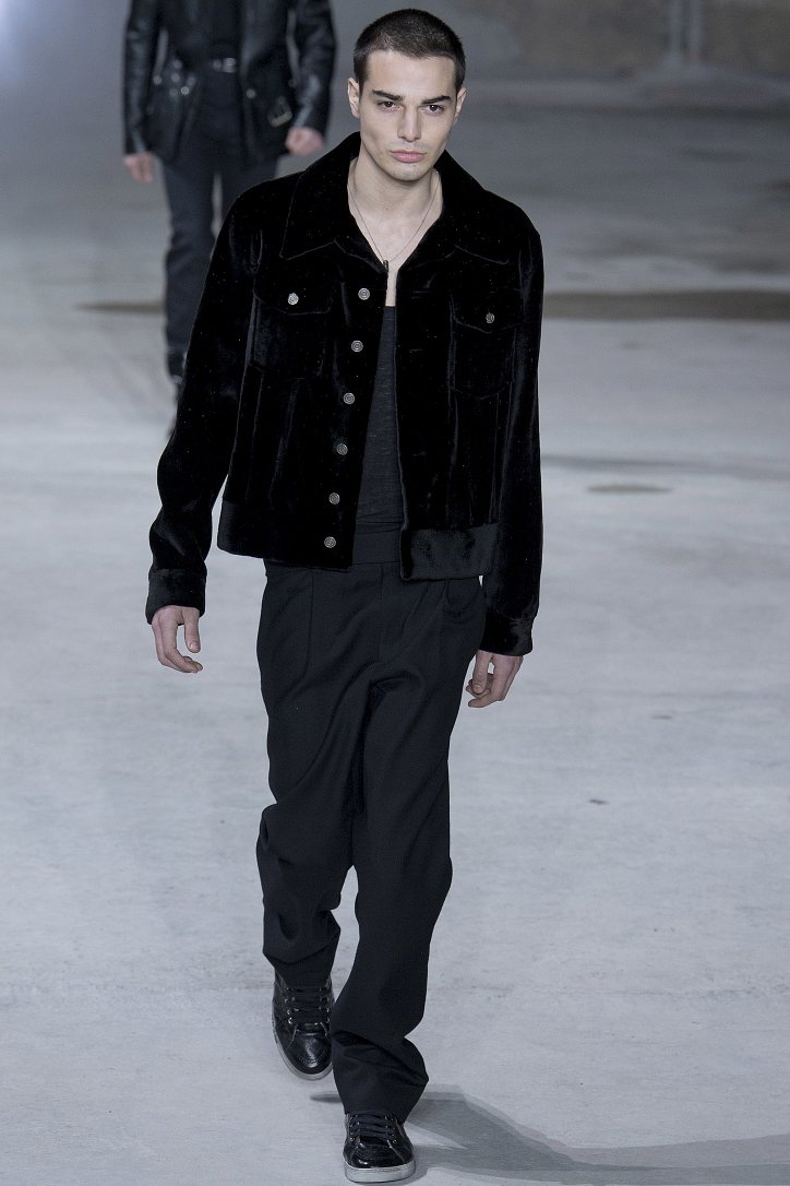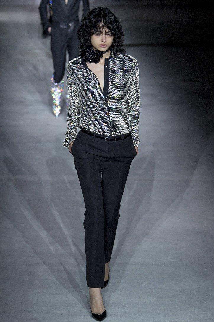 С чем ассоциируется бренд Saint Laurent? У Anthony Vaccarello – с ночными клубами и вечеринками. Так что свою коллекцию Saint Laurent осень-зима 2017-2018 дизайнер решил продемонстрировать в соответствующей обстановке: в штаб-квартире бренда были возведены очень своеобразные декорации, напоминающие модный «альтернативный» клуб. Среди бетонных стен и строительных лесов в свете резких огней дефилировали модели в эпатажных нарядах: мини-юбках и бомберах-оверсайз, джинсах и ультракоротких дубленках, асимметричных платьях с разрезами почти до талии и сапогах-гармошках. Латекс, кожа, сверхоткровенные вырезы и разрезы, дерзкое мини – коллекция получилась очень сексуальной и смелой.