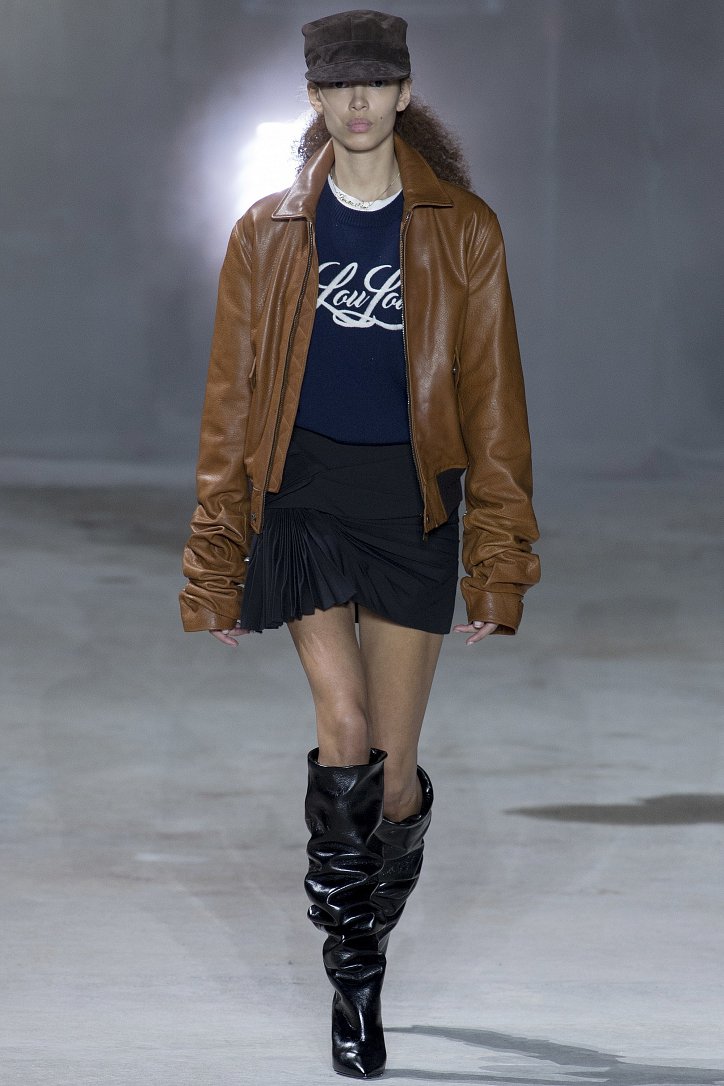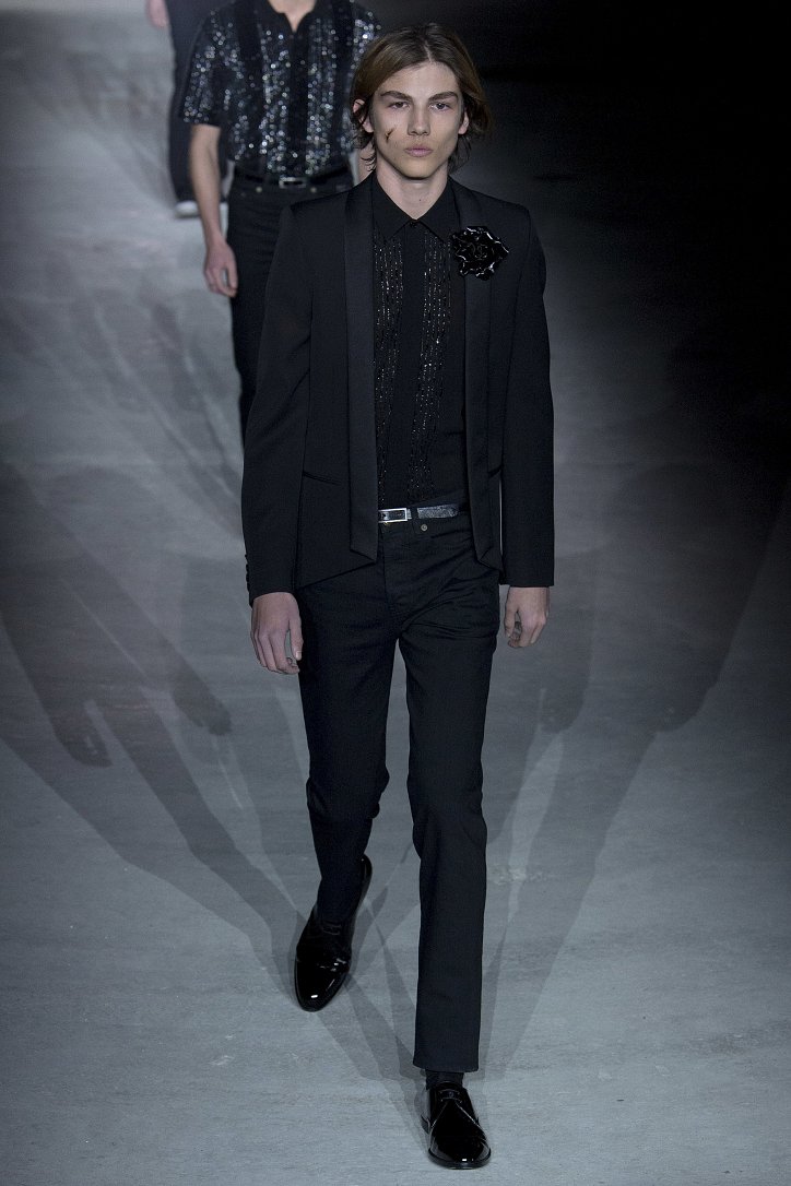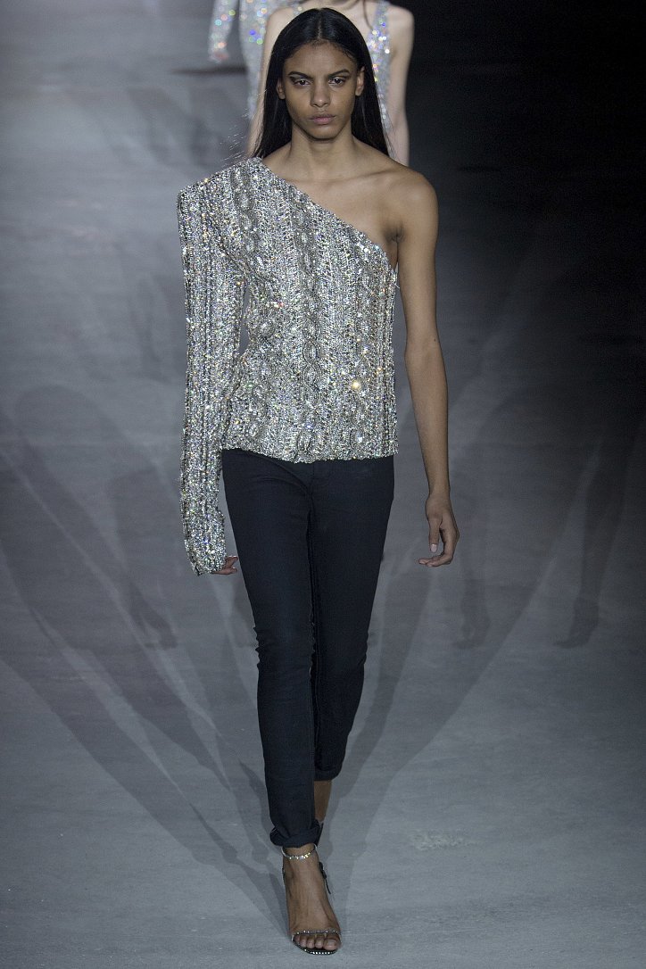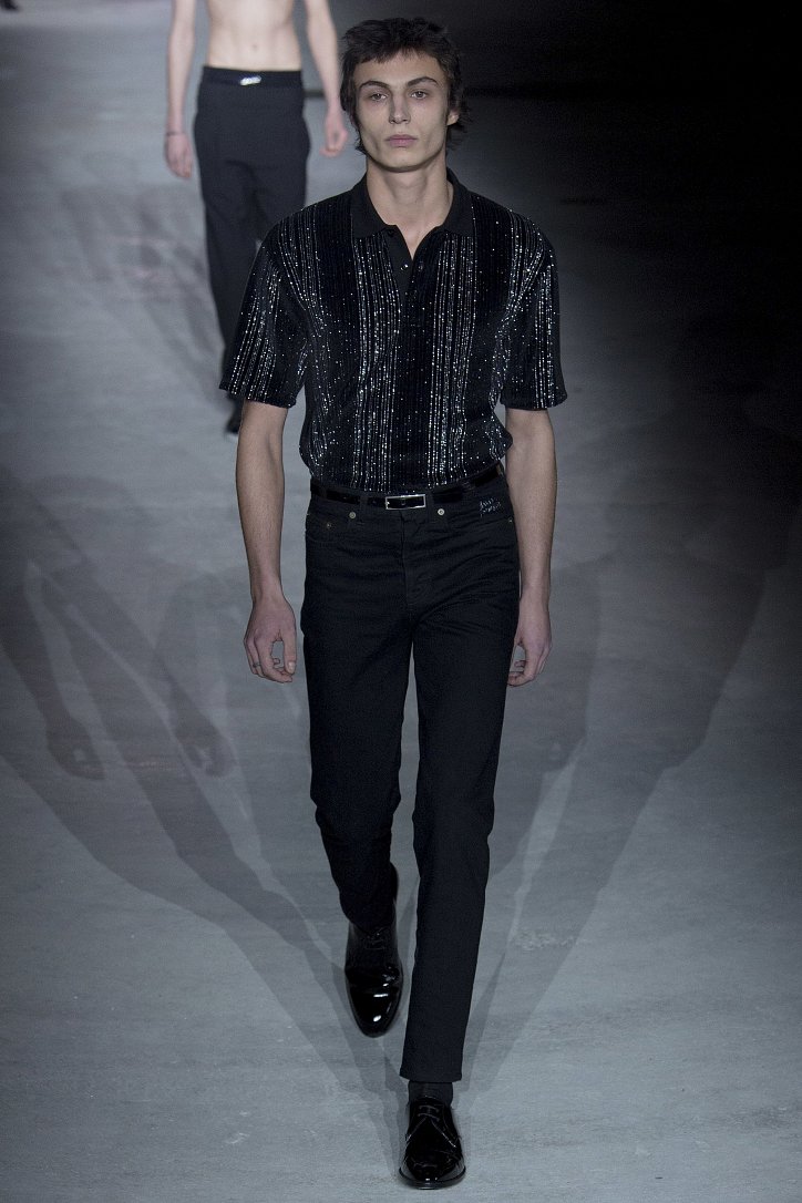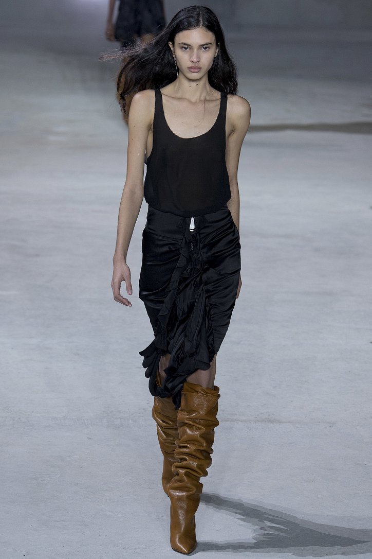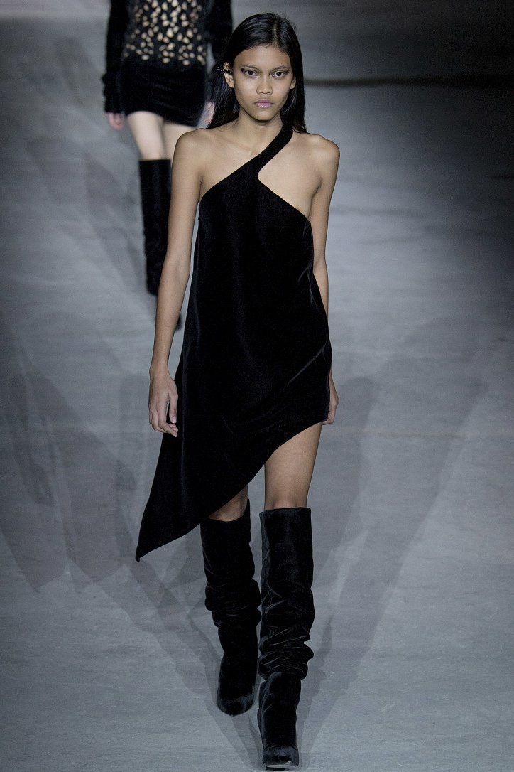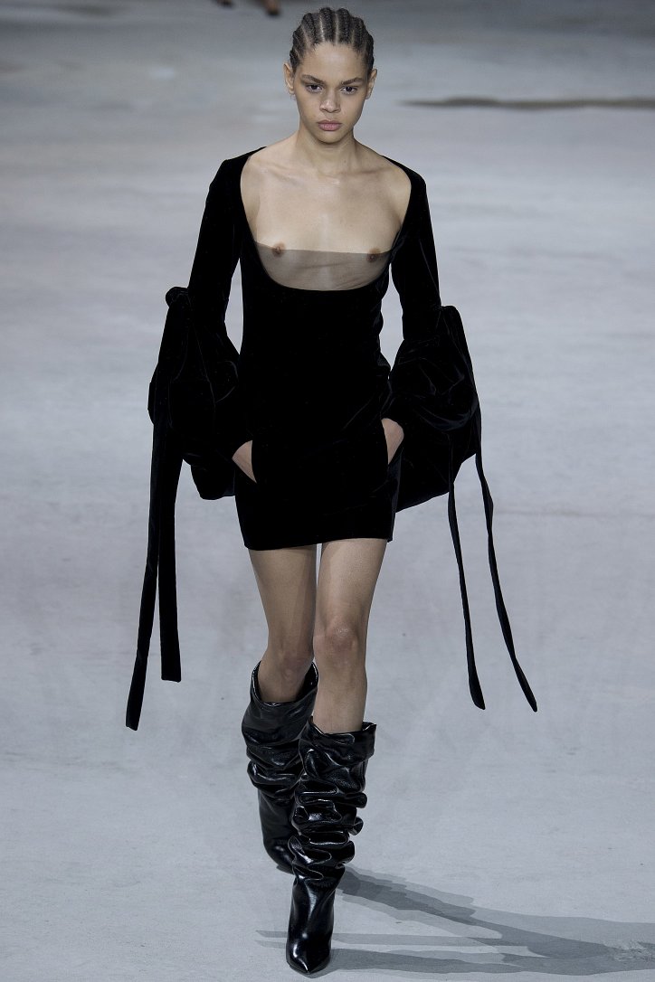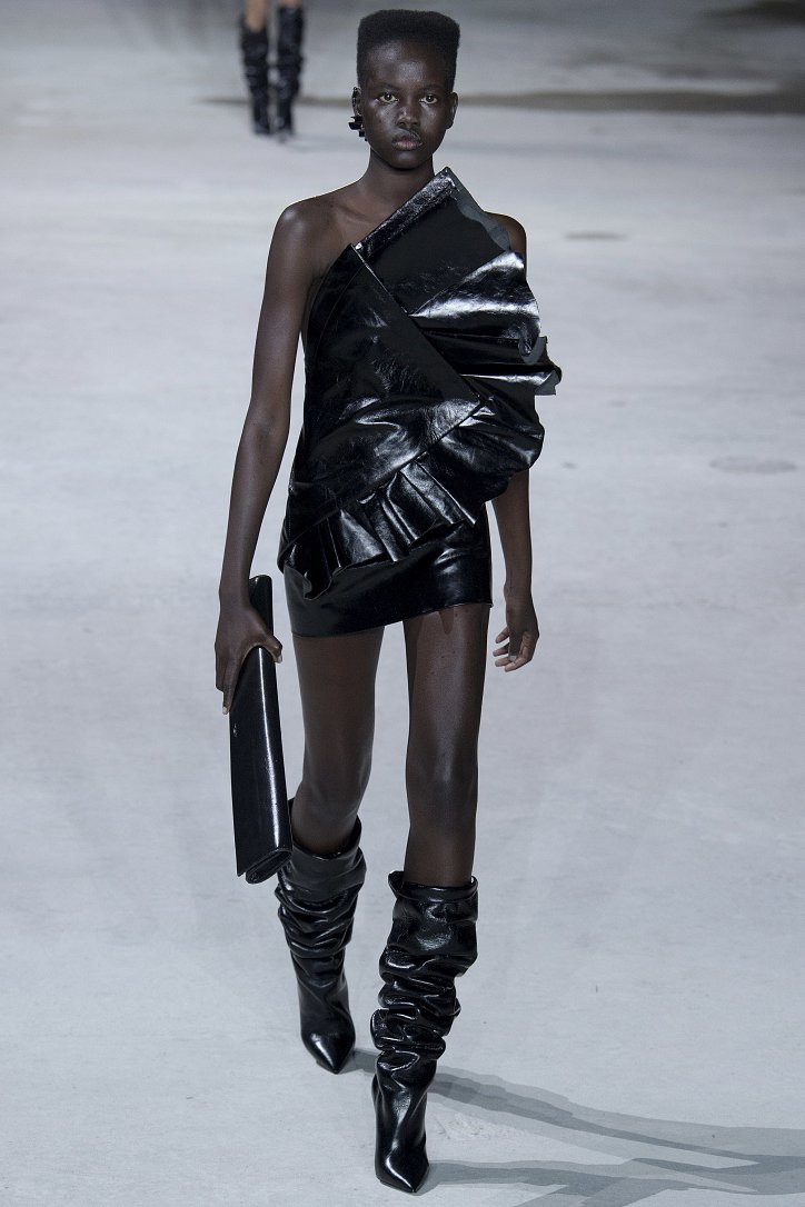С чем ассоциируется бренд Saint Laurent? У Anthony Vaccarello – с ночными клубами и вечеринками. Так что свою коллекцию Saint Laurent осень-зима 2017-2018 дизайнер решил продемонстрировать в соответствующей обстановке: в штаб-квартире бренда были возведены очень своеобразные декорации, напоминающие модный «альтернативный» клуб. Среди бетонных стен и строительных лесов в свете резких огней дефилировали модели в эпатажных нарядах: мини-юбках и бомберах-оверсайз, джинсах и ультракоротких дубленках, асимметричных платьях с разрезами почти до талии и сапогах-гармошках. Латекс, кожа, сверхоткровенные вырезы и разрезы, дерзкое мини – коллекция получилась очень сексуальной и смелой.