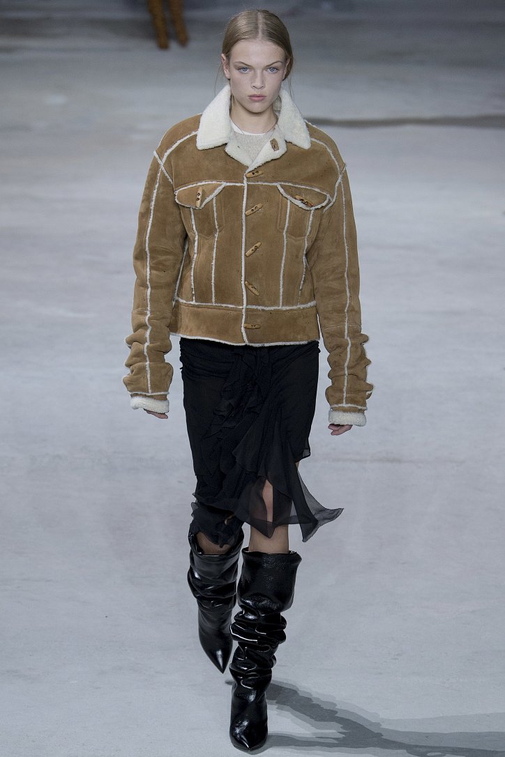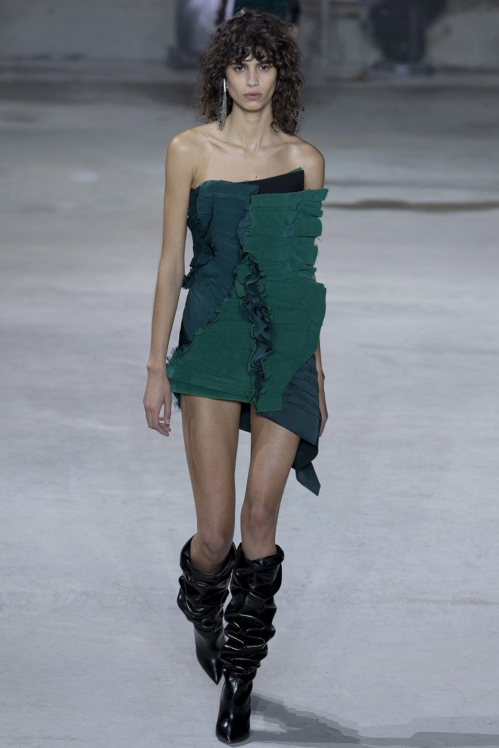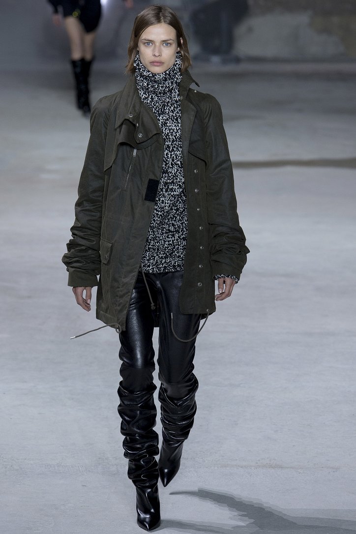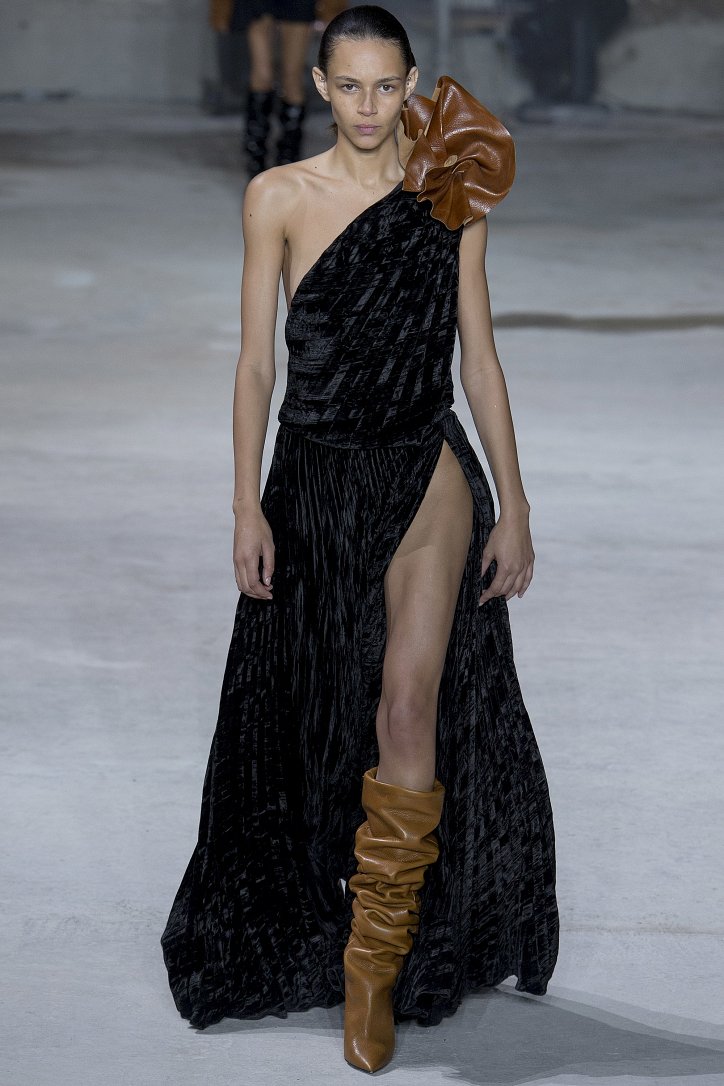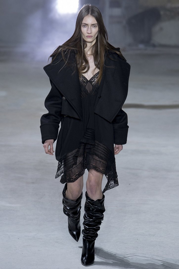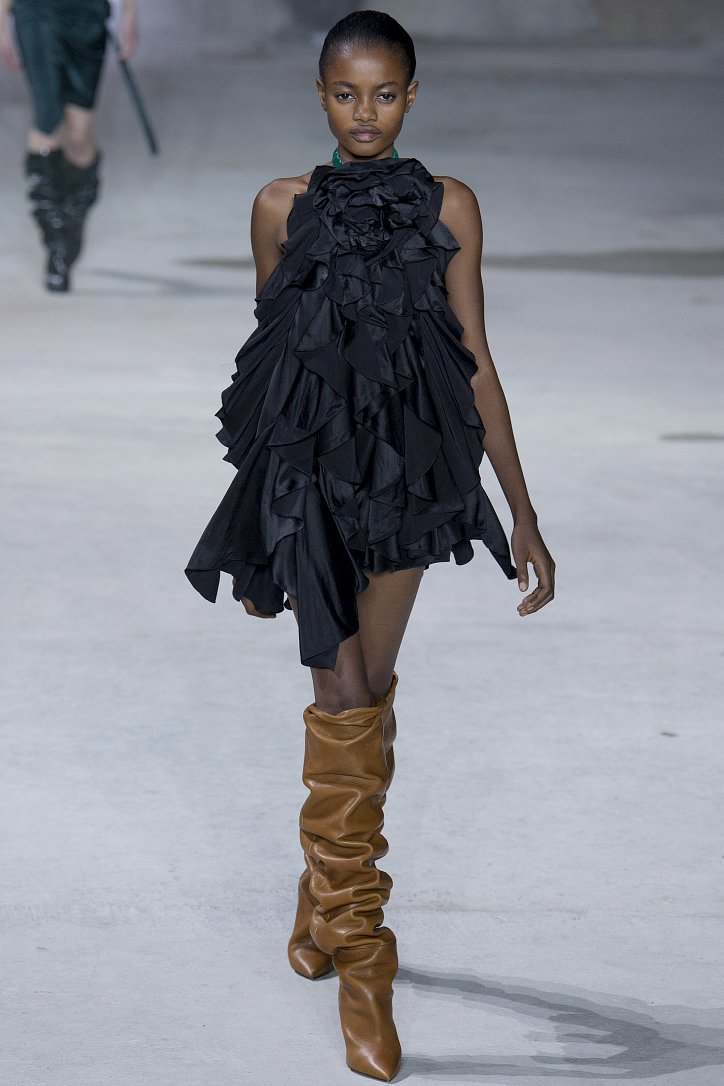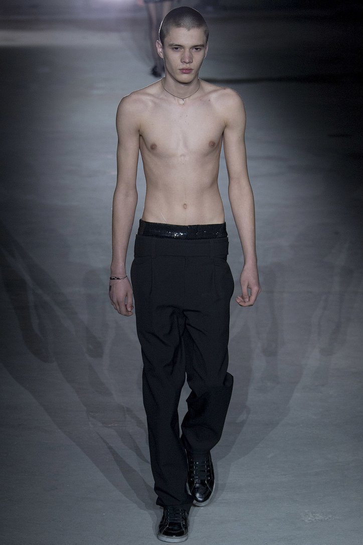 С чем ассоциируется бренд Saint Laurent? У Anthony Vaccarello – с ночными клубами и вечеринками. Так что свою коллекцию Saint Laurent осень-зима 2017-2018 дизайнер решил продемонстрировать в соответствующей обстановке: в штаб-квартире бренда были возведены очень своеобразные декорации, напоминающие модный «альтернативный» клуб. Среди бетонных стен и строительных лесов в свете резких огней дефилировали модели в эпатажных нарядах: мини-юбках и бомберах-оверсайз, джинсах и ультракоротких дубленках, асимметричных платьях с разрезами почти до талии и сапогах-гармошках. Латекс, кожа, сверхоткровенные вырезы и разрезы, дерзкое мини – коллекция получилась очень сексуальной и смелой.