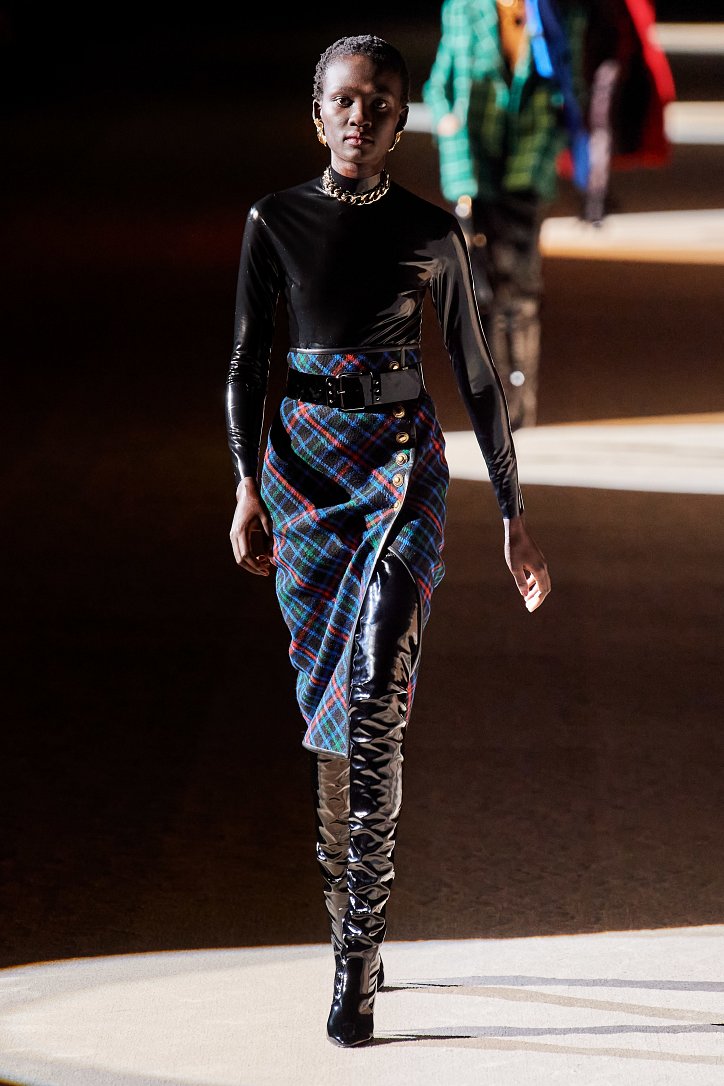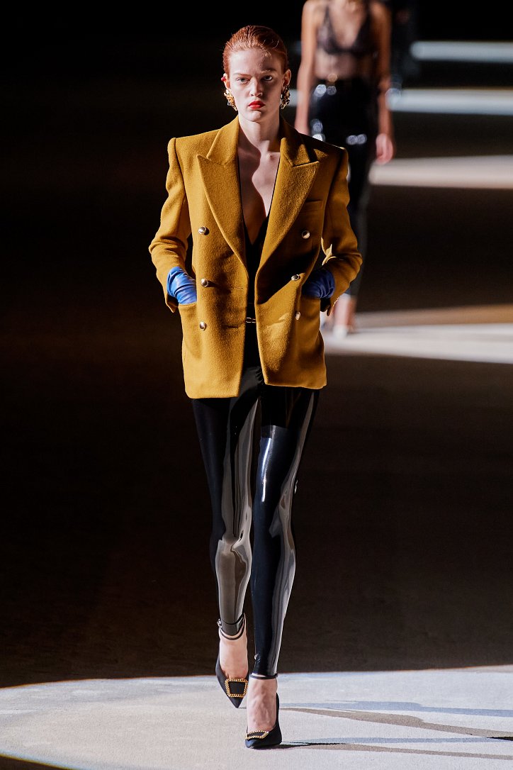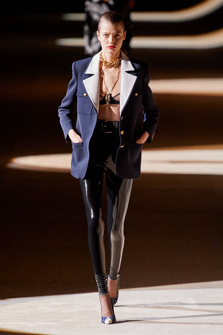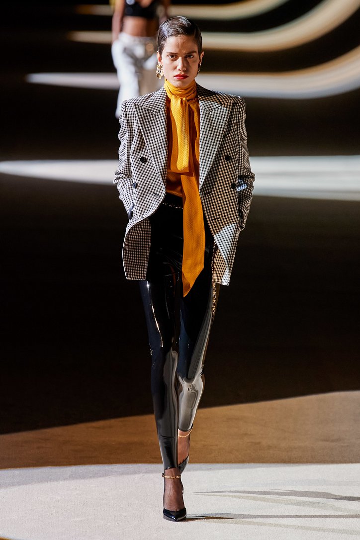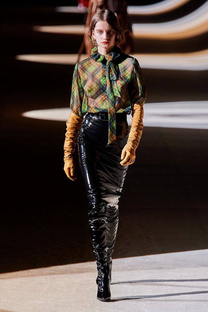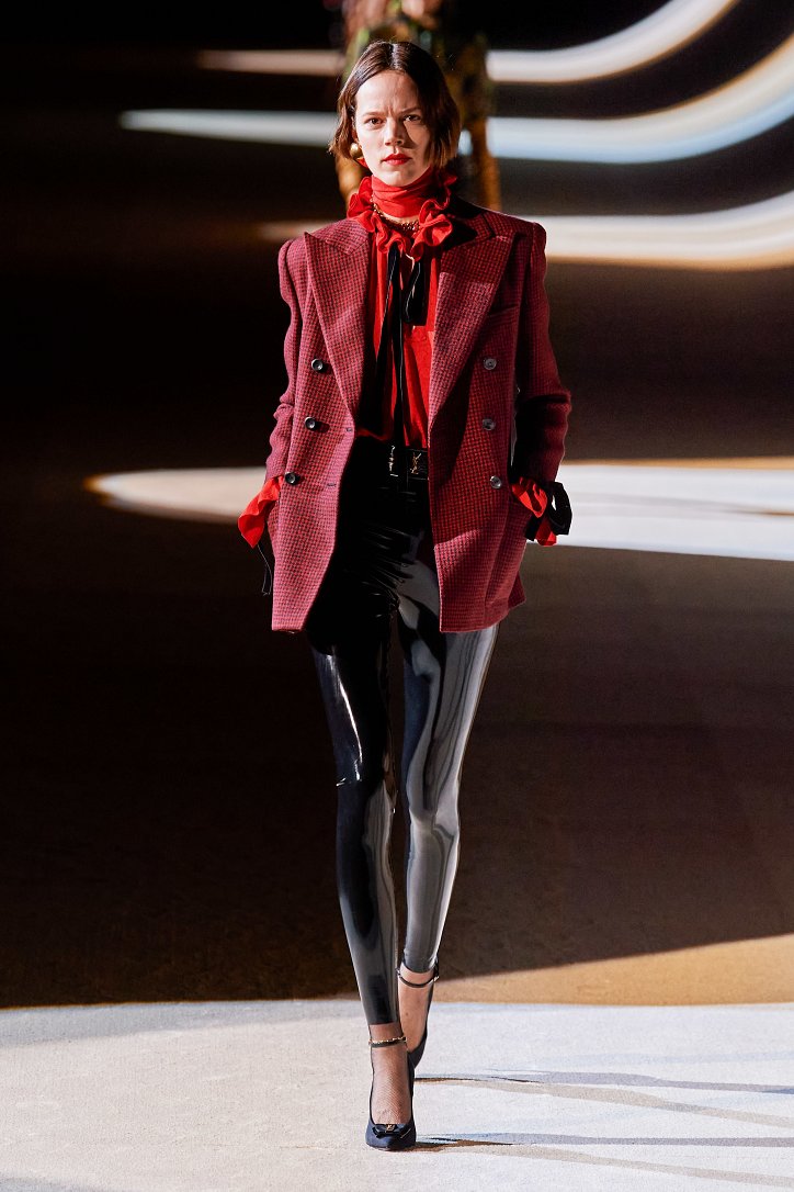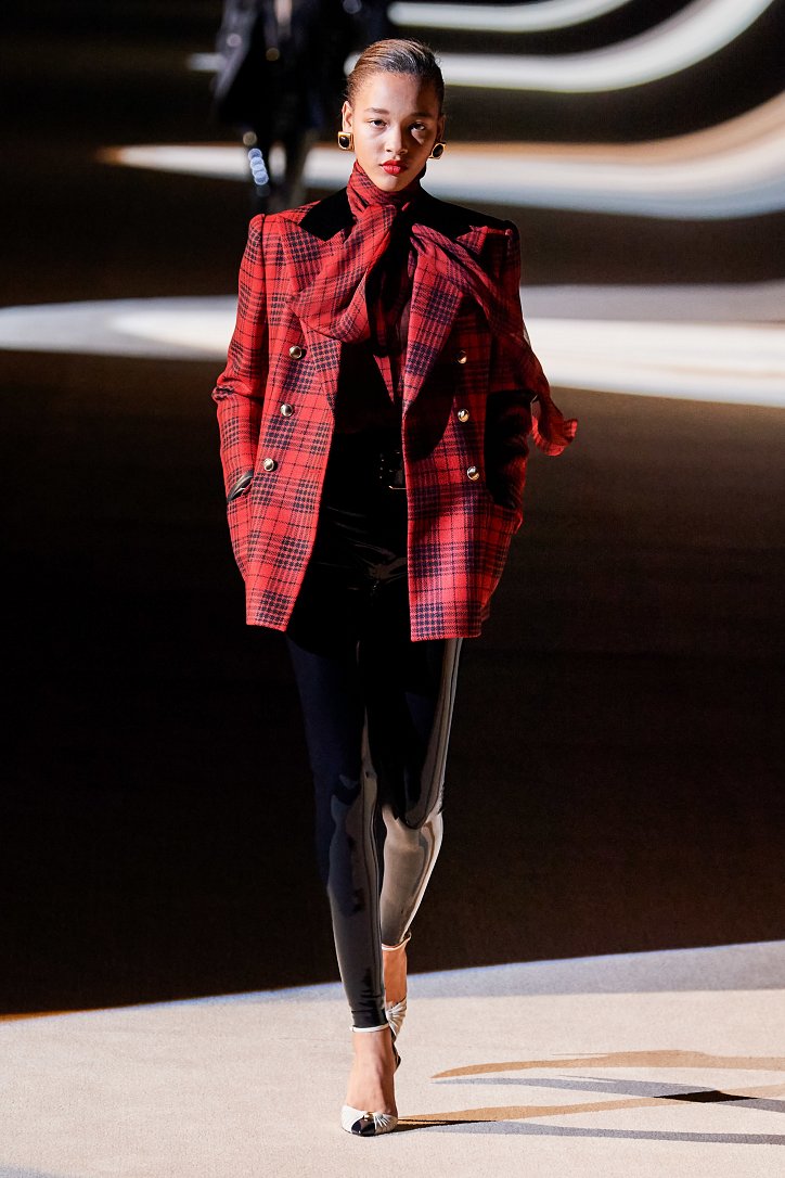 Двубортный жакет с золотыми пуговицами из черно-красного тартана – и черные лаковые лосины – это лук задал тон всей коллекции Saint Laurent, в которой строгий дресс-код плотно переплелся с чувственными и откровенными моделями в стиле dominatrix.