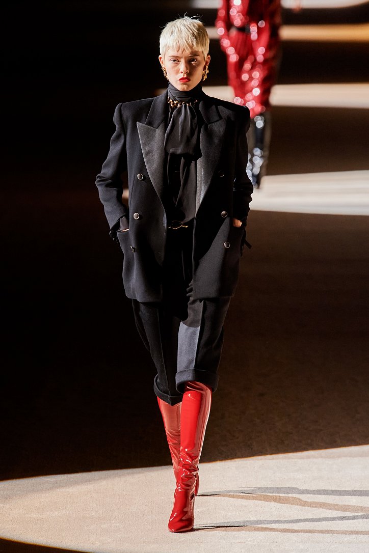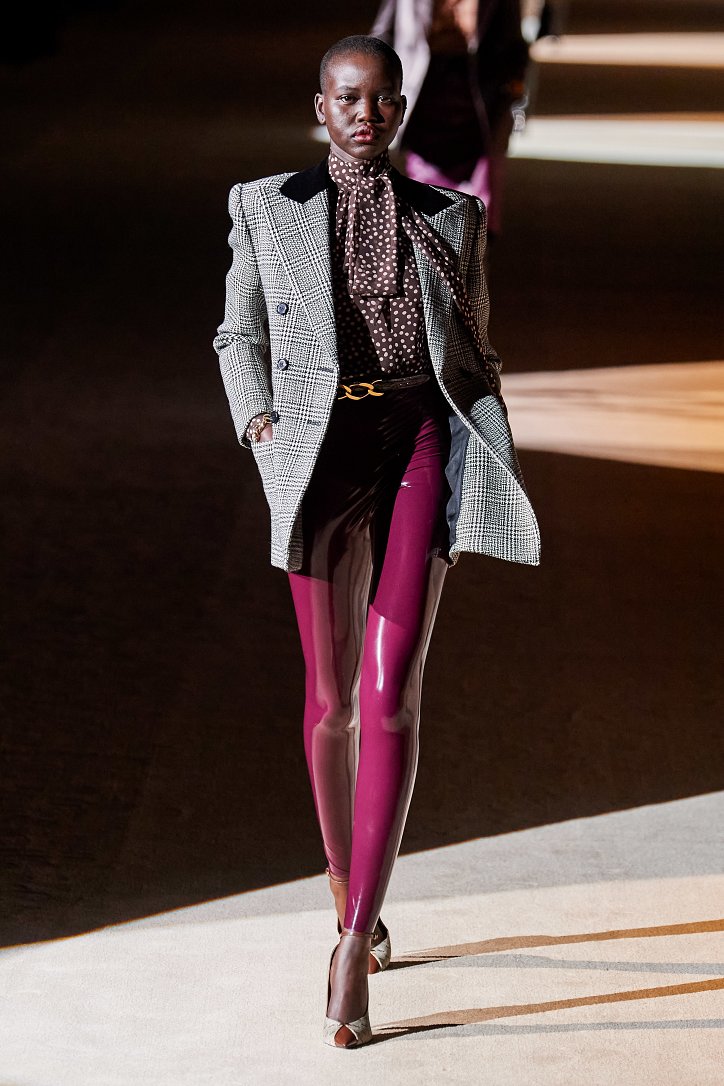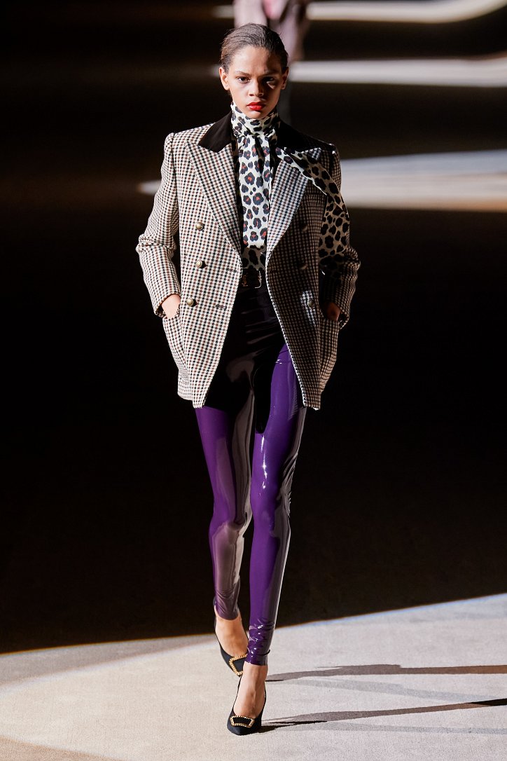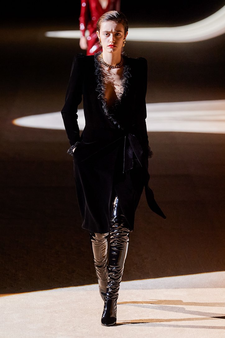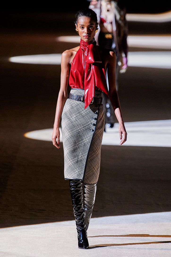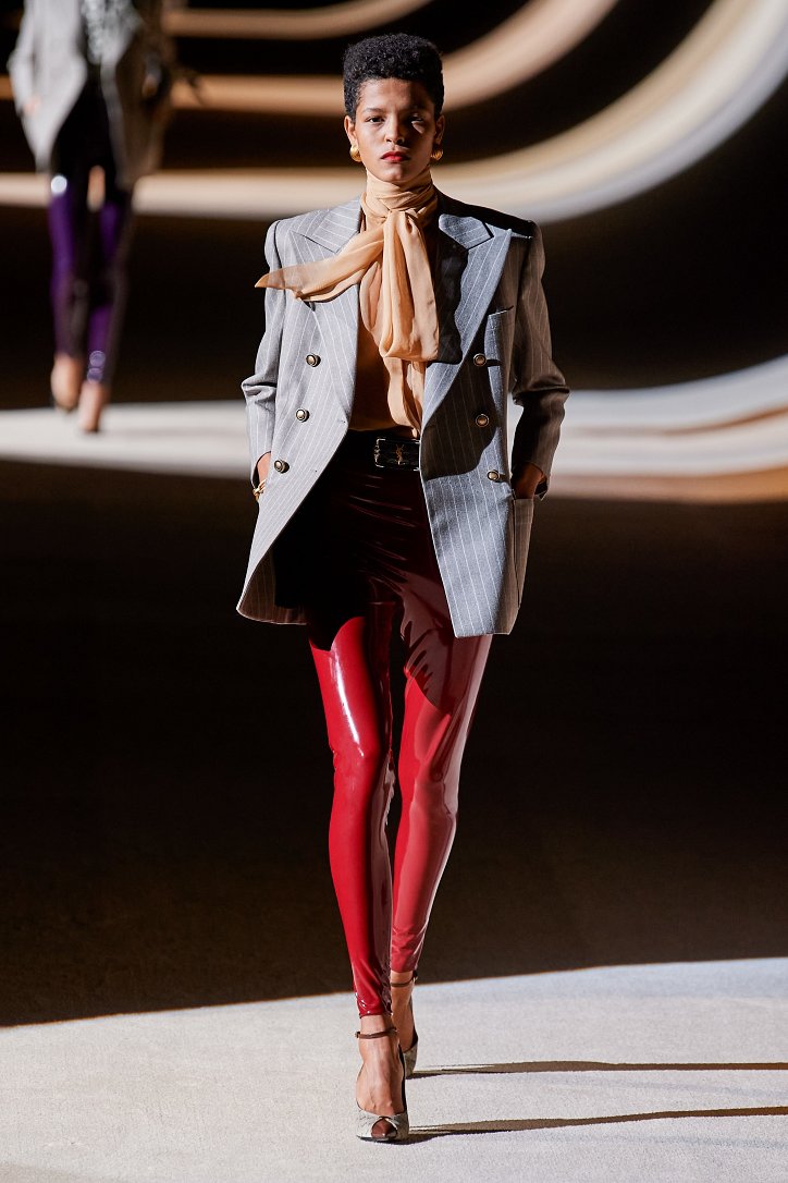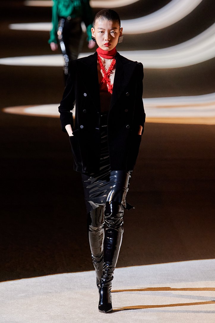 Двубортный жакет с золотыми пуговицами из черно-красного тартана – и черные лаковые лосины – это лук задал тон всей коллекции Saint Laurent, в которой строгий дресс-код плотно переплелся с чувственными и откровенными моделями в стиле dominatrix.