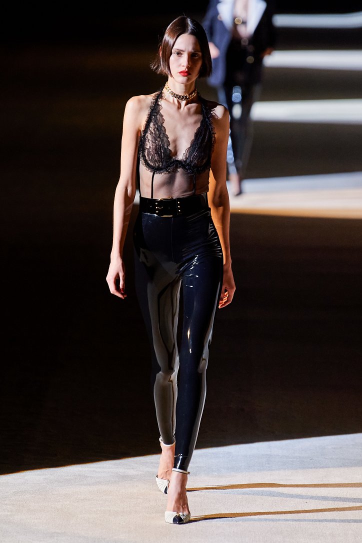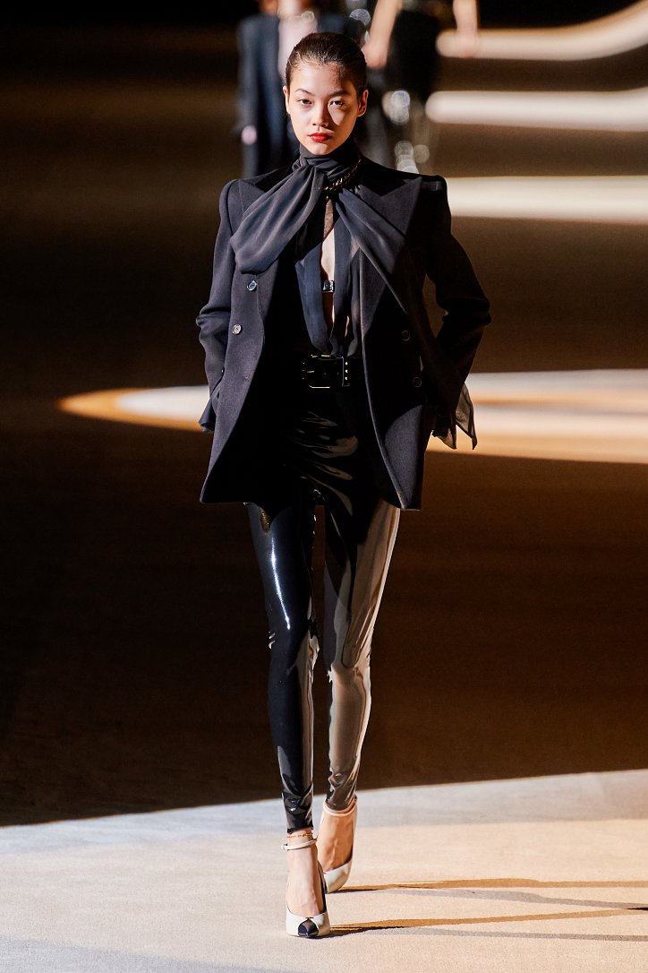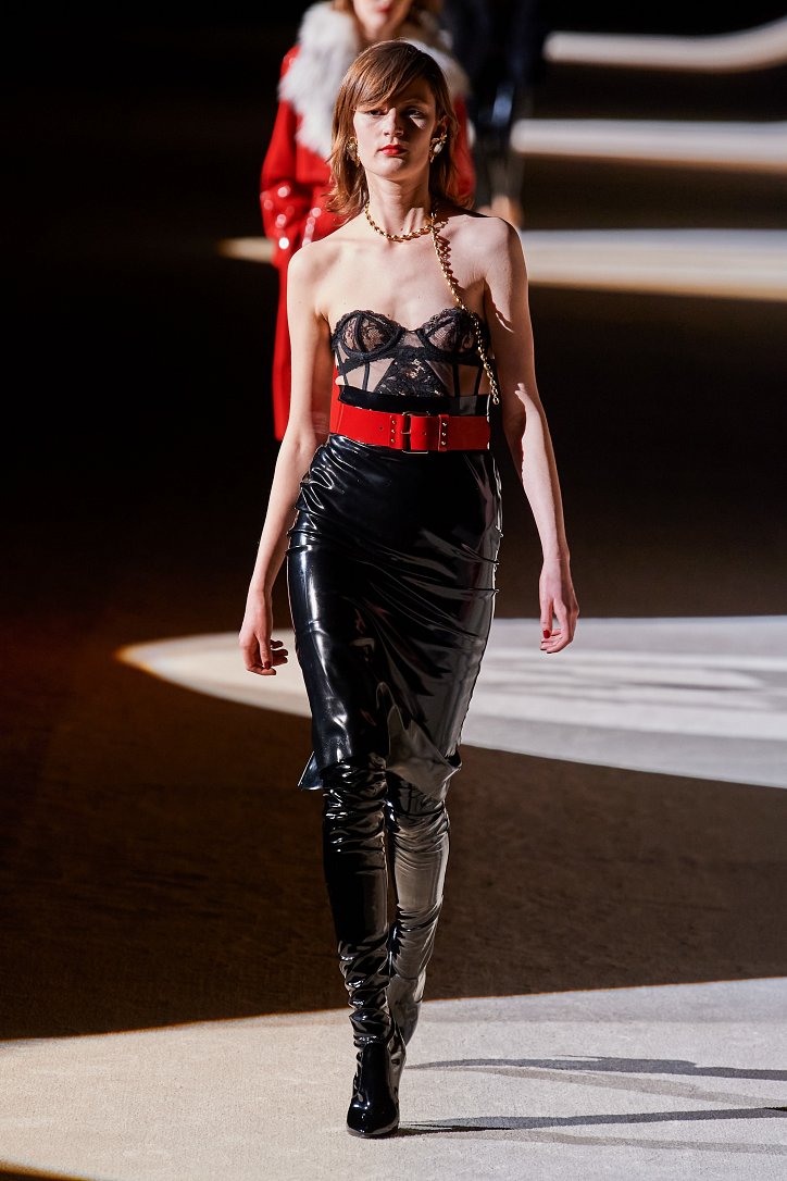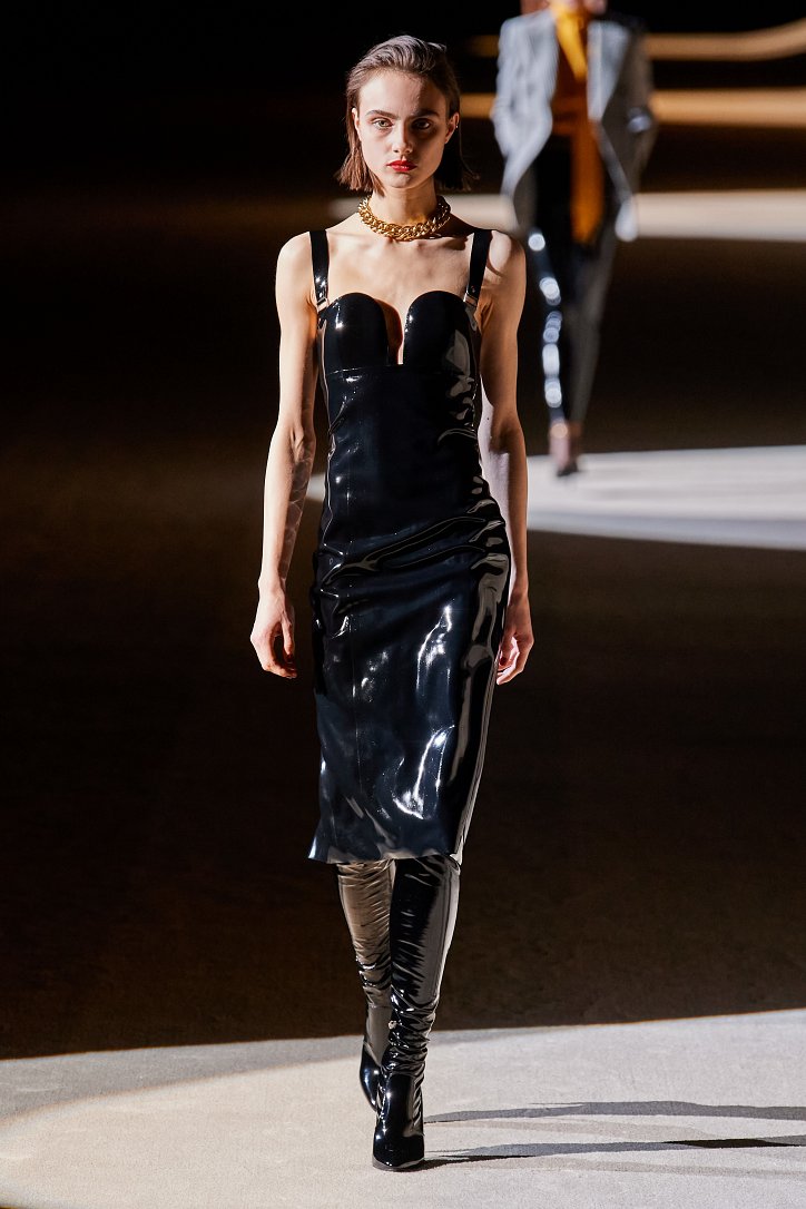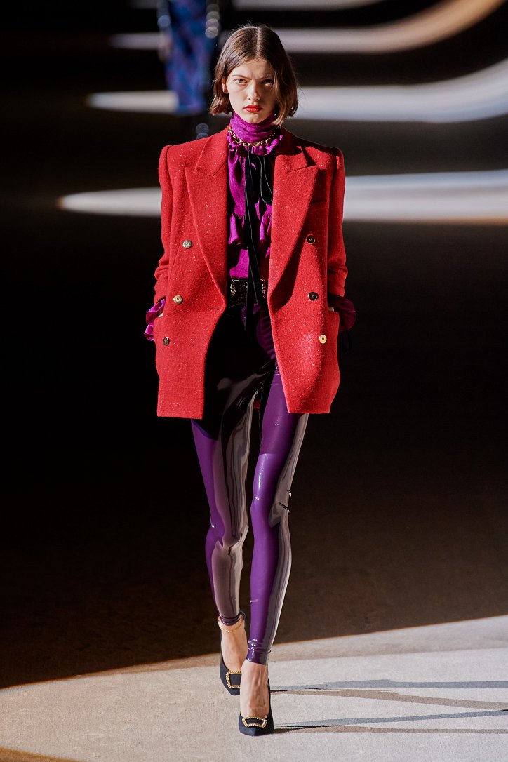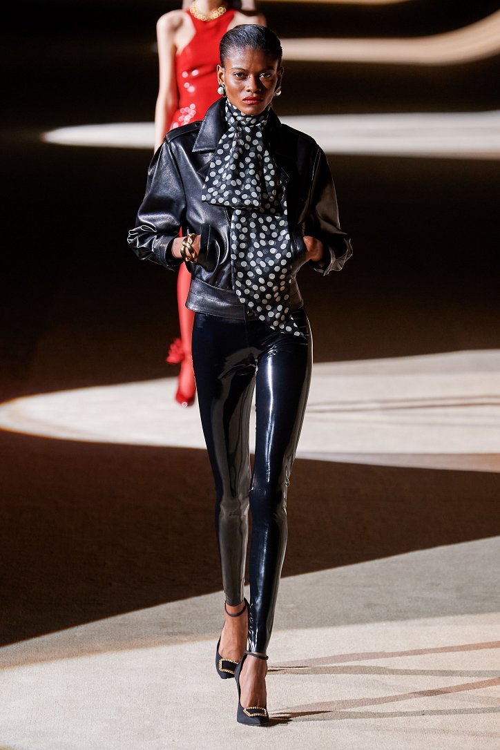 Двубортный жакет с золотыми пуговицами из черно-красного тартана – и черные лаковые лосины – это лук задал тон всей коллекции Saint Laurent, в которой строгий дресс-код плотно переплелся с чувственными и откровенными моделями в стиле dominatrix.