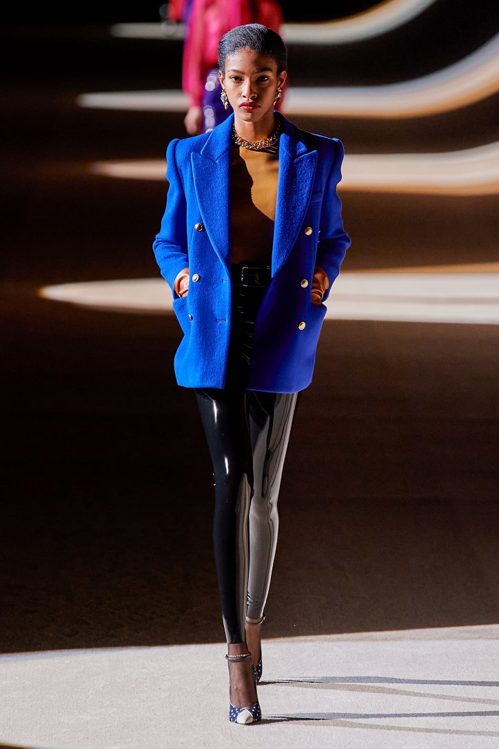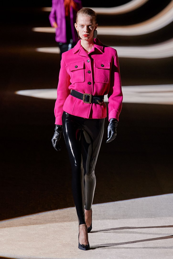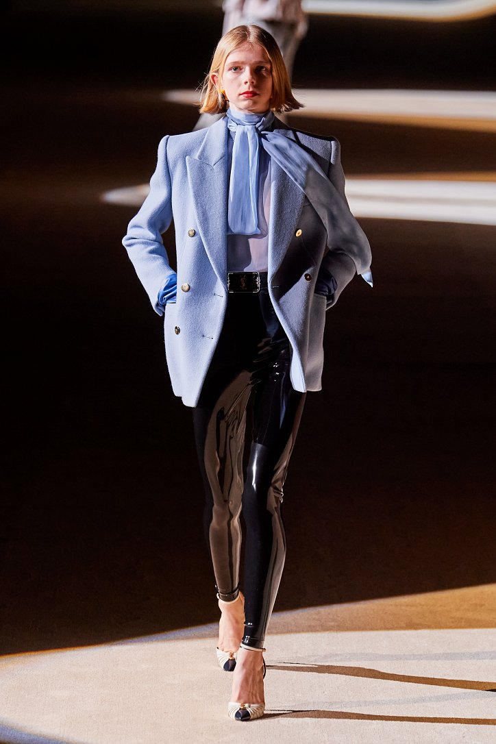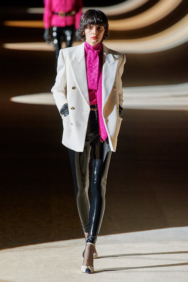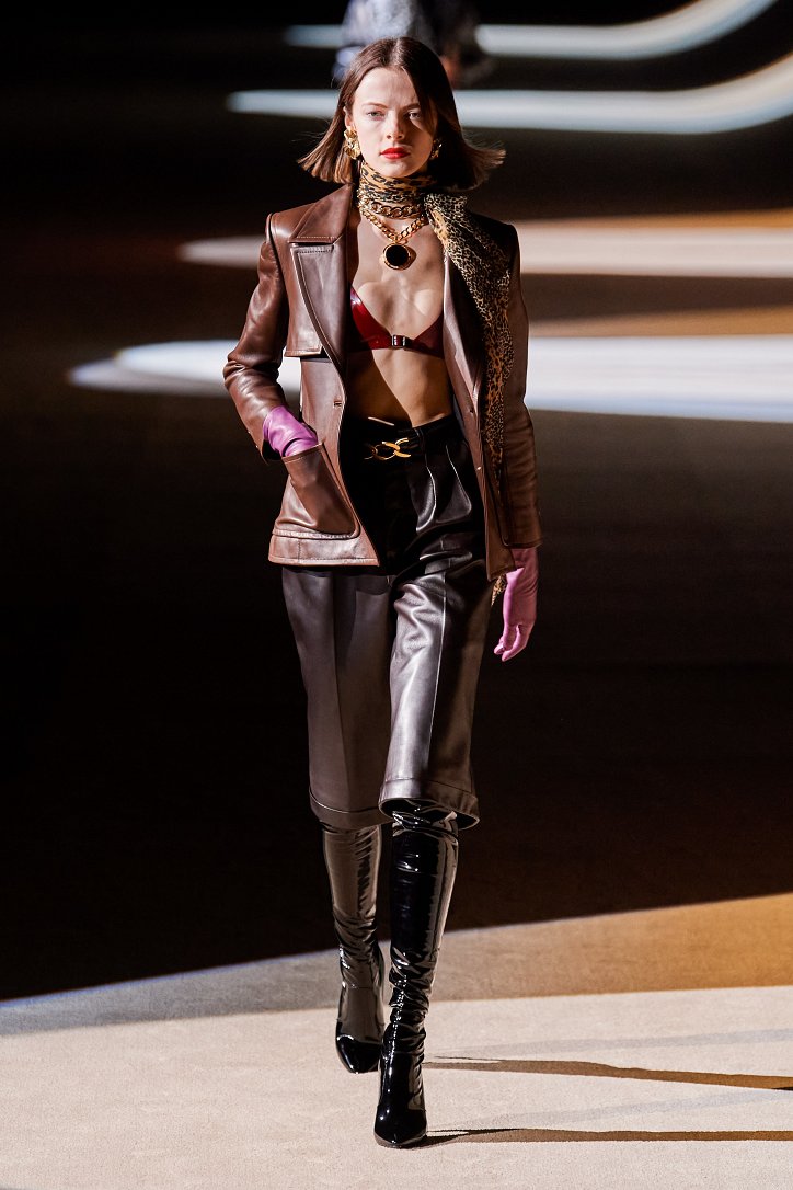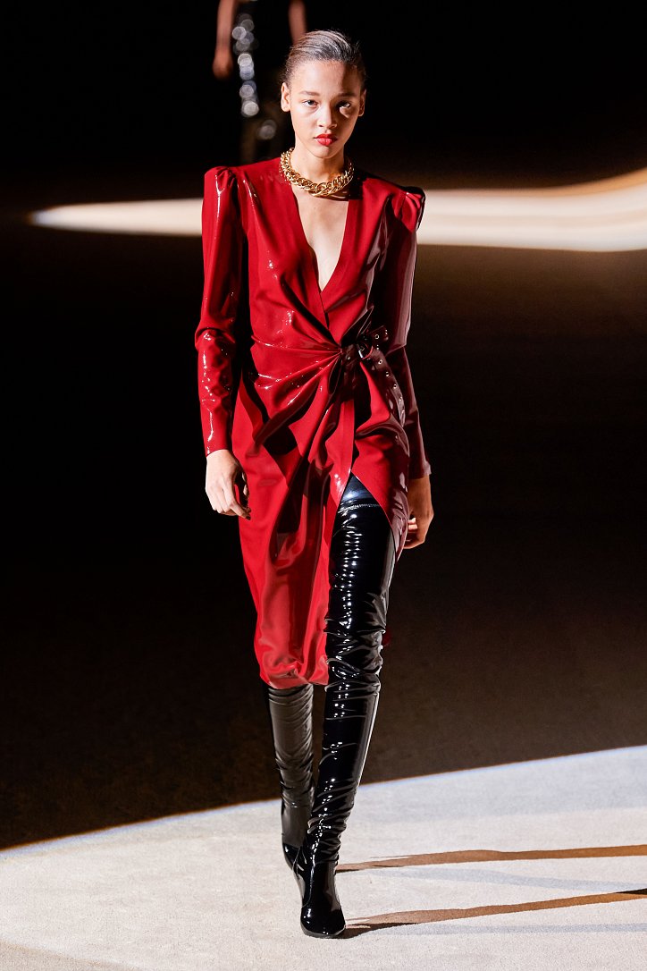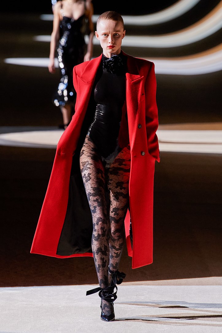 Двубортный жакет с золотыми пуговицами из черно-красного тартана – и черные лаковые лосины – это лук задал тон всей коллекции Saint Laurent, в которой строгий дресс-код плотно переплелся с чувственными и откровенными моделями в стиле dominatrix.