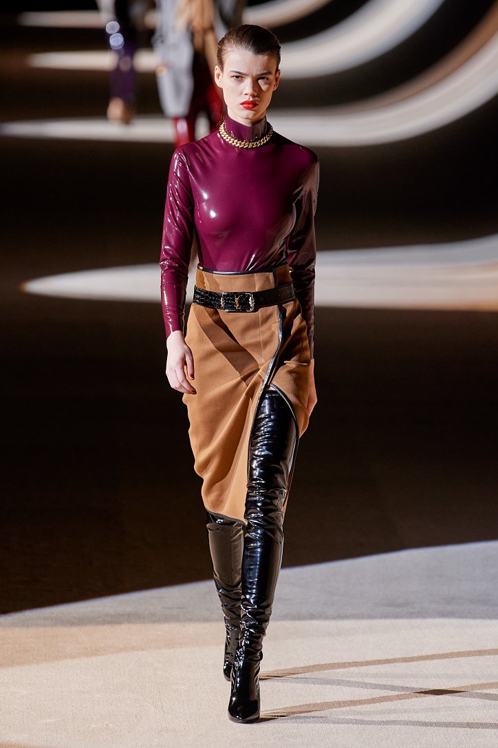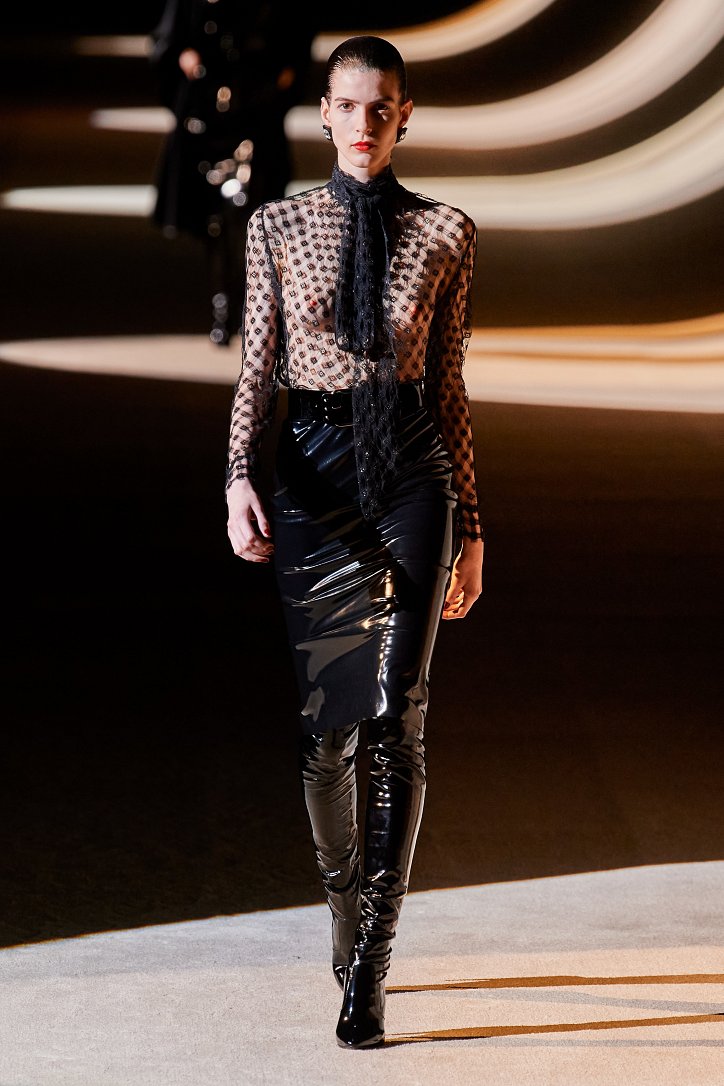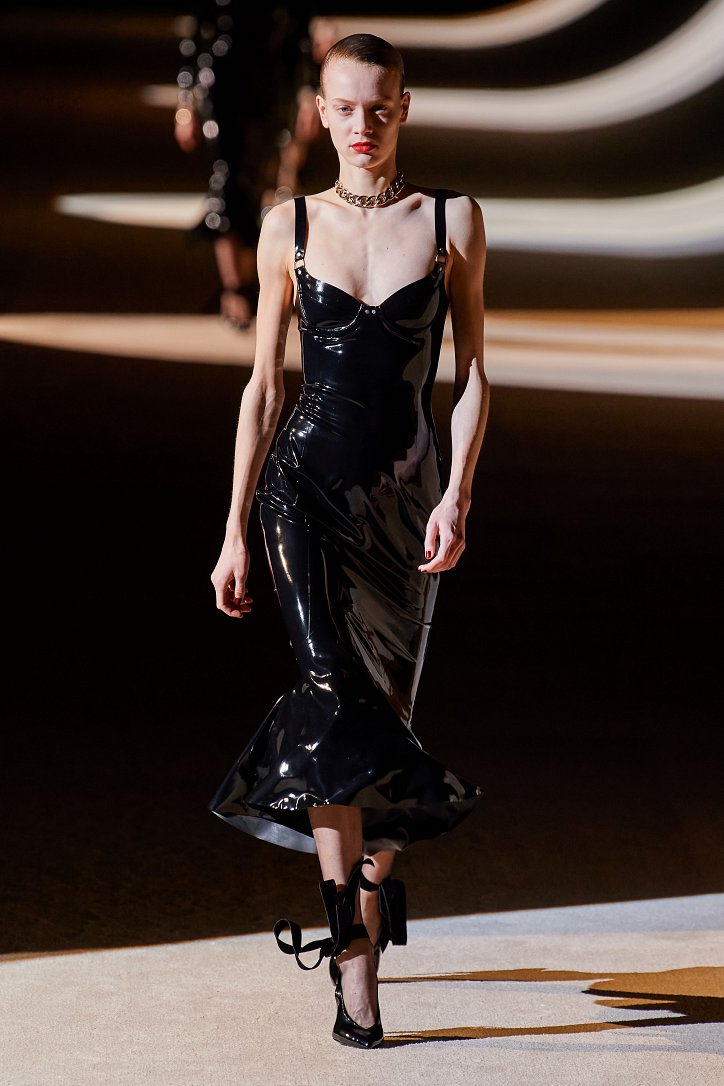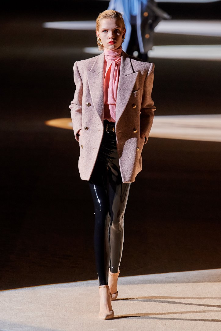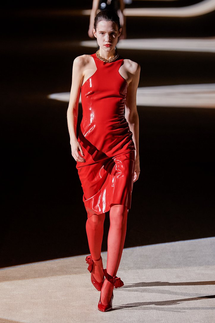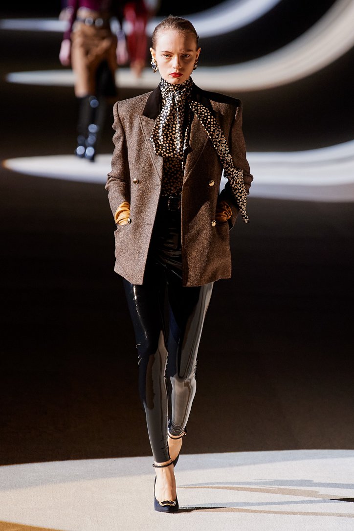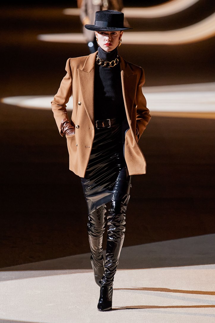 Двубортный жакет с золотыми пуговицами из черно-красного тартана – и черные лаковые лосины – это лук задал тон всей коллекции Saint Laurent, в которой строгий дресс-код плотно переплелся с чувственными и откровенными моделями в стиле dominatrix.