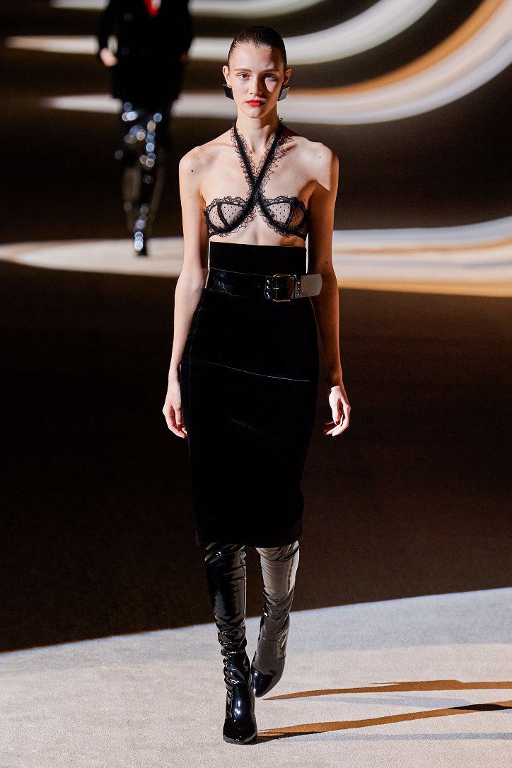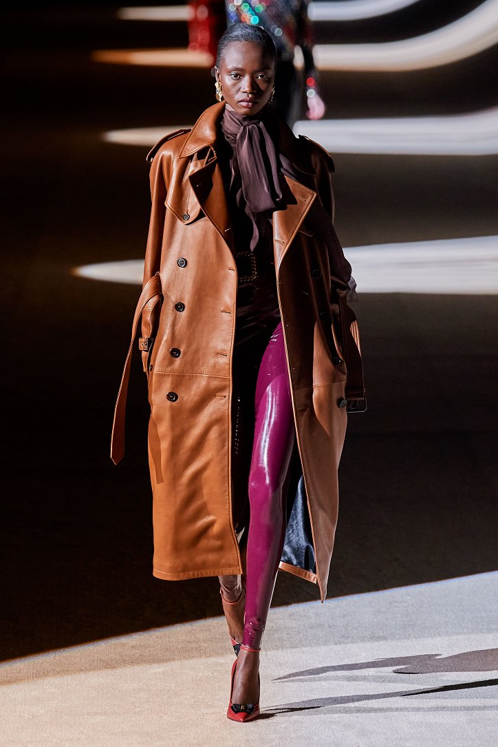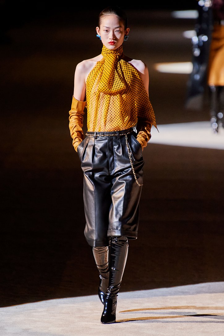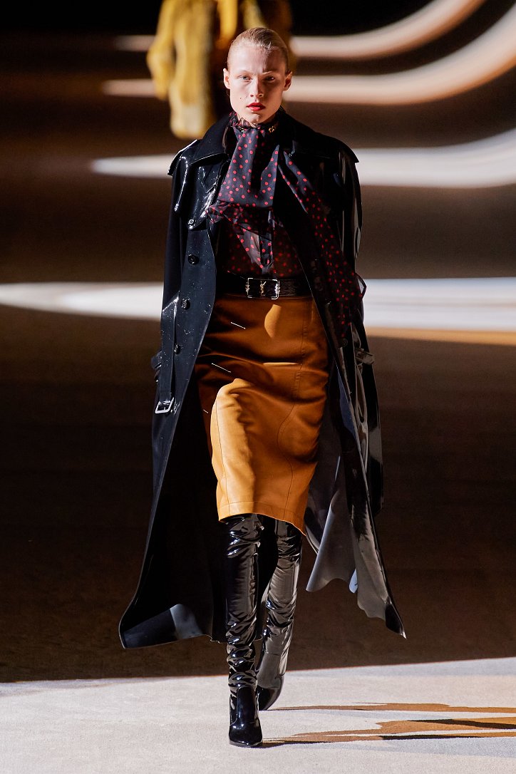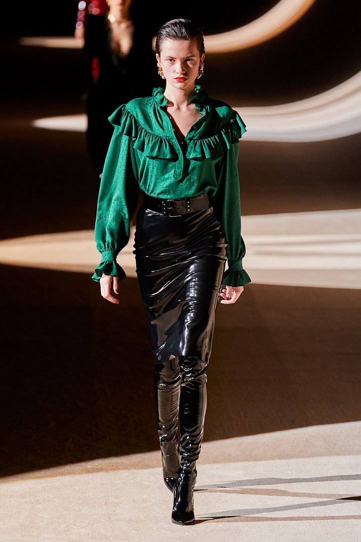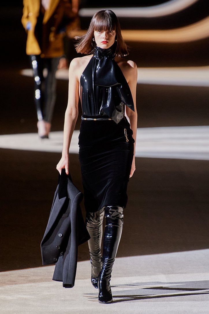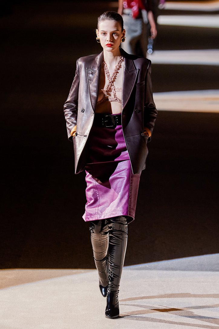Двубортный жакет с золотыми пуговицами из черно-красного тартана – и черные лаковые лосины – это лук задал тон всей коллекции Saint Laurent, в которой строгий дресс-код плотно переплелся с чувственными и откровенными моделями в стиле dominatrix.