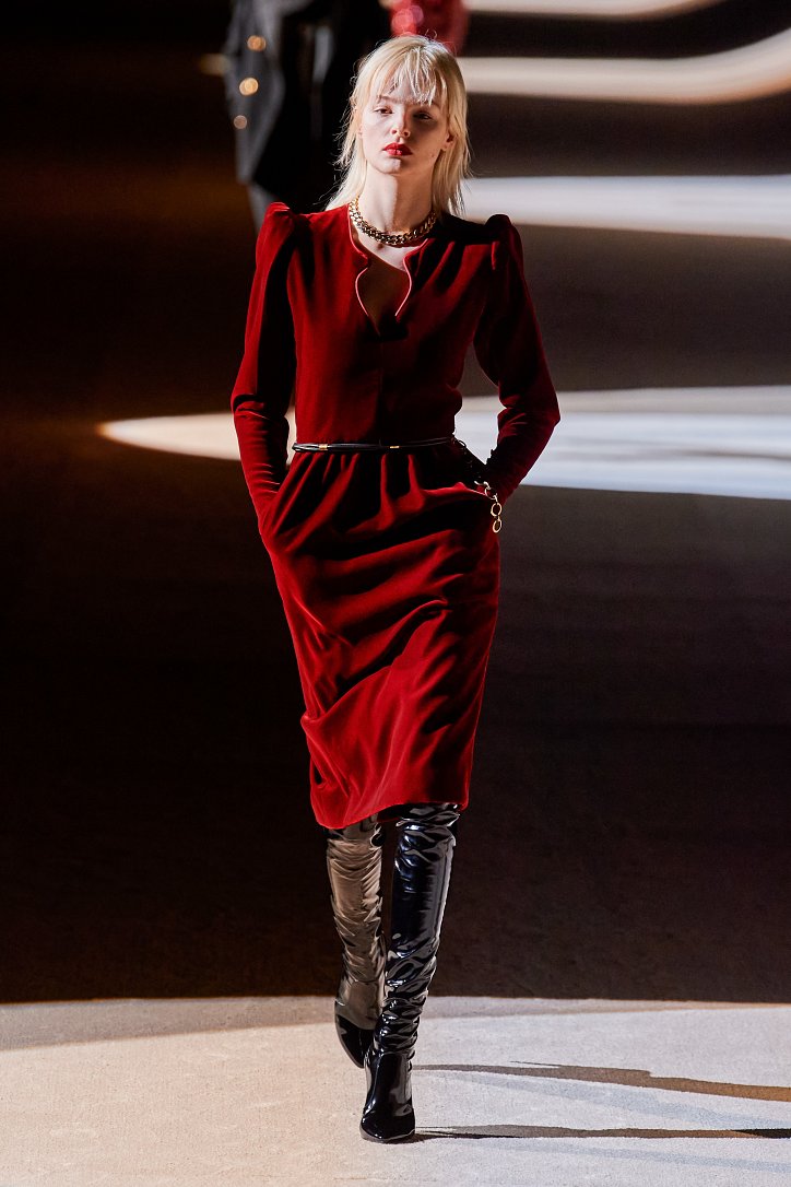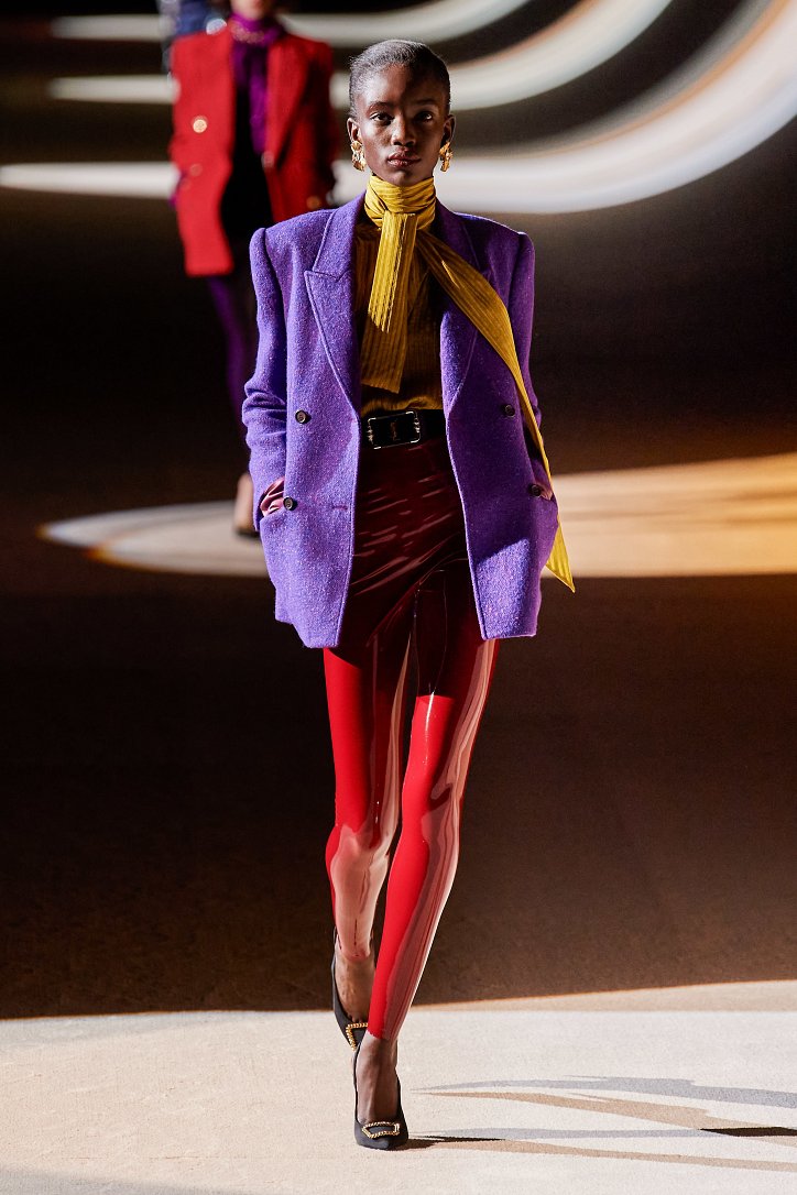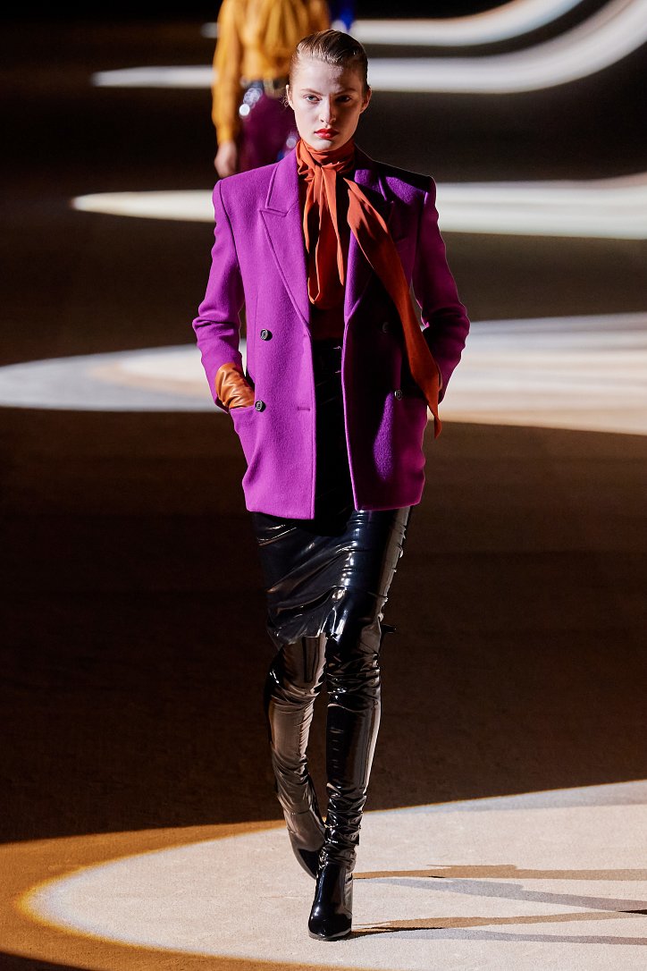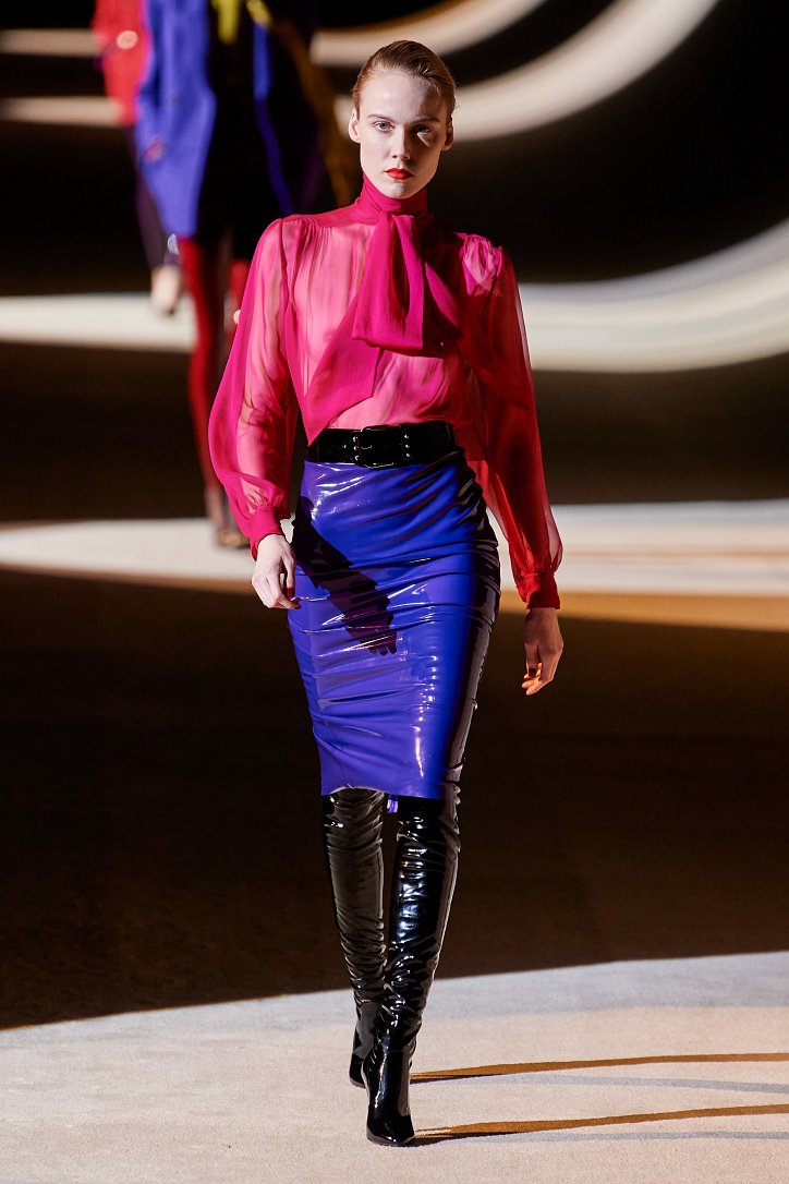 Что же касается цветовой гаммы коллекции, то, словно отвечая на упреки в засилье черного, дизайнер продемонстрировал традиционную палитру дома моды Saint Laurent, в которую вошли красный, синий, лиловый, изумрудно-зеленый, горчичный, оттенки фуксии и бордо.