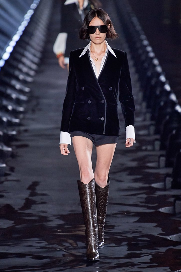 Шоу условно делилось надвое. Вначале дизайнер предложил повседневный гардероб: короткие шорты из кожи и «костюмки», джинсовые бермуды, жакеты и платья-пиджаки, белые блузы и рубашки - все это нужно носить непременно с высокими сапогами. На шортах был сделан особый акцент – именно им отводится ведущая роль в будущем сезоне.