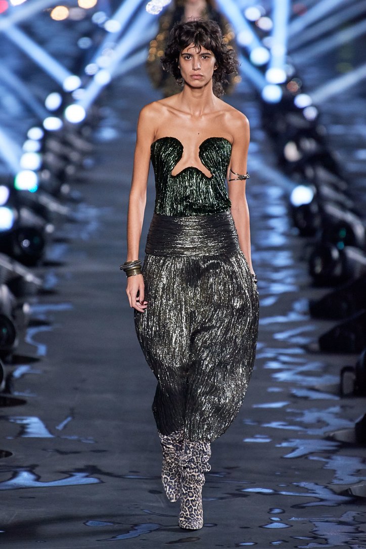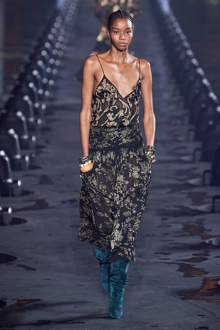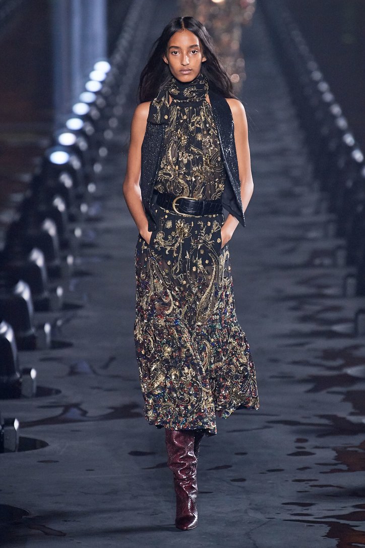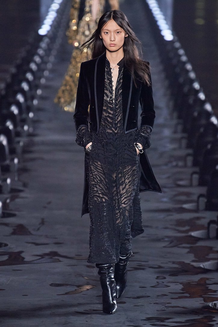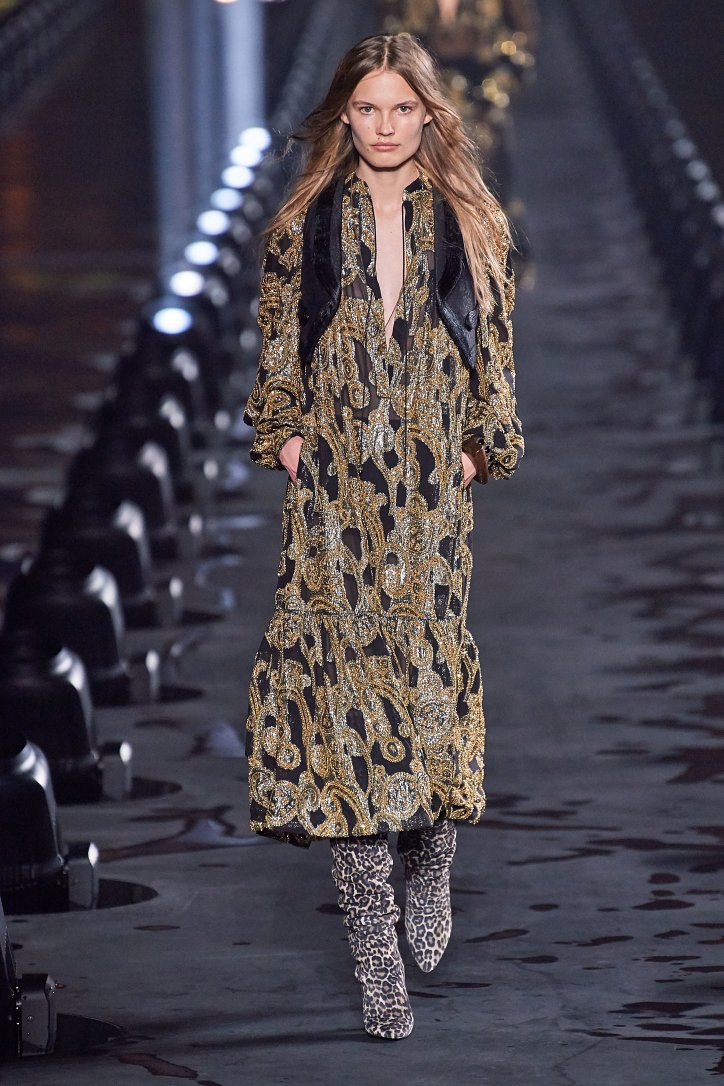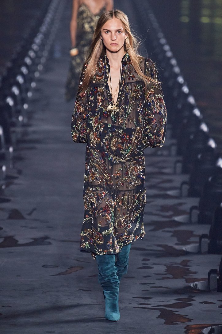 Вторая часть была выполнена в стиле hippy-glam. Позолоченная вышивка и блеск пайеток, бархат и люрекс, смокинги и тюрбаны, роскошные платья и костюмы – все это служило напоминанием о коллекции YSL 1976 года.