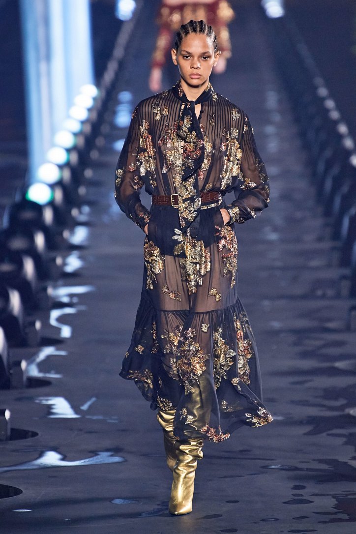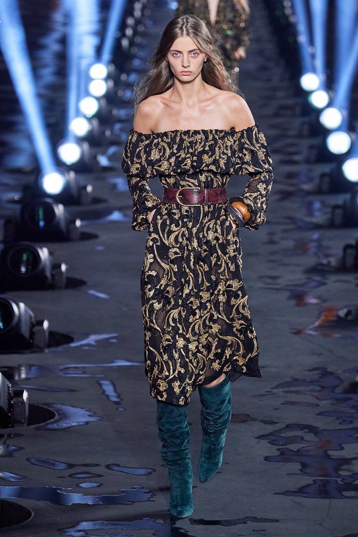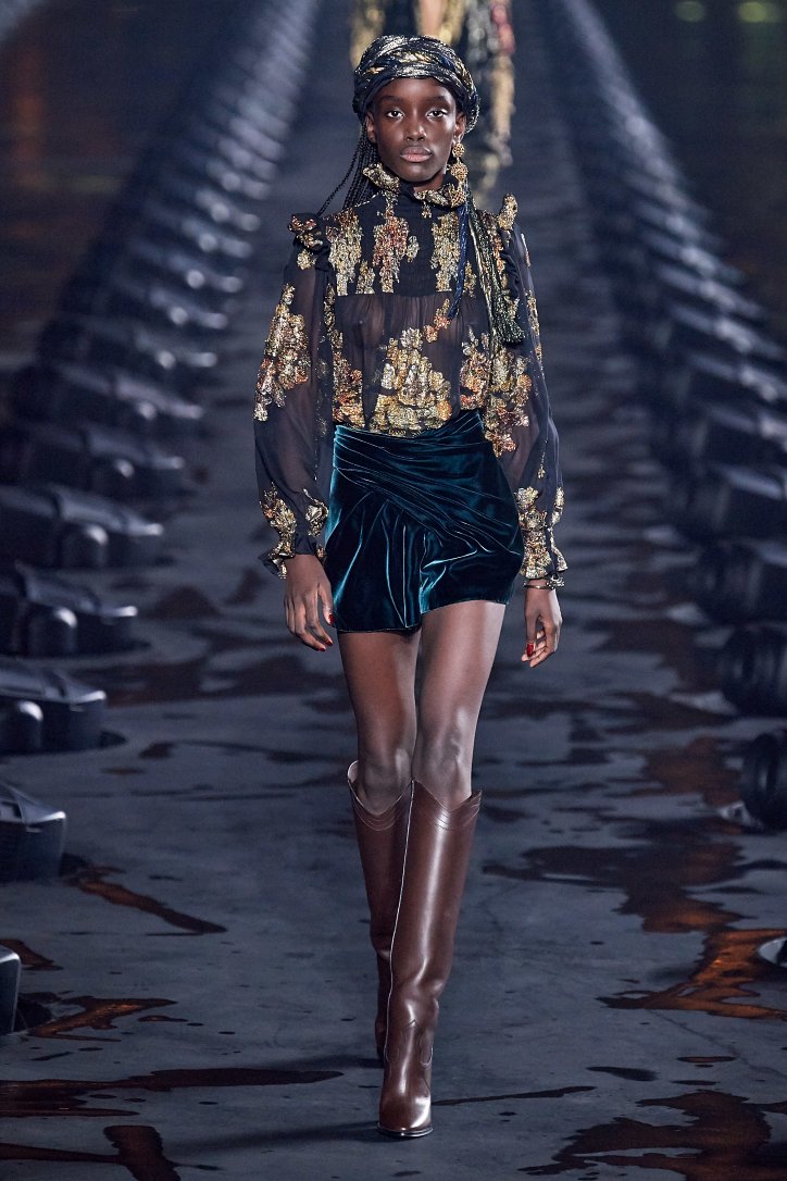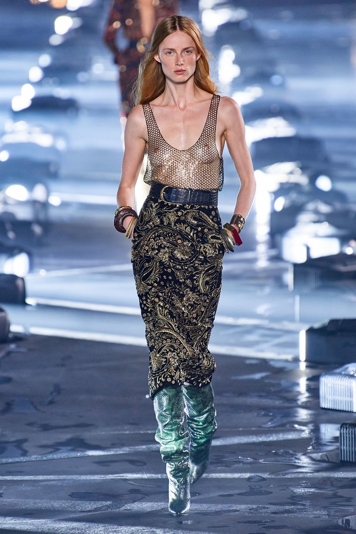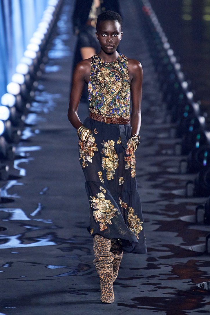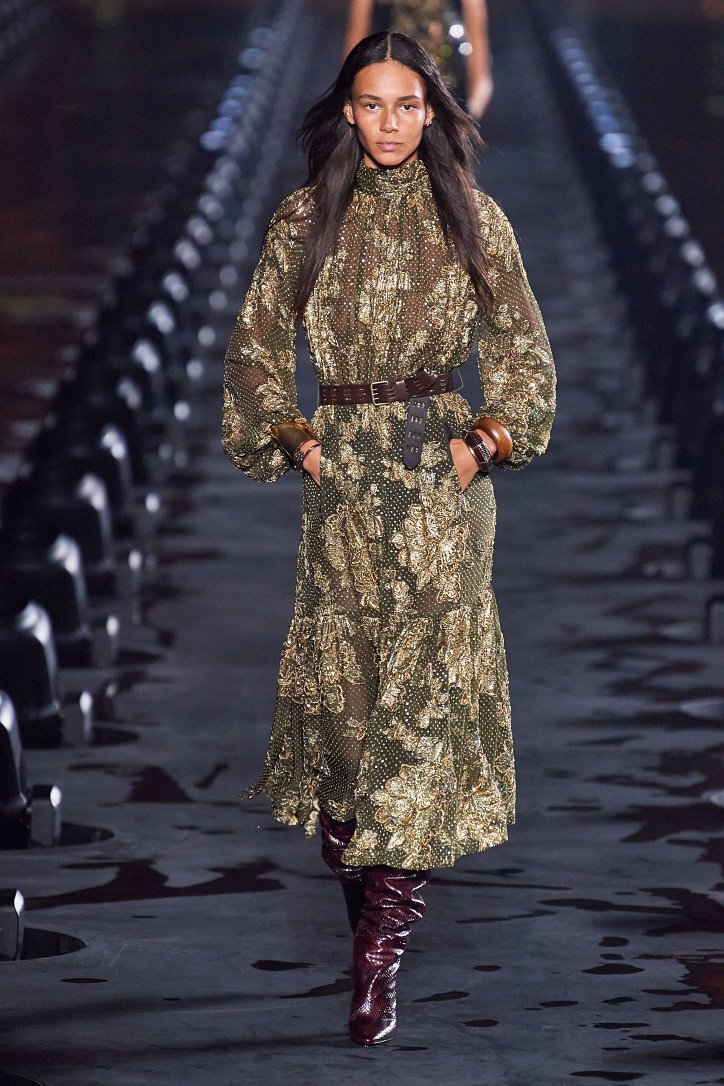 Вторая часть была выполнена в стиле hippy-glam. Позолоченная вышивка и блеск пайеток, бархат и люрекс, смокинги и тюрбаны, роскошные платья и костюмы – все это служило напоминанием о коллекции YSL 1976 года.