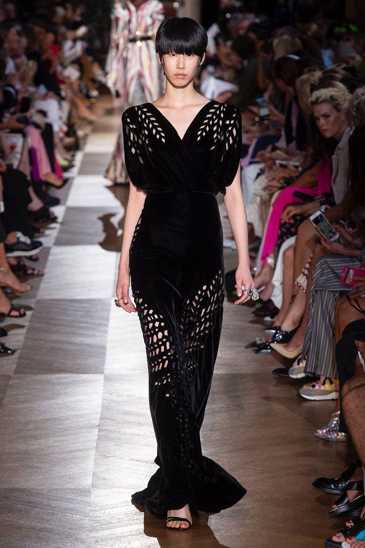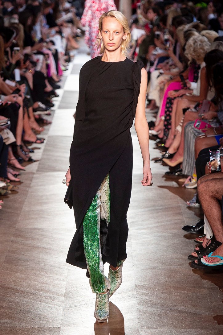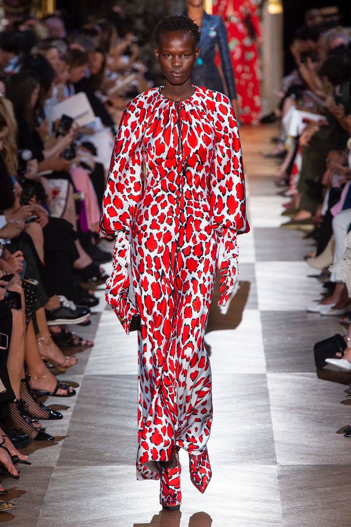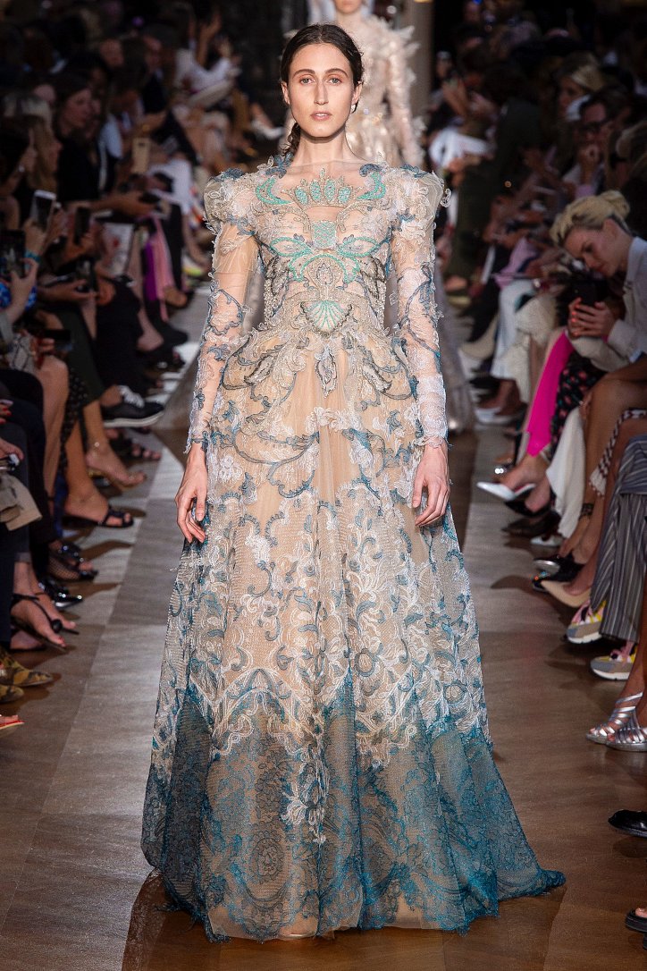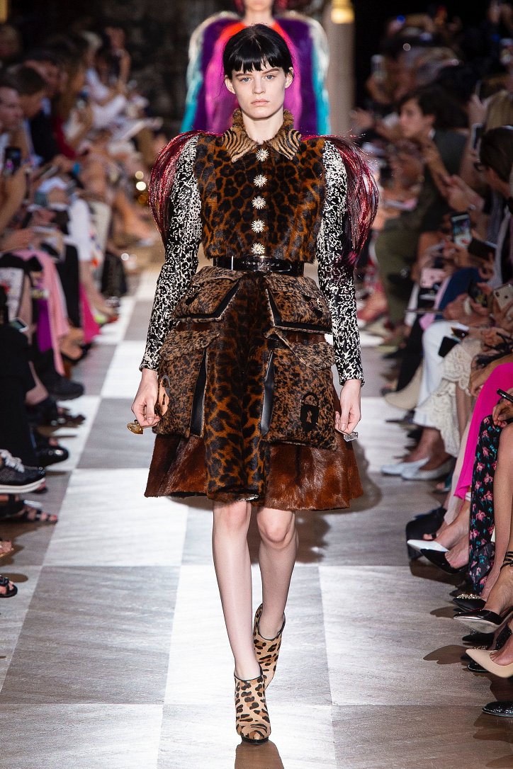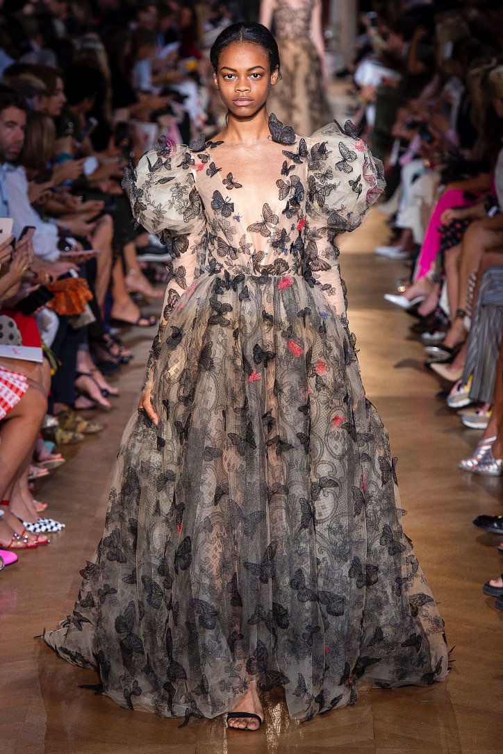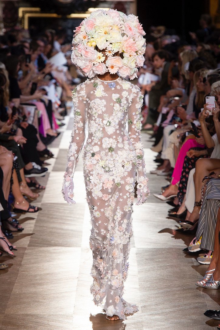 Модели дефилировали по подиуму в роскошных длинных платьях, украшенных вышивкой, «порхающими» бабочками и анималистическими принтами. Но фурор произвели даже не платья, а маски – в виде бабочек, зайцев, пары фламинго, кошки с крыльями, цветочного «шлема» и любимого щенка Эльзы.
