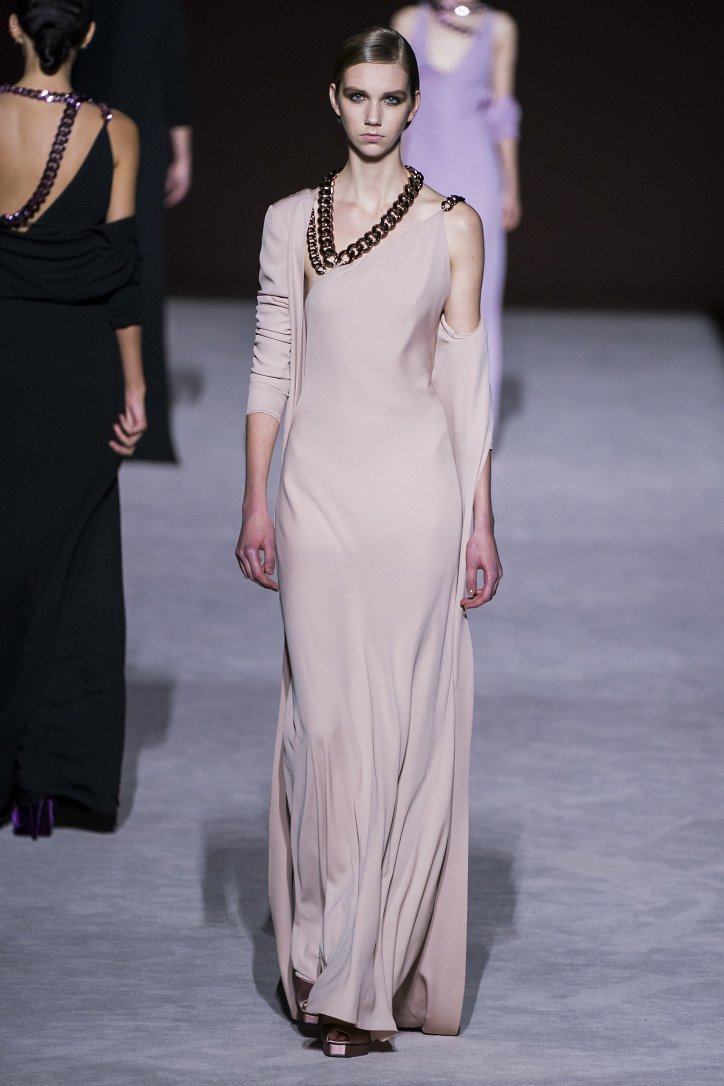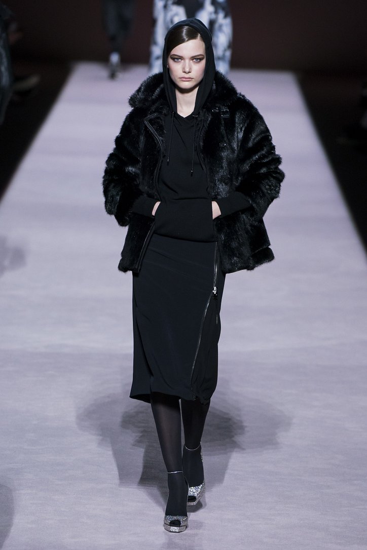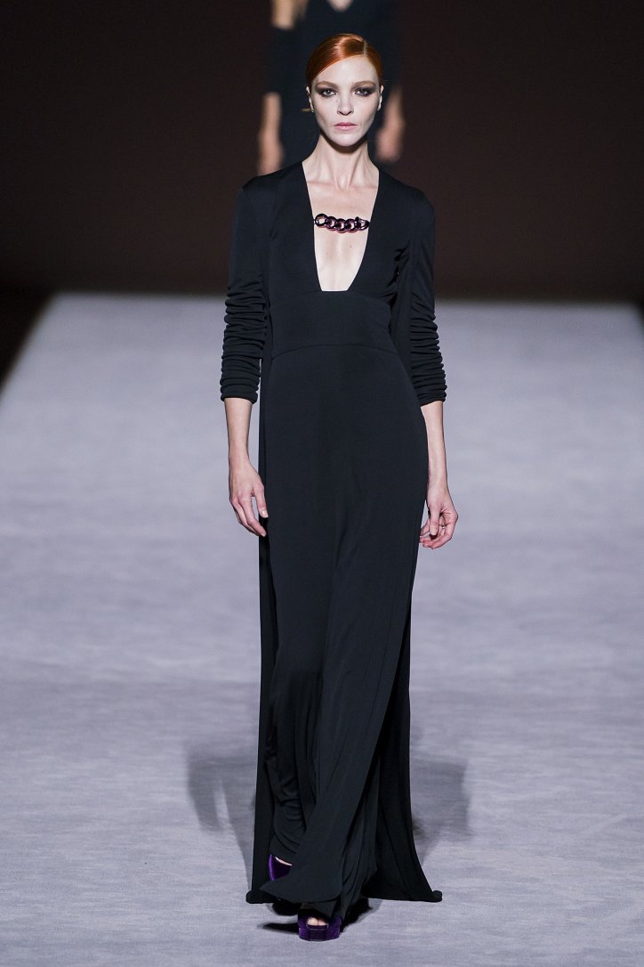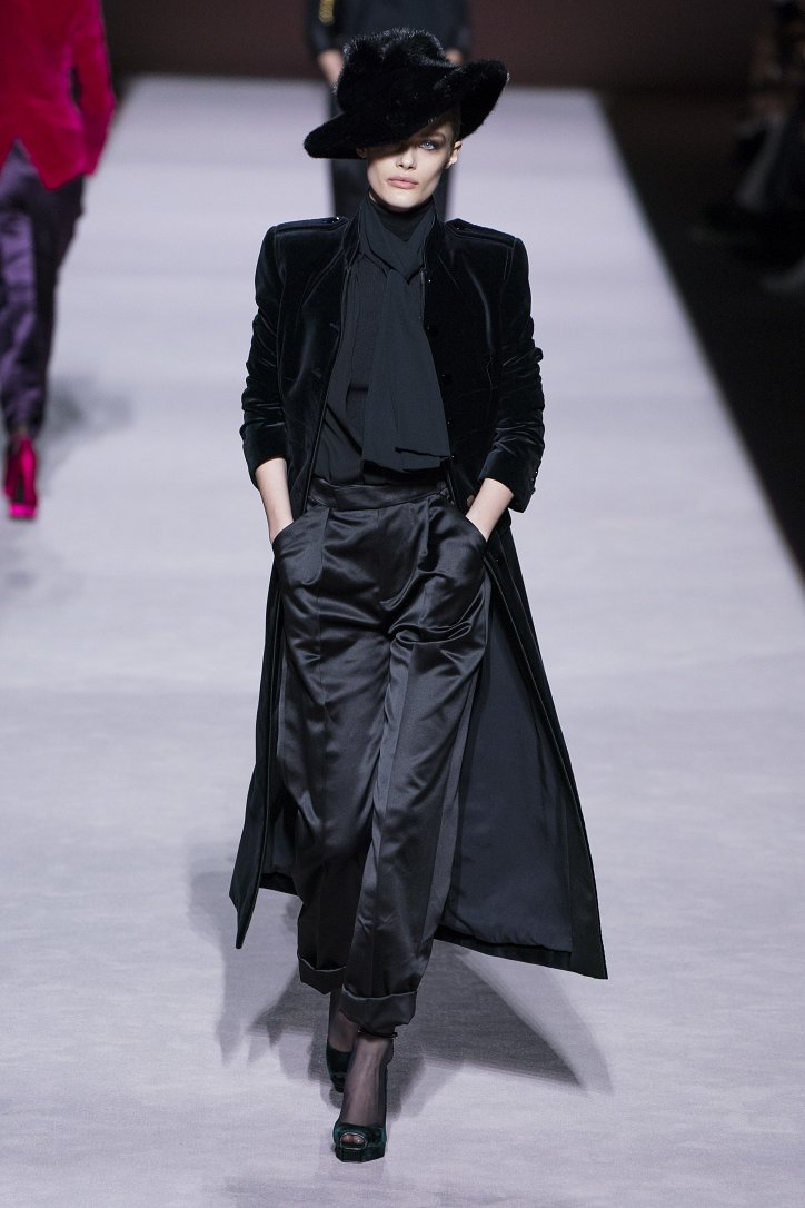 Ставку дизайнер решил сделать на глубокие оттенки и благородно мерцающие ткани. Вместо кожи, дерзких мини и хищных принтов он предложил рубашки свободного кроя и атласные брюки со стрелками и подвернутыми штанинами, меховые шляпы и бархатные босоножки, водолазки и классические жакеты, струящиеся вечерние платья и шубы из искусственного меха – на смену агрессивной сексуальности пришла мягкая чувственность.