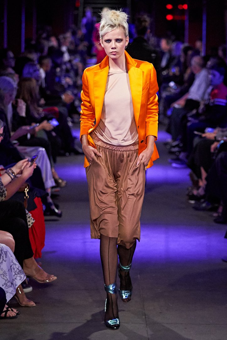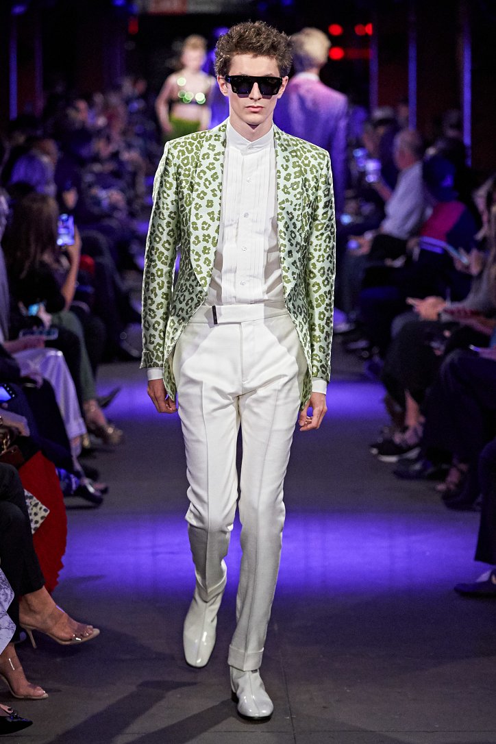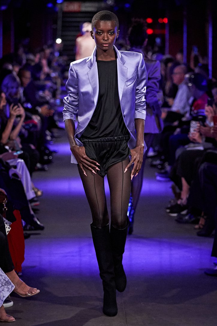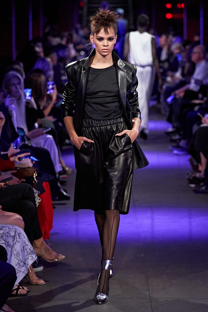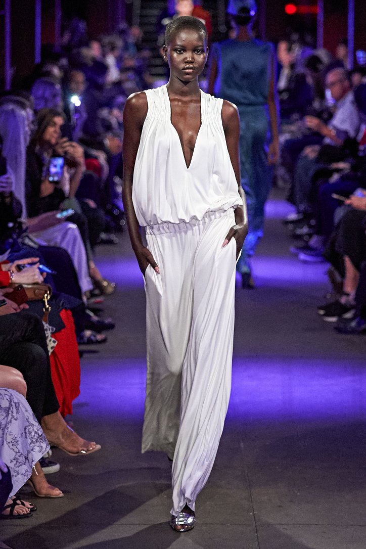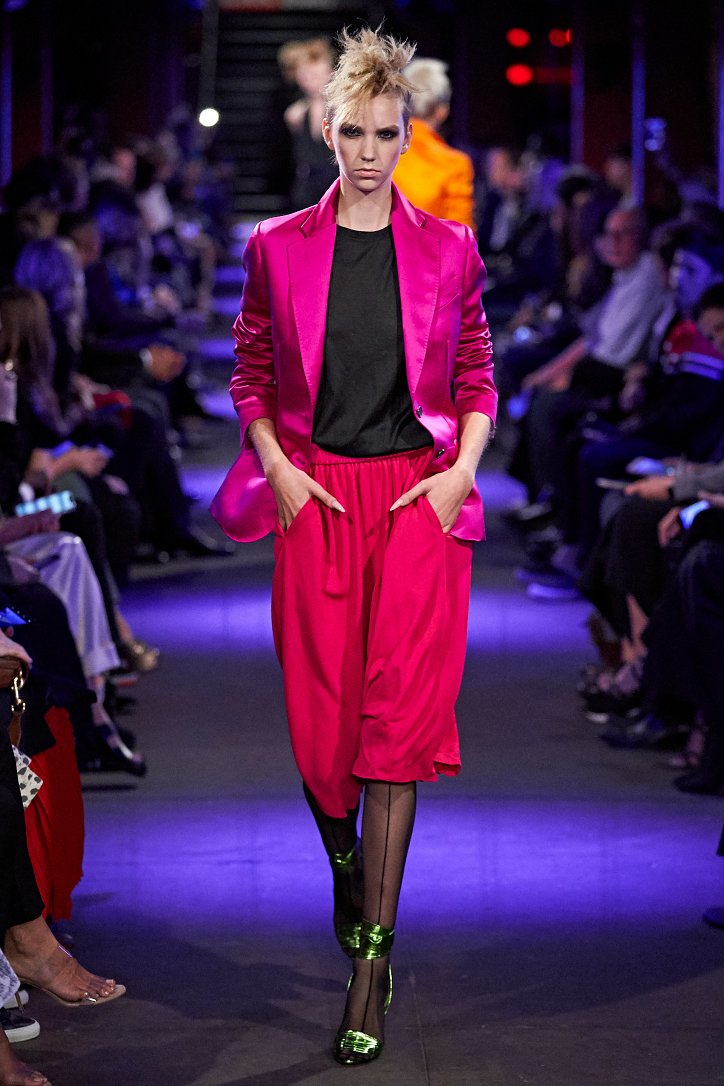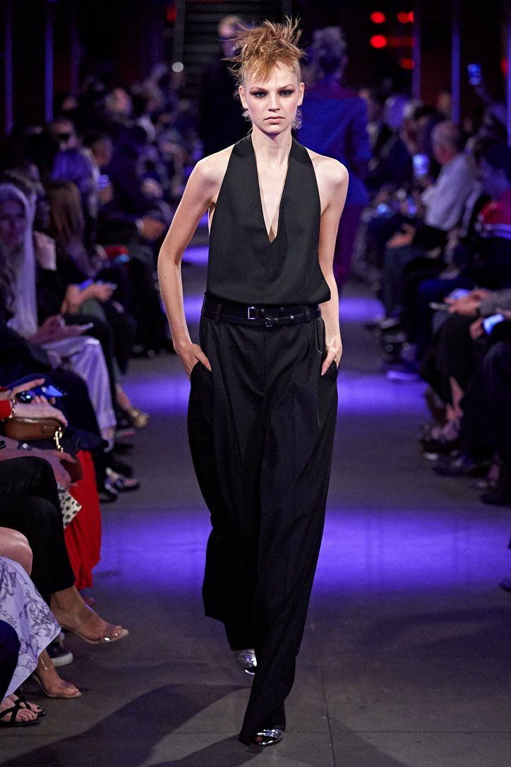 Итак, почти в полной темноте, на подсвеченном электрическим светом подиуме модели демонстрировали всевозможные версии футболок и шорт, которые великолепно сочетались с «фирменной» роскошный одеждой бренда: атласными жакетами, блестящими топами и юбками-макси из сатин-дюшеса.