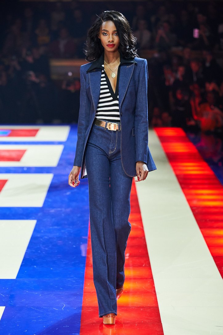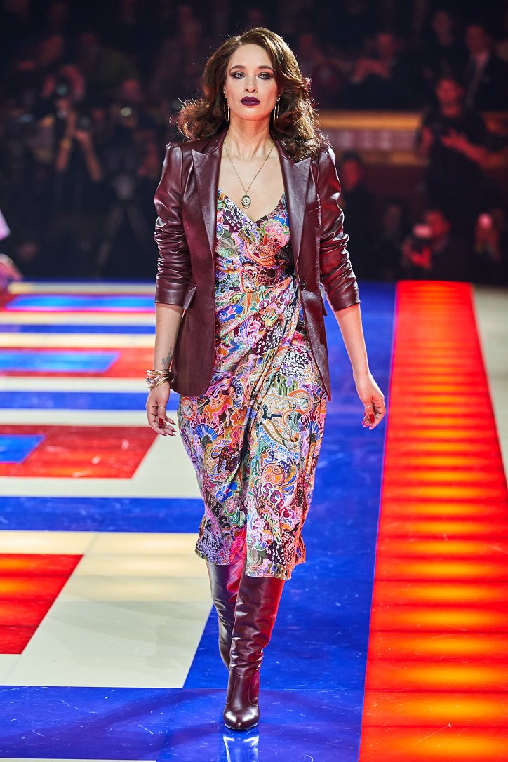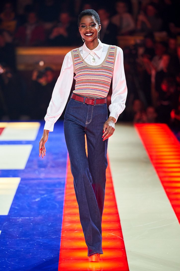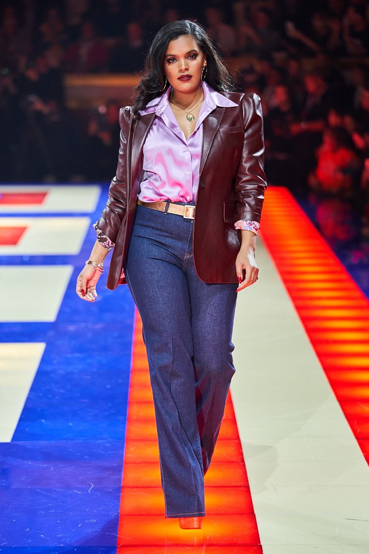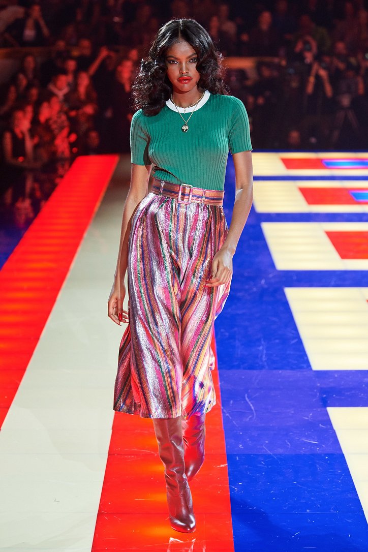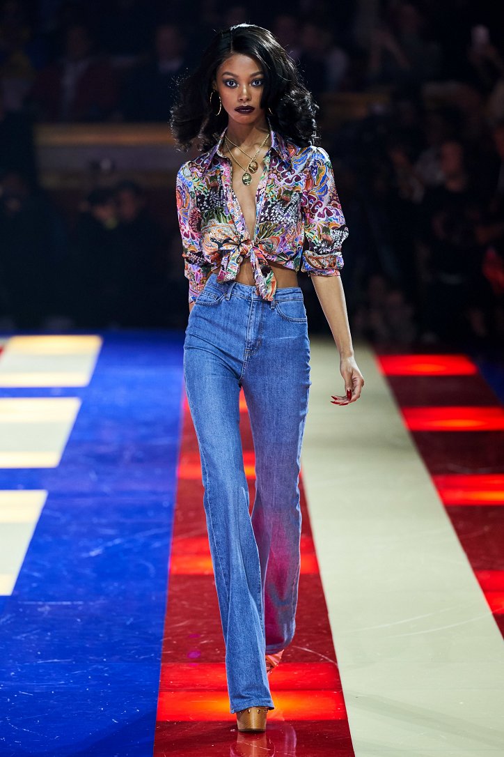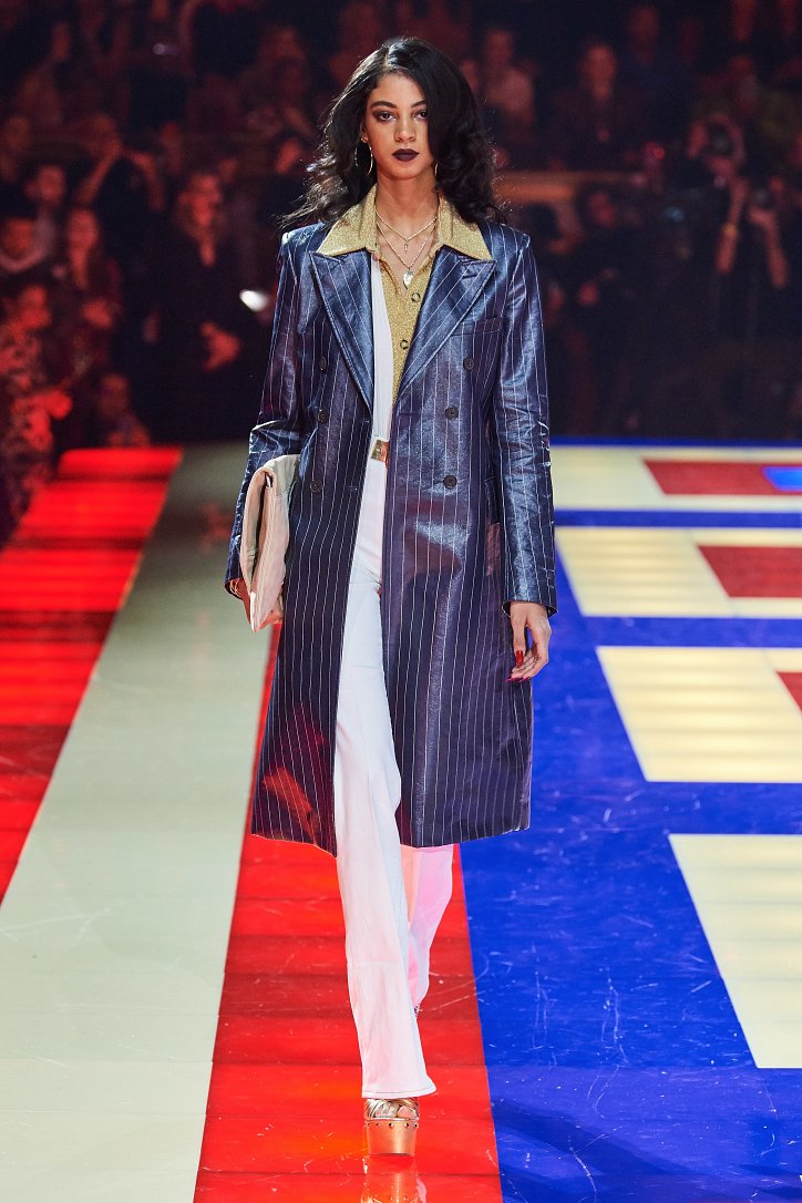 Деним и люрекс, брюки клеш и полосатый трикотаж, кожаные пальто и футболки-поло, клетчатые костюмы и обувь на высокой платформе – на подиуме вновь эстетика 70-ых. Новая коллекция Tommy Hilfiger, созданная американским дизайнером в сотрудничестве с певицей и актрисой Zendaya, выглядела не просто ярко – он буквально ослепляла! И не только блеском тканей: к «звездопаду» моделей сегодняшнего подиума добавили сияния и звезды эпохи семидесятых.