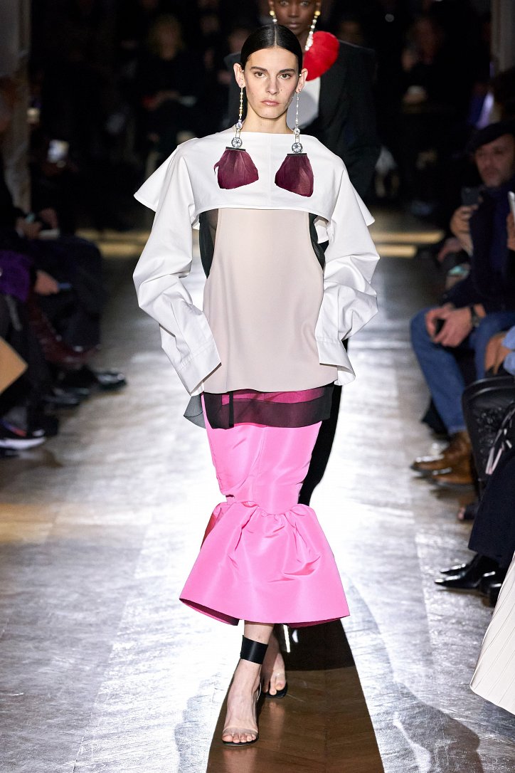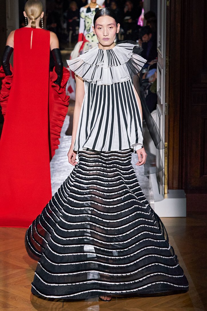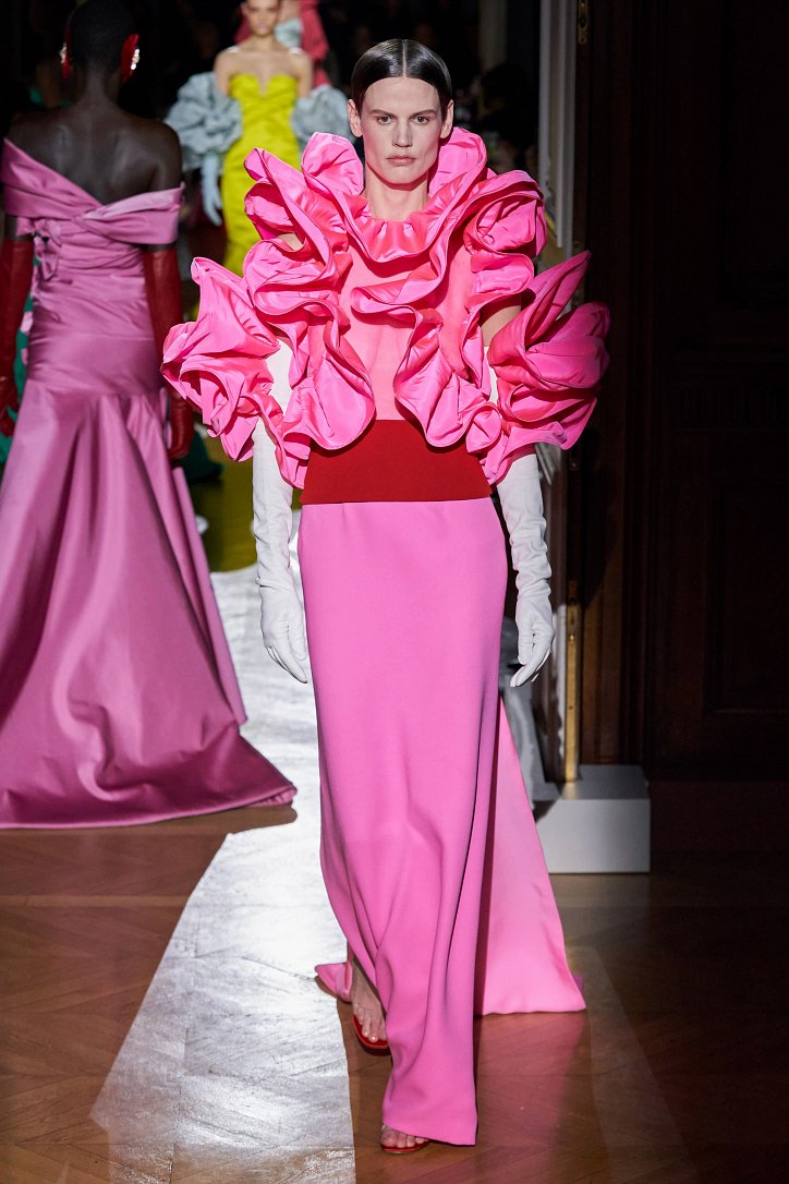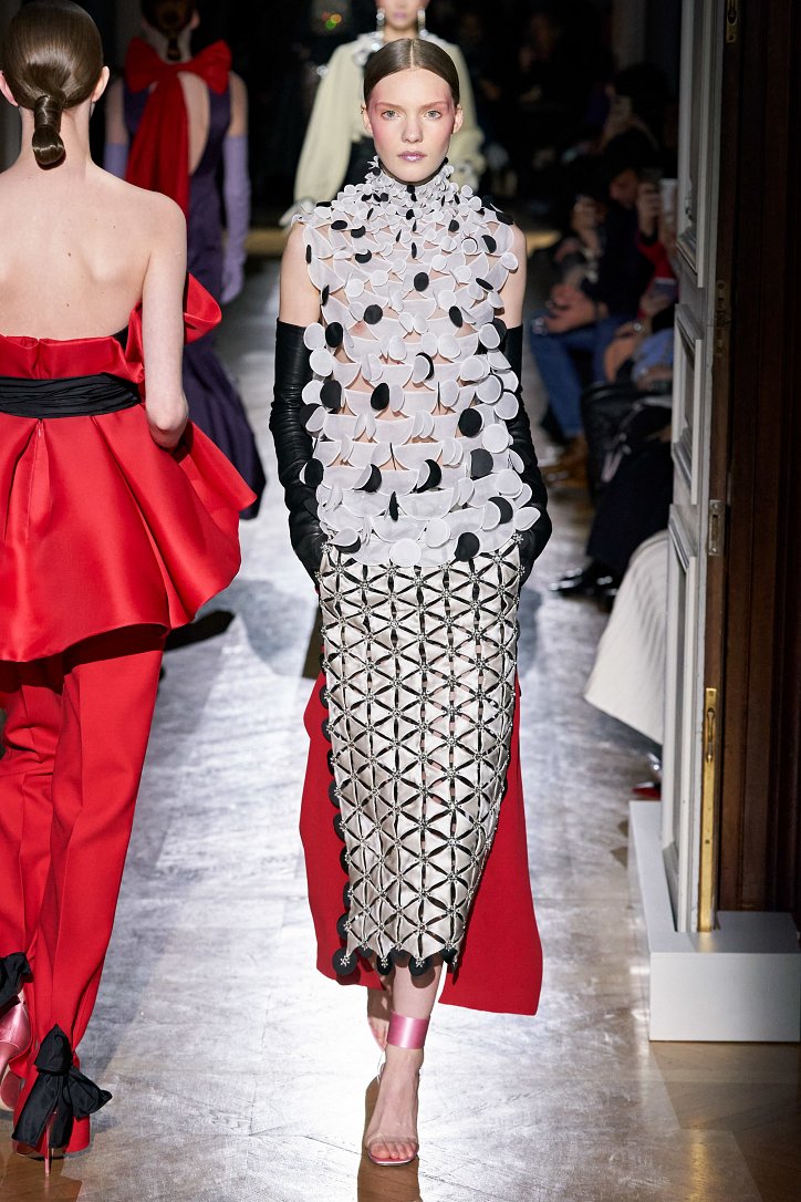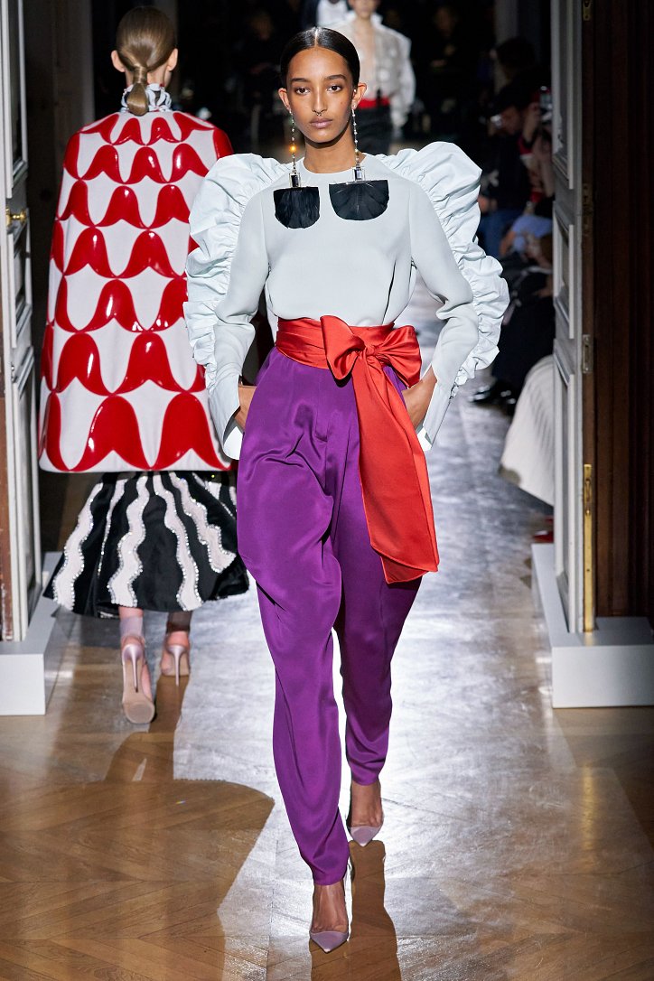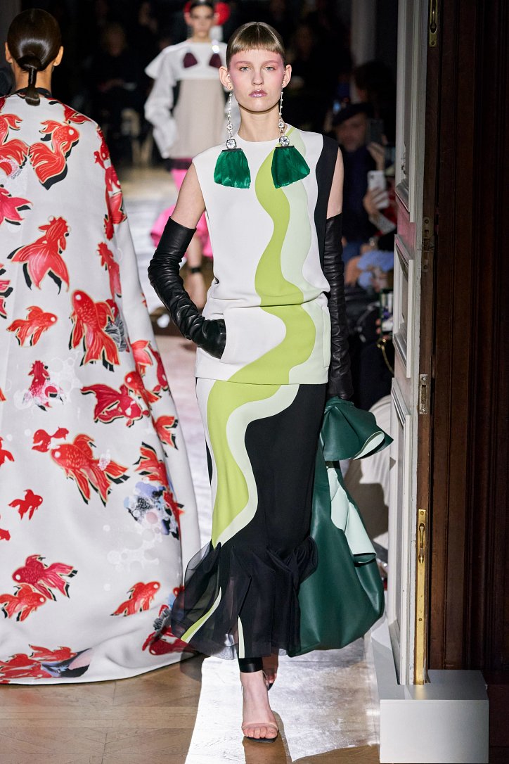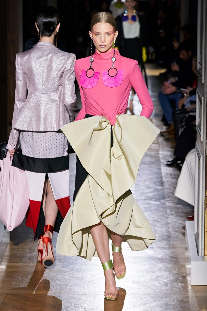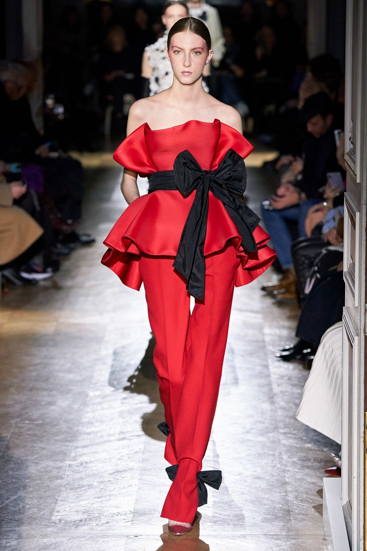 Пьерпаоло Пиччоли ищет новые силуэты. На смену уже привычными пышным платьям и объёмным силуэтам в новой коллекции Valentino пришли платья-русалки, напоминающие шаровары атласные брюки, длинные платья-бюстье с «монументальными» басками и модели с расклешенным низом. Но объем не исчез полностью – он просто изменил свою дислокацию. Пыщные банты на талии - в роли пояса, многочисленные воланы, полностью покрывающие юбку, объёмные топы, незаметно соединённые с пышными юбками – и все это в «фирменных» ярких цветах и принтах, которые уже стали визитной карточкой дома моды. Помимо главного цвета Valentino – красного – в палитру коллекции дизайнер включил оттенки фиолетового, шартрез, розовый, мятный, синий и, конечно же, черный и белый – свобода самовыражения «по Пиччоли» всегда окрашена в яркие и смелые краски.