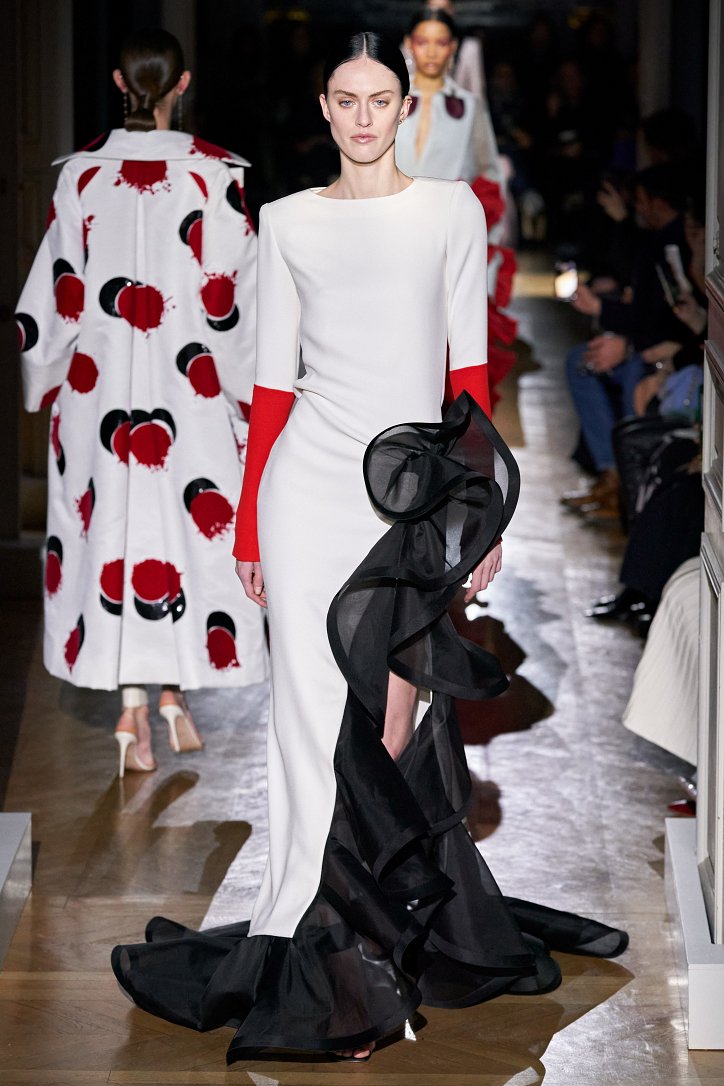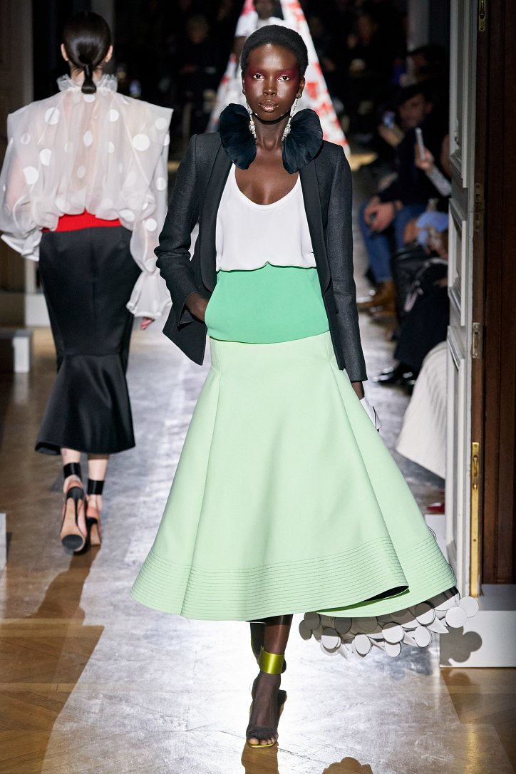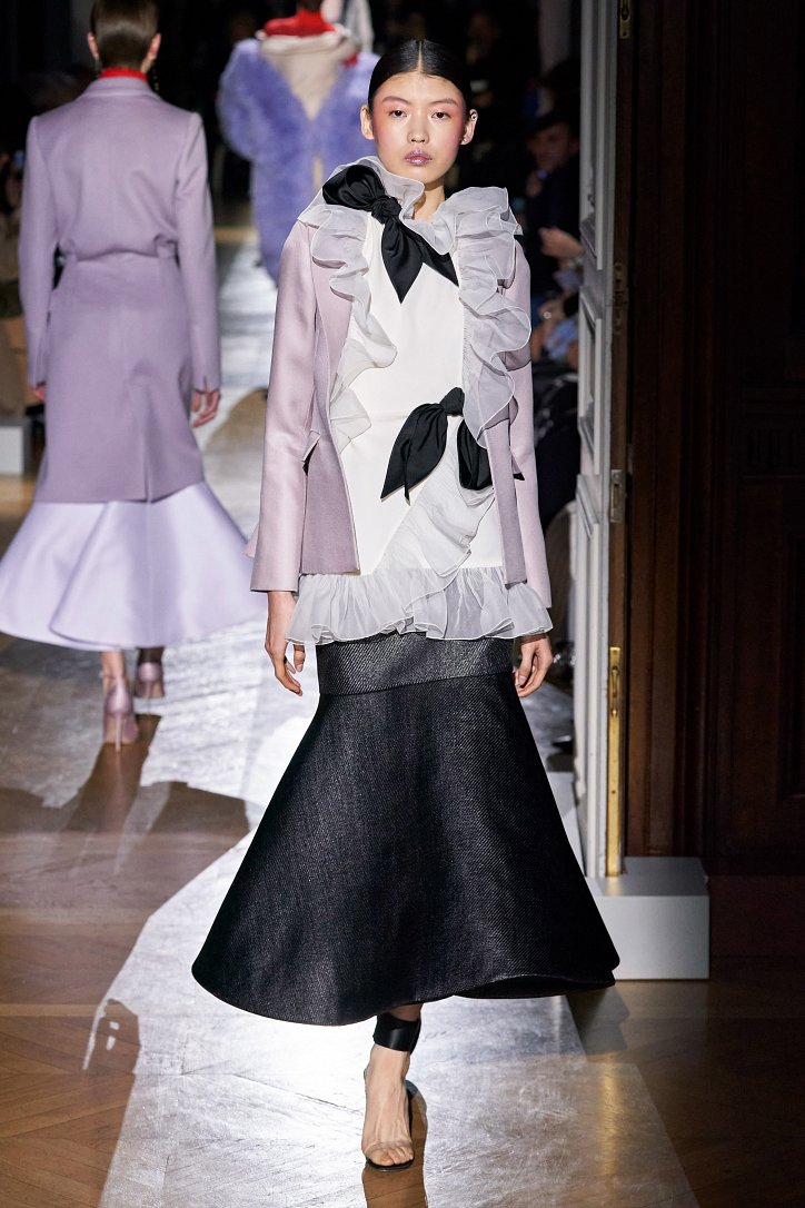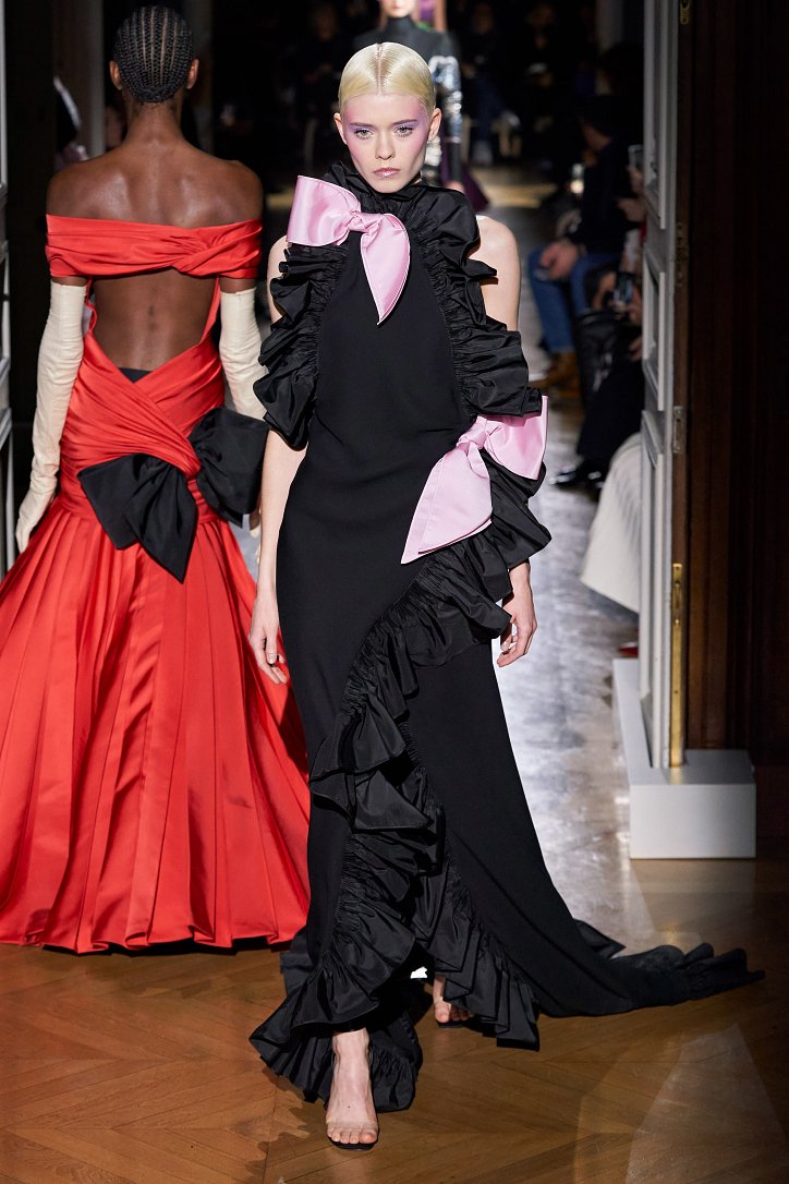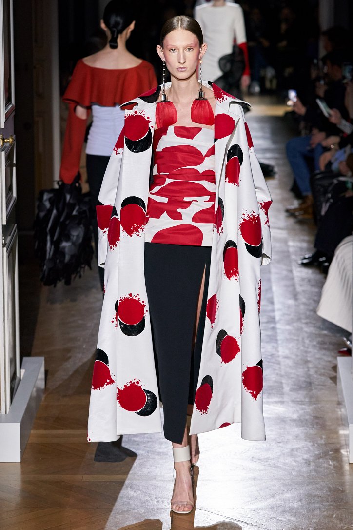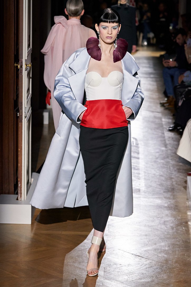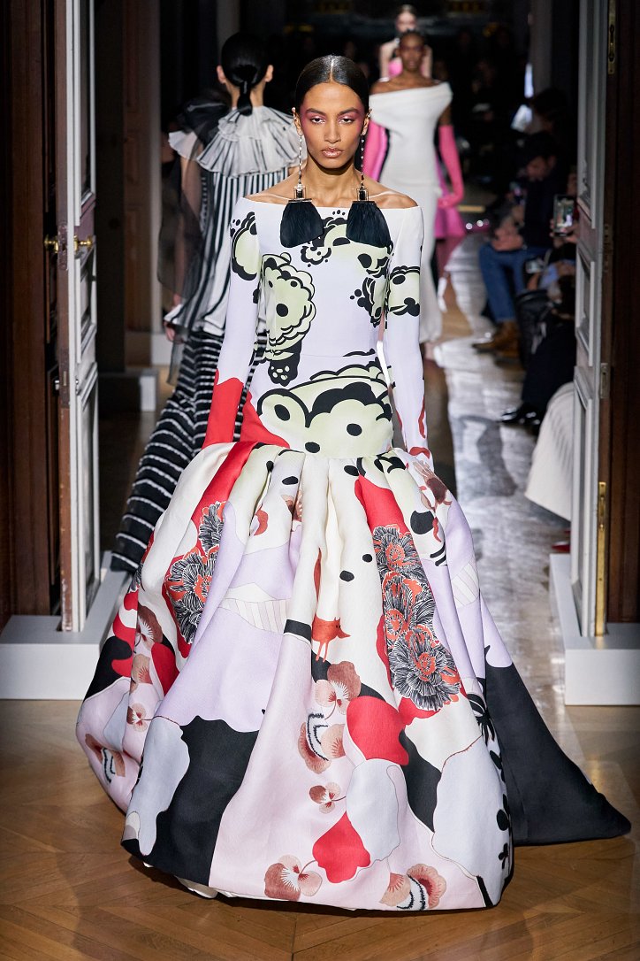 Пьерпаоло Пиччоли ищет новые силуэты. На смену уже привычными пышным платьям и объёмным силуэтам в новой коллекции Valentino пришли платья-русалки, напоминающие шаровары атласные брюки, длинные платья-бюстье с «монументальными» басками и модели с расклешенным низом. Но объем не исчез полностью – он просто изменил свою дислокацию. Пыщные банты на талии - в роли пояса, многочисленные воланы, полностью покрывающие юбку, объёмные топы, незаметно соединённые с пышными юбками – и все это в «фирменных» ярких цветах и принтах, которые уже стали визитной карточкой дома моды. Помимо главного цвета Valentino – красного – в палитру коллекции дизайнер включил оттенки фиолетового, шартрез, розовый, мятный, синий и, конечно же, черный и белый – свобода самовыражения «по Пиччоли» всегда окрашена в яркие и смелые краски.
