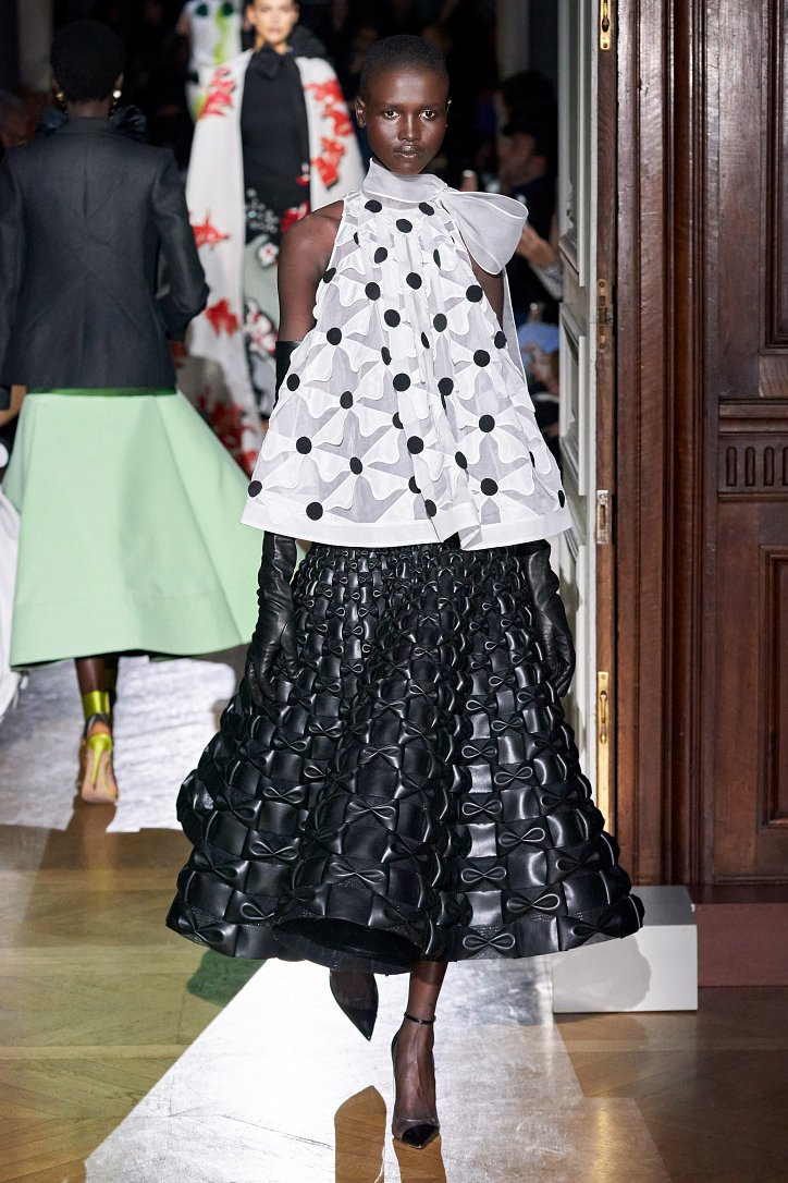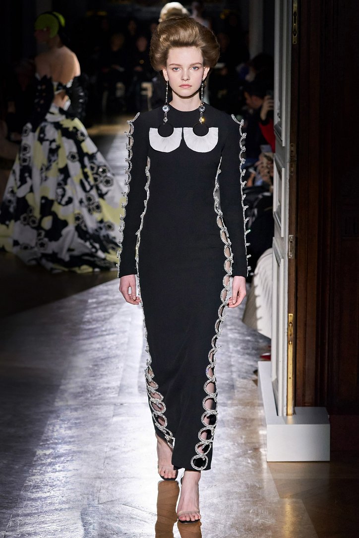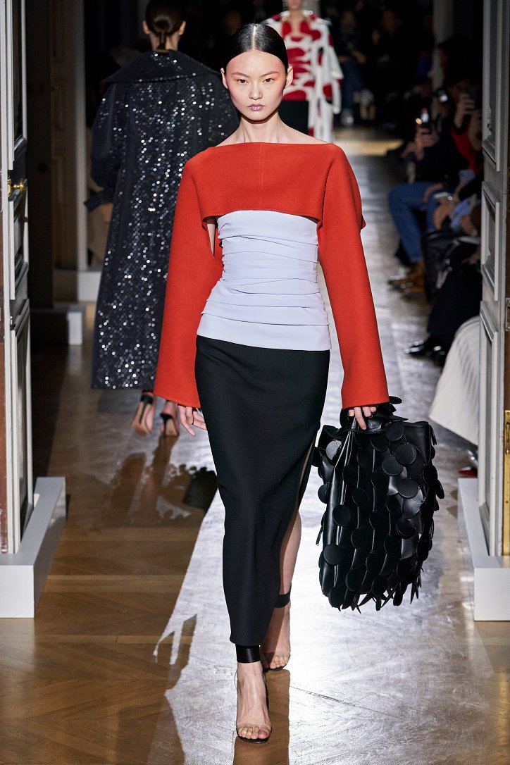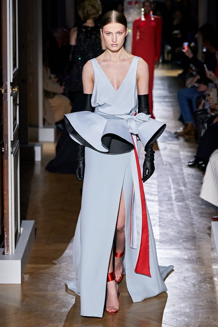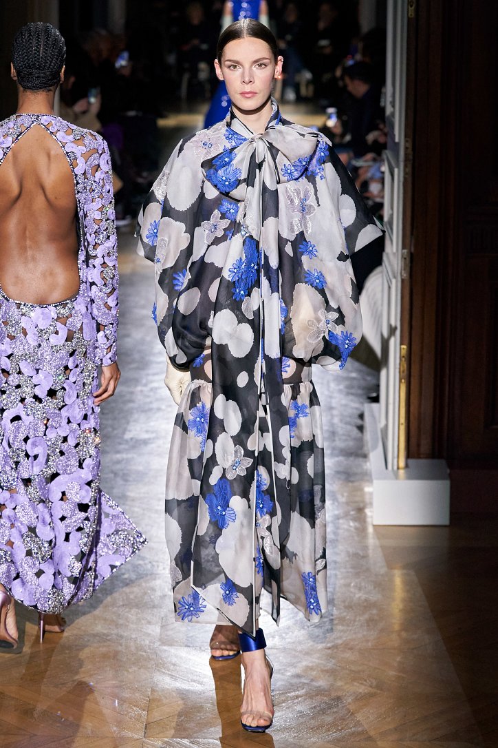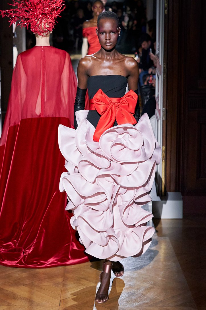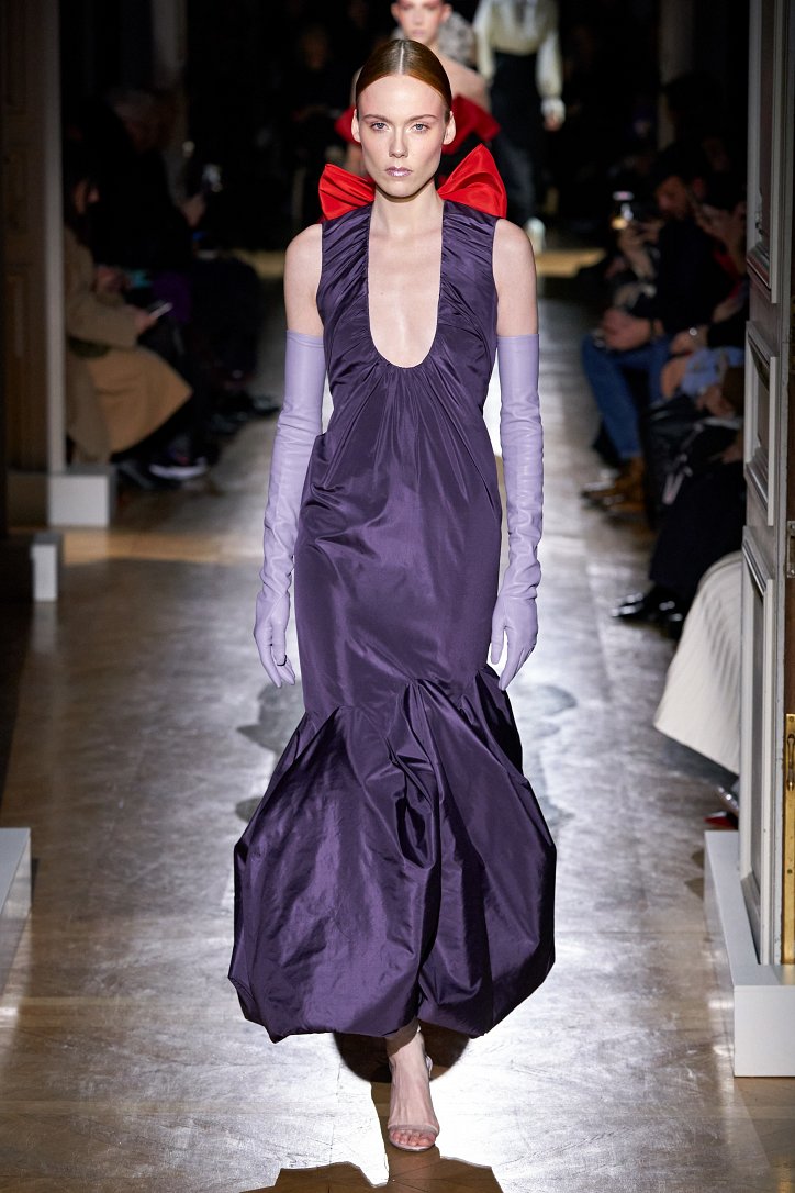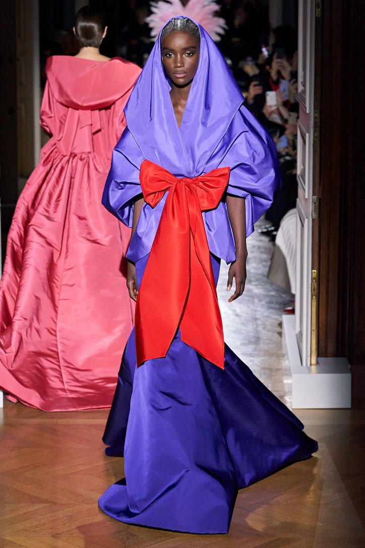 Пьерпаоло Пиччоли ищет новые силуэты. На смену уже привычными пышным платьям и объёмным силуэтам в новой коллекции Valentino пришли платья-русалки, напоминающие шаровары атласные брюки, длинные платья-бюстье с «монументальными» басками и модели с расклешенным низом. Но объем не исчез полностью – он просто изменил свою дислокацию. Пыщные банты на талии - в роли пояса, многочисленные воланы, полностью покрывающие юбку, объёмные топы, незаметно соединённые с пышными юбками – и все это в «фирменных» ярких цветах и принтах, которые уже стали визитной карточкой дома моды. Помимо главного цвета Valentino – красного – в палитру коллекции дизайнер включил оттенки фиолетового, шартрез, розовый, мятный, синий и, конечно же, черный и белый – свобода самовыражения «по Пиччоли» всегда окрашена в яркие и смелые краски.