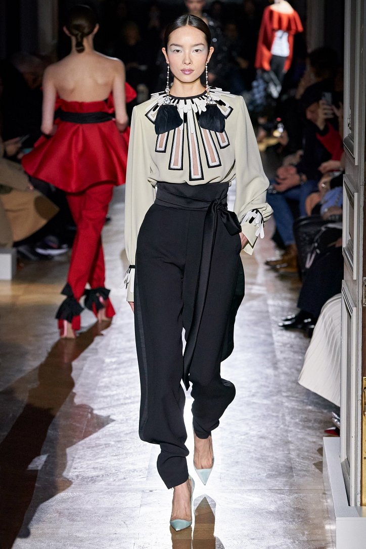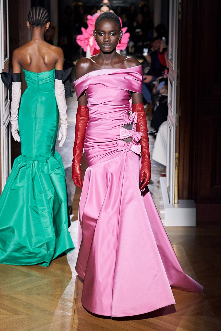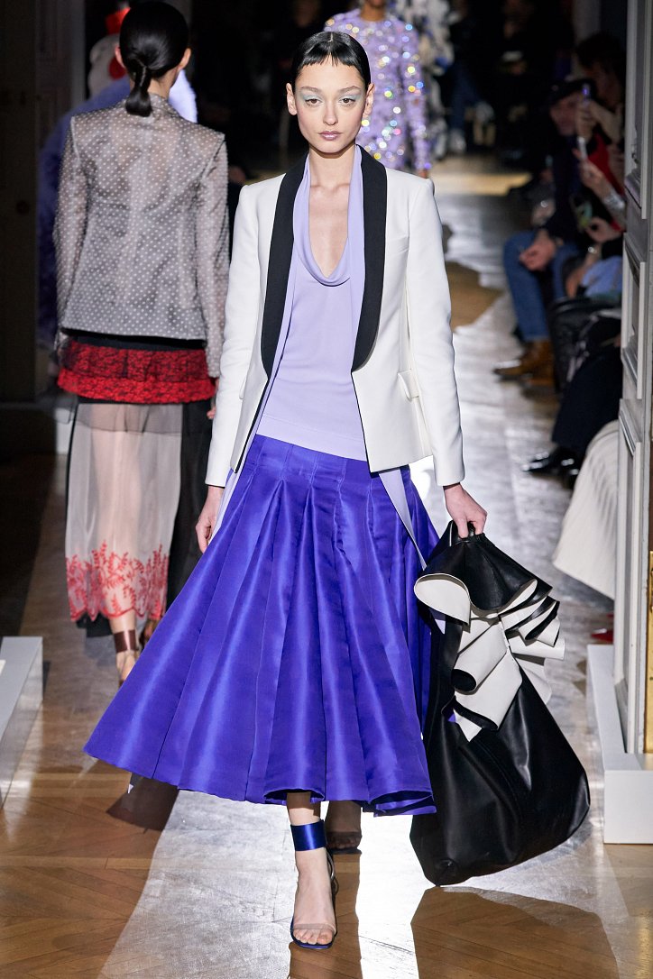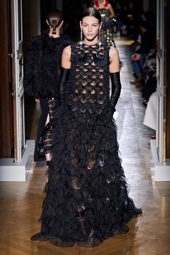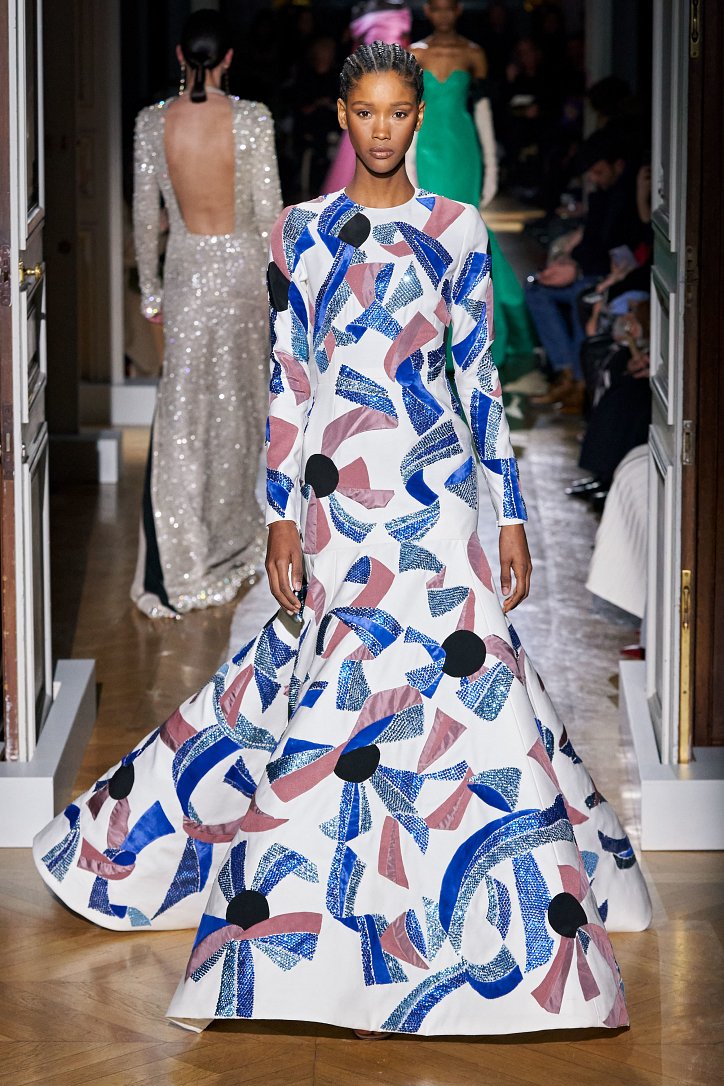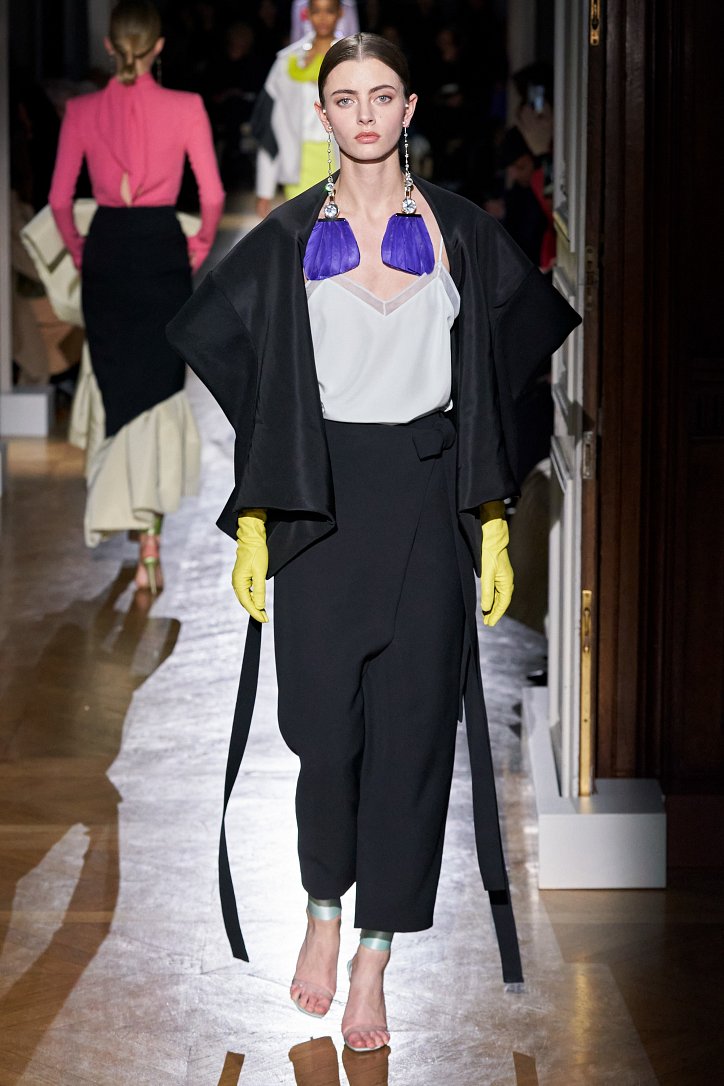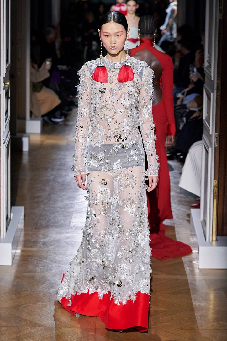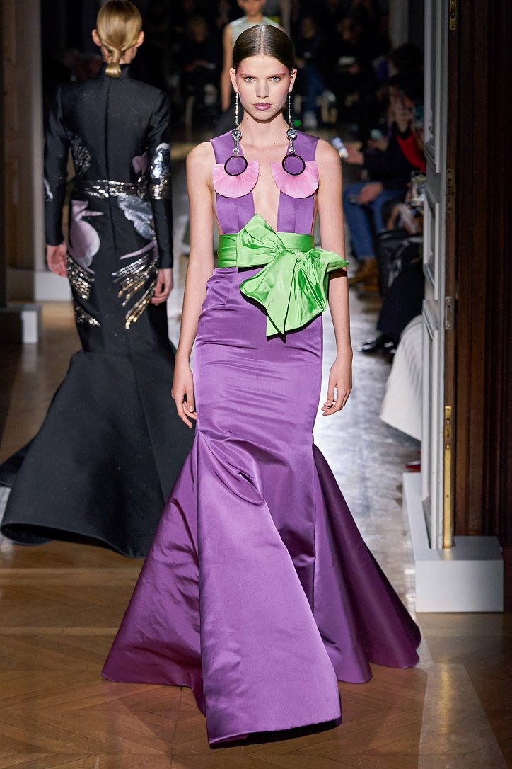 Пьерпаоло Пиччоли ищет новые силуэты. На смену уже привычными пышным платьям и объёмным силуэтам в новой коллекции Valentino пришли платья-русалки, напоминающие шаровары атласные брюки, длинные платья-бюстье с «монументальными» басками и модели с расклешенным низом. Но объем не исчез полностью – он просто изменил свою дислокацию. Пыщные банты на талии - в роли пояса, многочисленные воланы, полностью покрывающие юбку, объёмные топы, незаметно соединённые с пышными юбками – и все это в «фирменных» ярких цветах и принтах, которые уже стали визитной карточкой дома моды. Помимо главного цвета Valentino – красного – в палитру коллекции дизайнер включил оттенки фиолетового, шартрез, розовый, мятный, синий и, конечно же, черный и белый – свобода самовыражения «по Пиччоли» всегда окрашена в яркие и смелые краски.