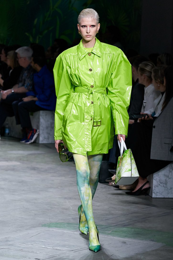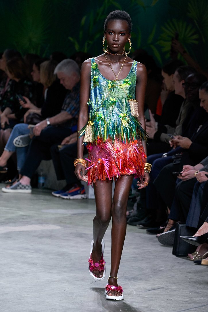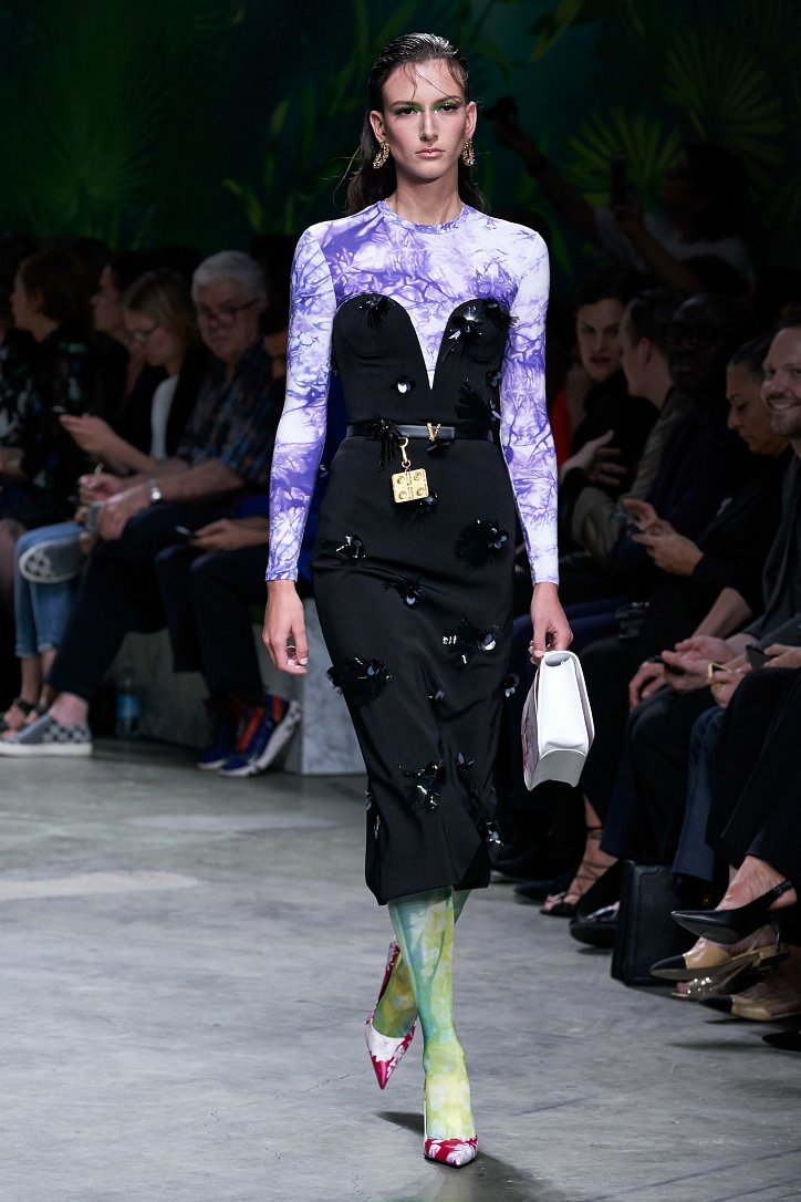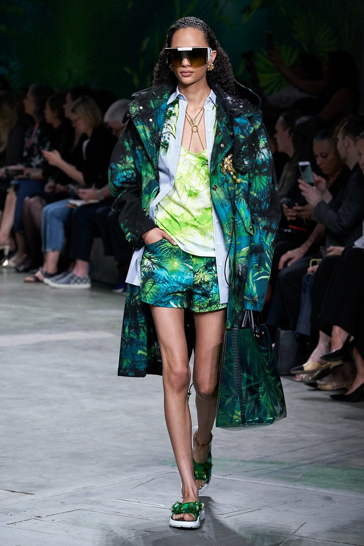 Помимо «тропических» платьев и костюмов в коллекции было множество мини-платьев и коротких юбок, джинсовых курток и платьев-футляров, лонгсливов и топов с принтом tie-dye, неоновых блуз и дождевиков – все в лучших традициях конца 90-ых.