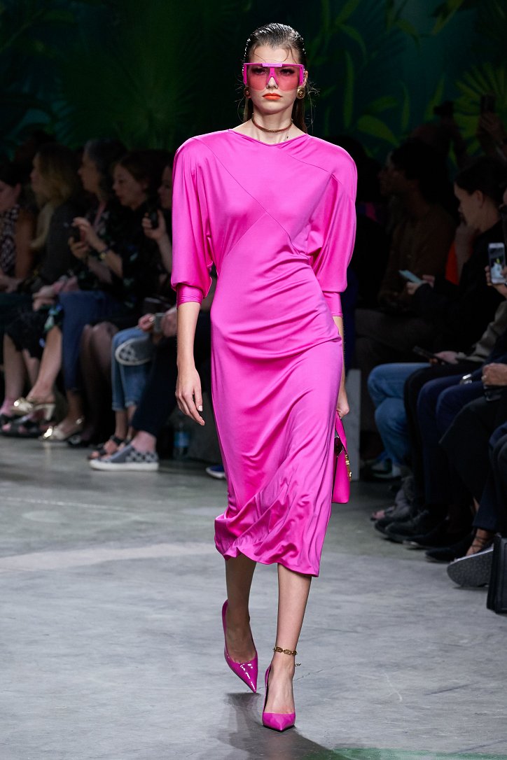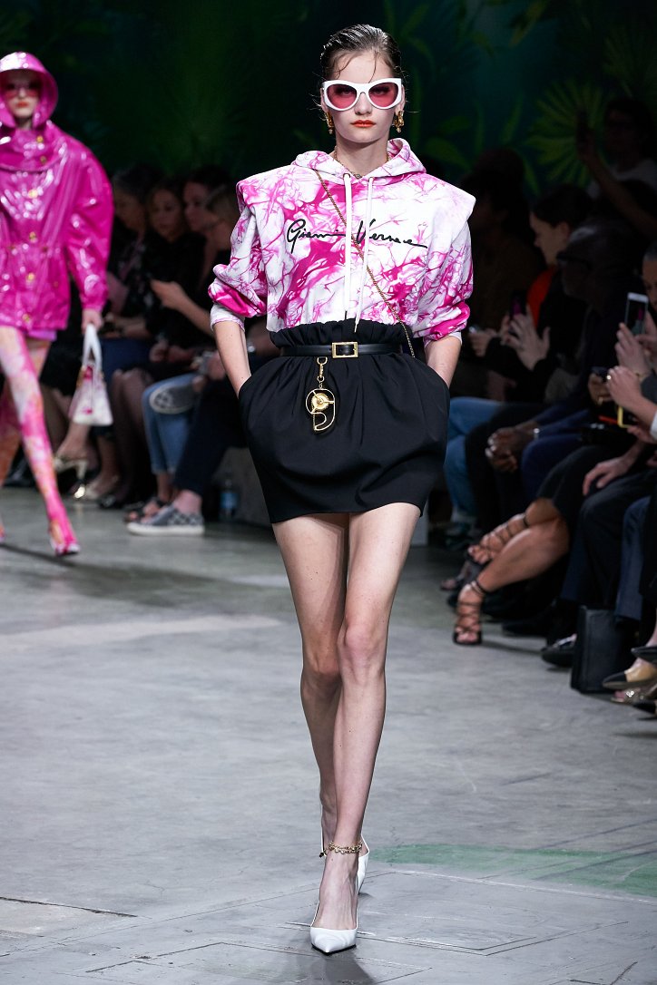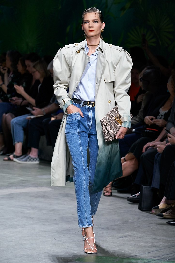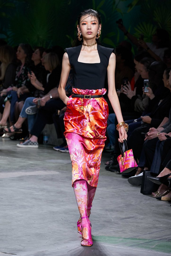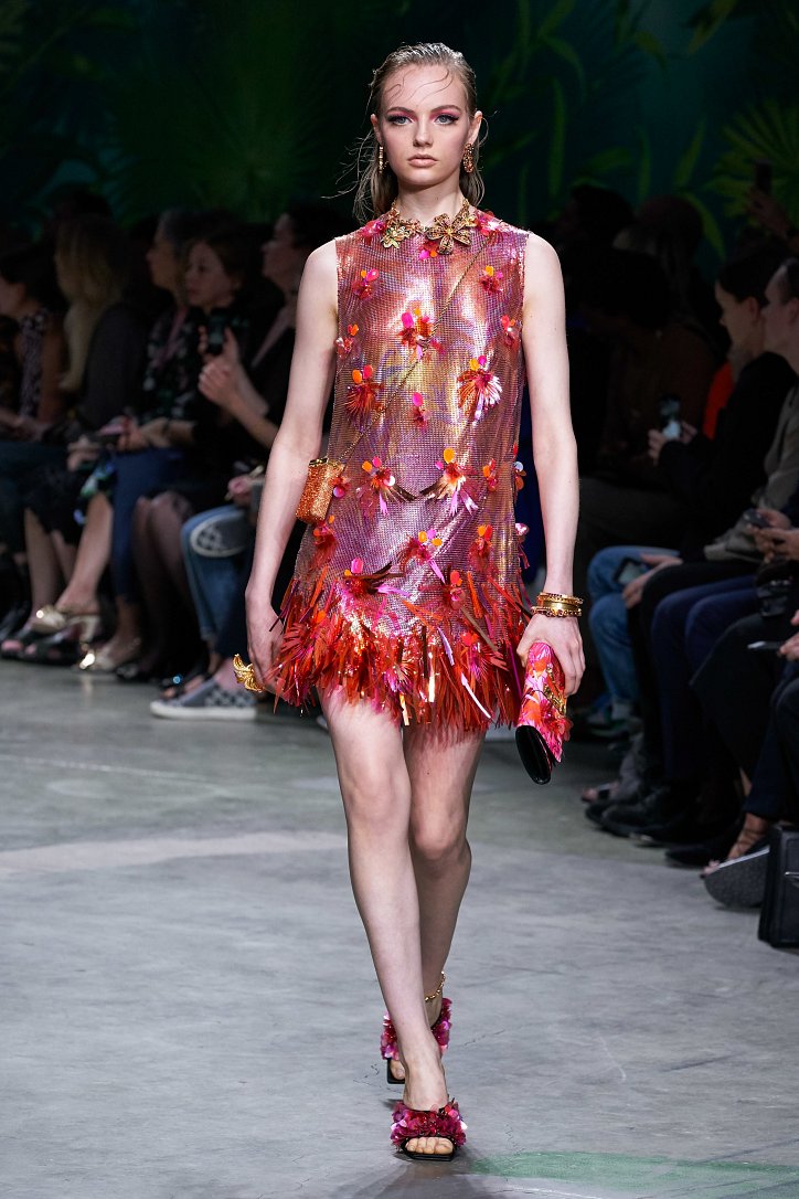 Помимо «тропических» платьев и костюмов в коллекции было множество мини-платьев и коротких юбок, джинсовых курток и платьев-футляров, лонгсливов и топов с принтом tie-dye, неоновых блуз и дождевиков – все в лучших традициях конца 90-ых.
