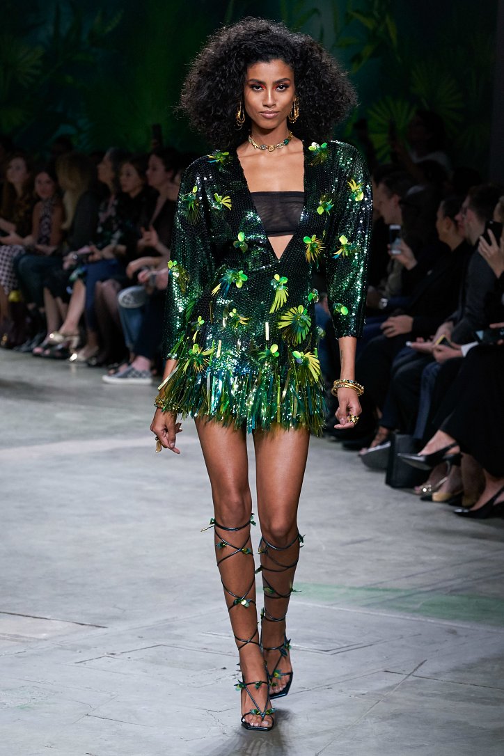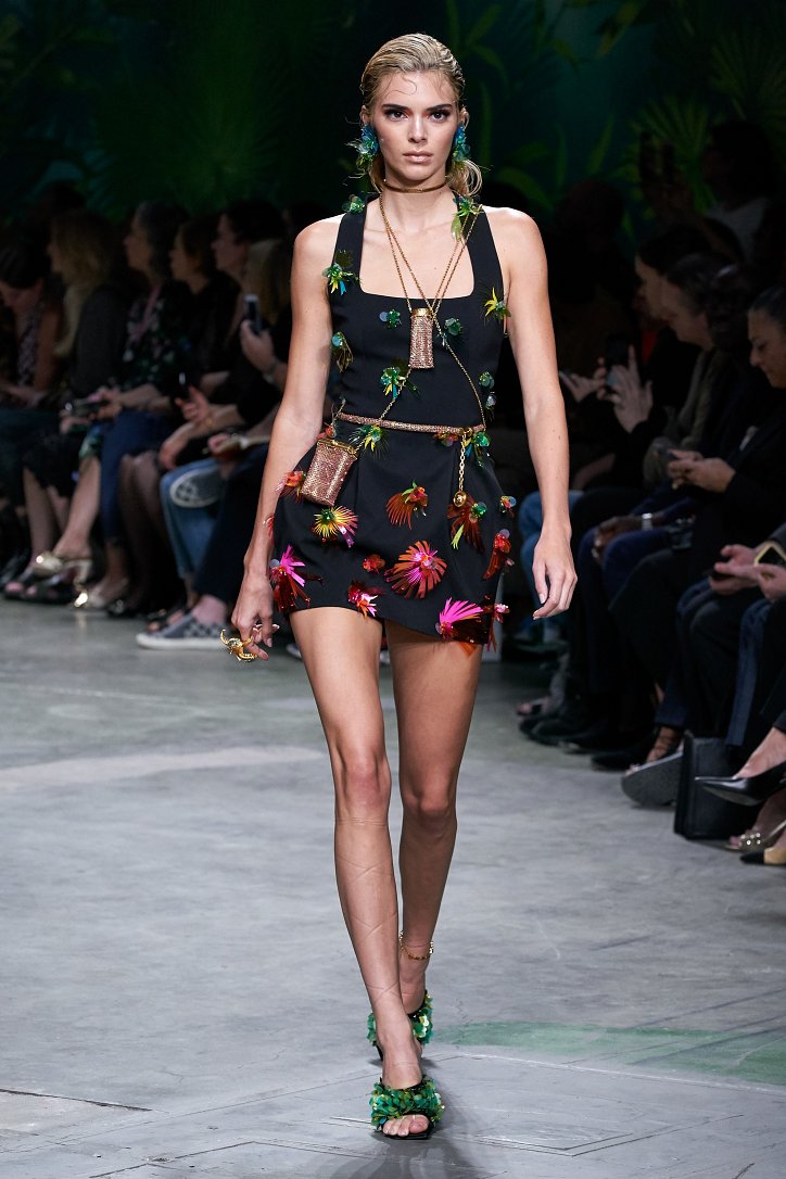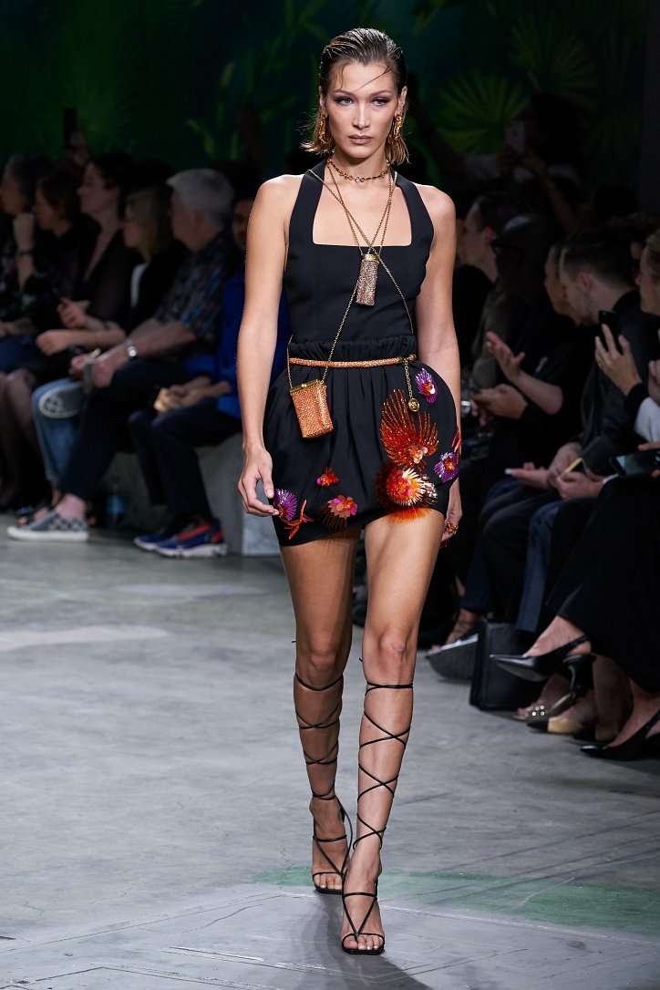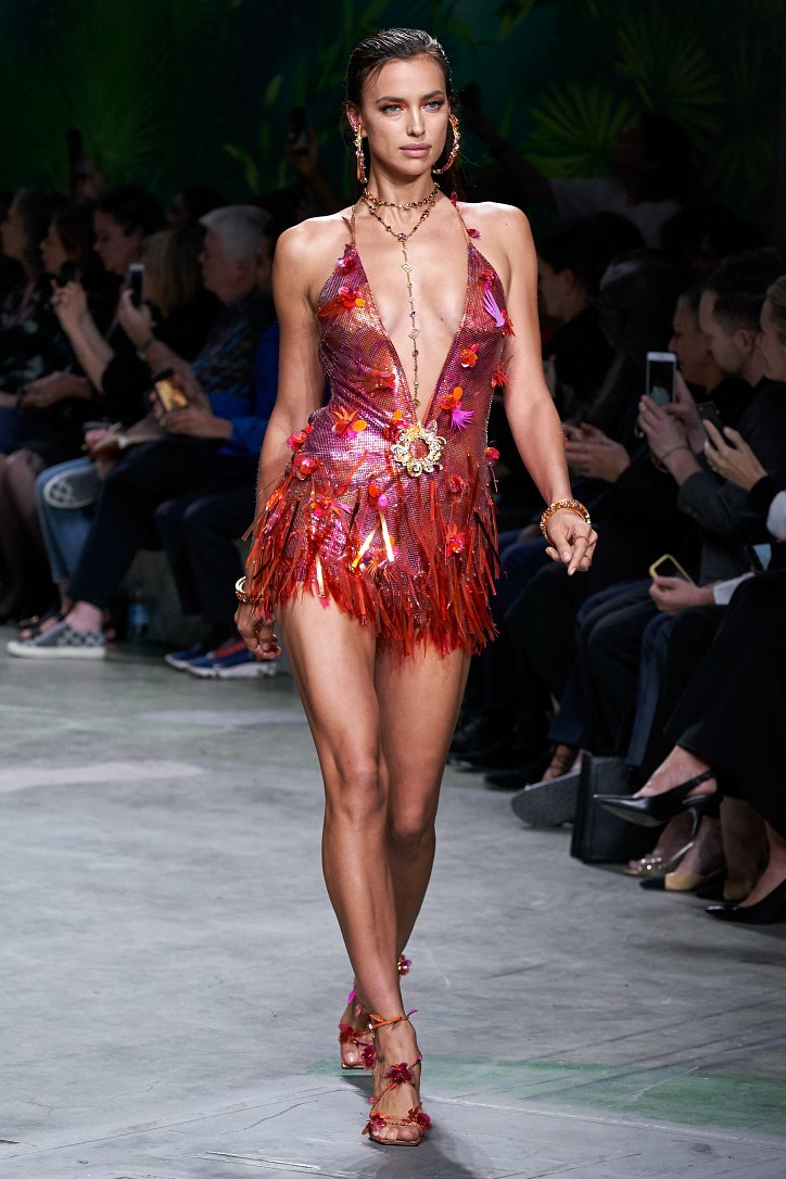 Донателла Версаче не стала в точности воспроизводить «джунгли» 2000-го, а, взяв их за основу, создала несколько вариаций на тему. Самым же эффектным воплощением тропиков на ткани стало платье, в котором закрыла шоу Джей Ло, – длинное, с вырезом до талии и юбкой, разрезанной до пояса, оно выглядело еще более сексапильным и не менее эффектным, чем его «прототип».