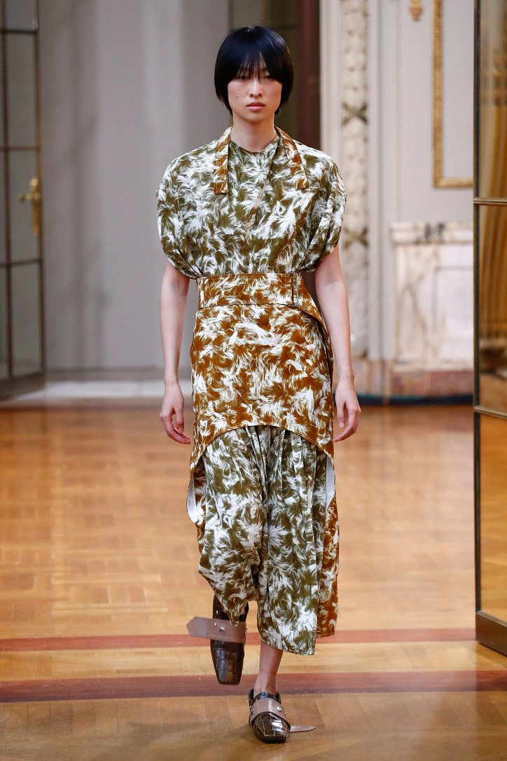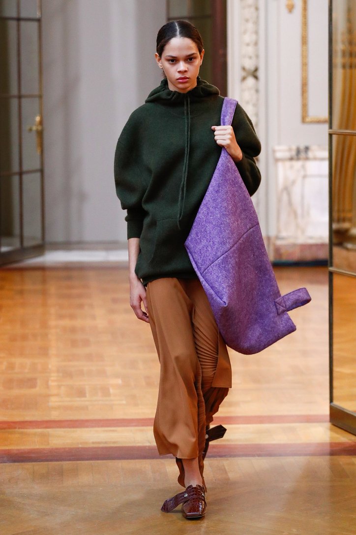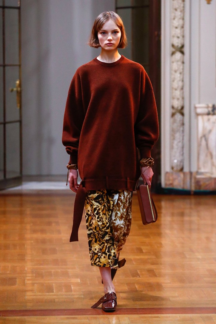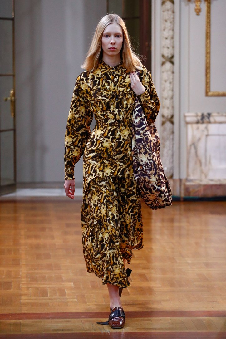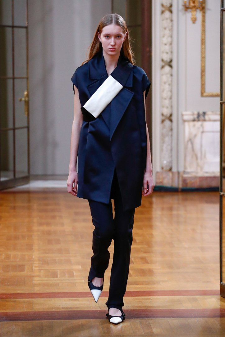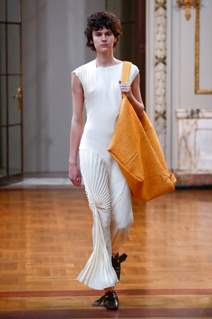 Акцент дизайнер решила сделать на талию – повсеместно подчеркивая ее широкими поясами, а также на аксессуары: оригинальные туфли с хлястиками до пола и огромные сумки-мешки из текстиля были в коллекции явно не «на вторых ролях».