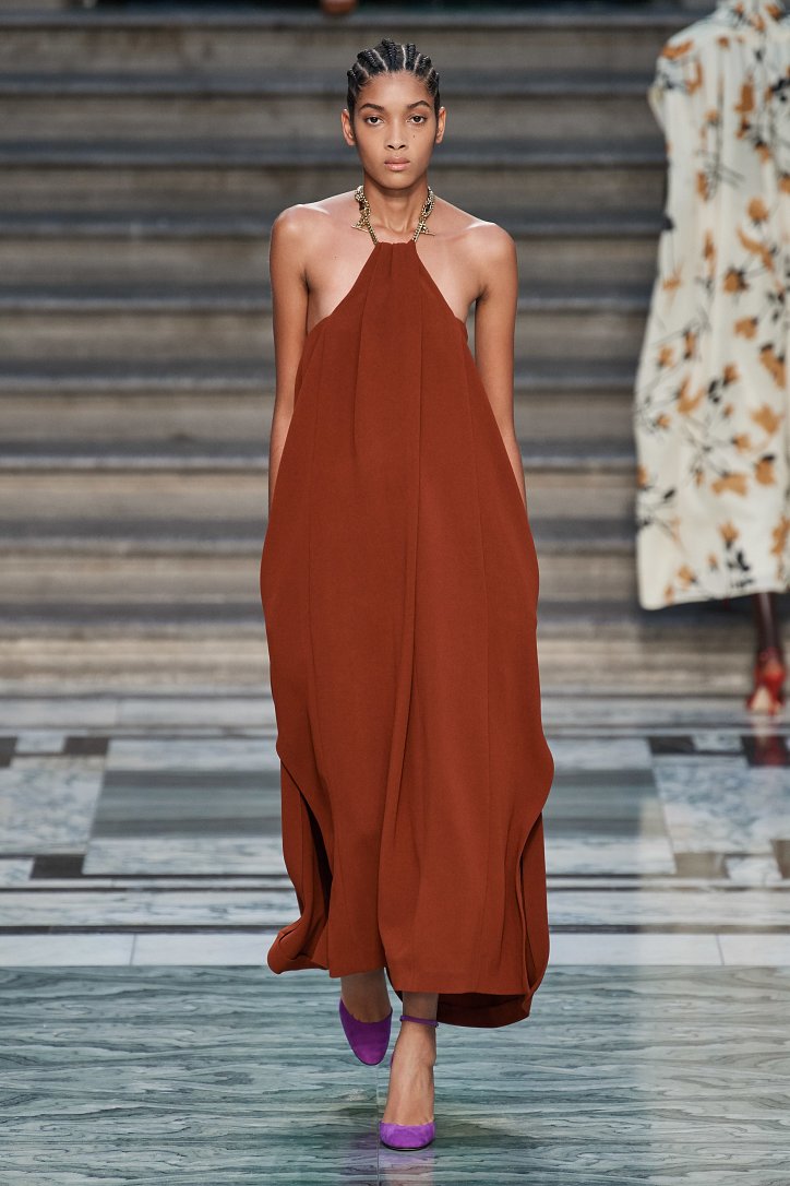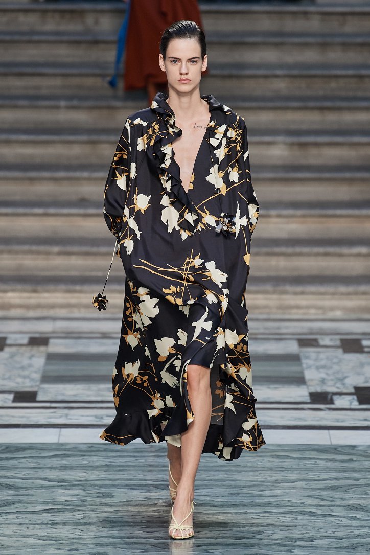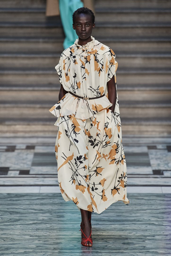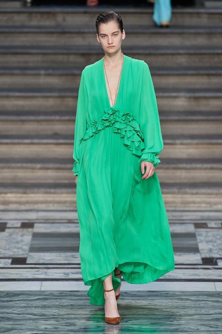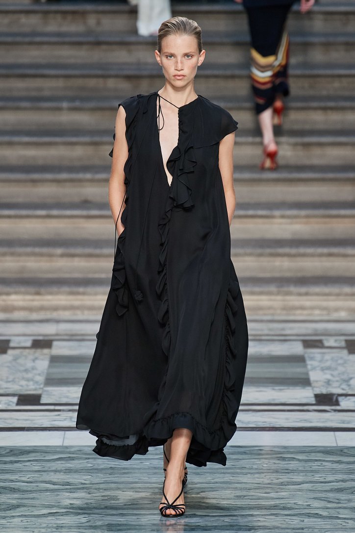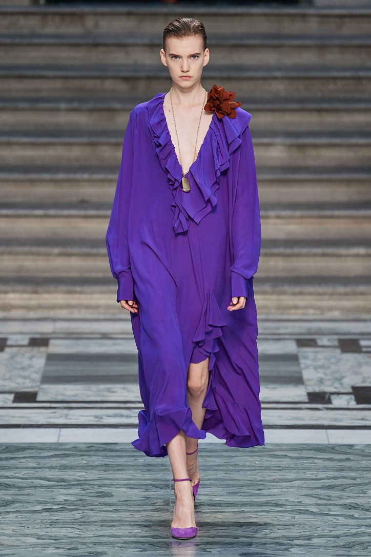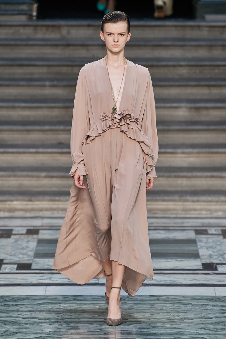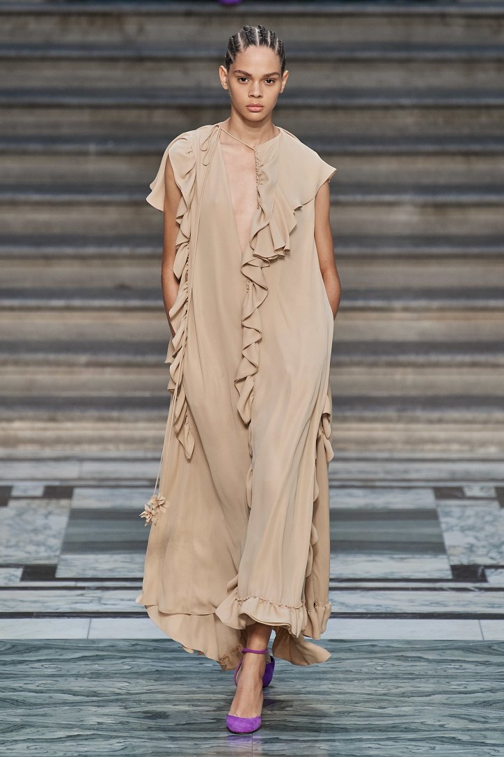 Дизайнер смогла по-настоящему удивить публику, сделав ставку на легкие летящие силуэты и простые формы. Главным героем коллекции стало платье: без пояса и акцента на талии, с глубоким вырезом и длиной миди, длинными, почти скрывающими ладони, рукавами с манжетами и танцующими при ходьбе оборками. Простоту и объемность силуэтов компенсировали яркие оттенки фиолетового, лимонного, неоново-зеленого, мятного и розового, которые дизайнер смело объединяла в пары или комбинировала с коричневым и палево-бежевым.