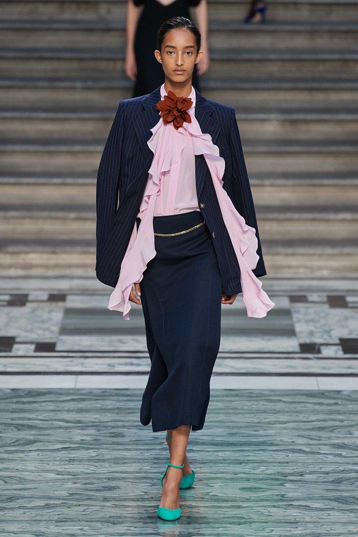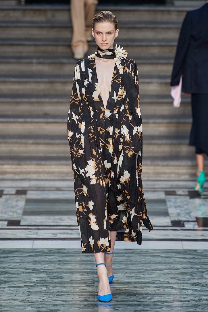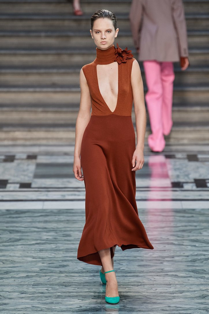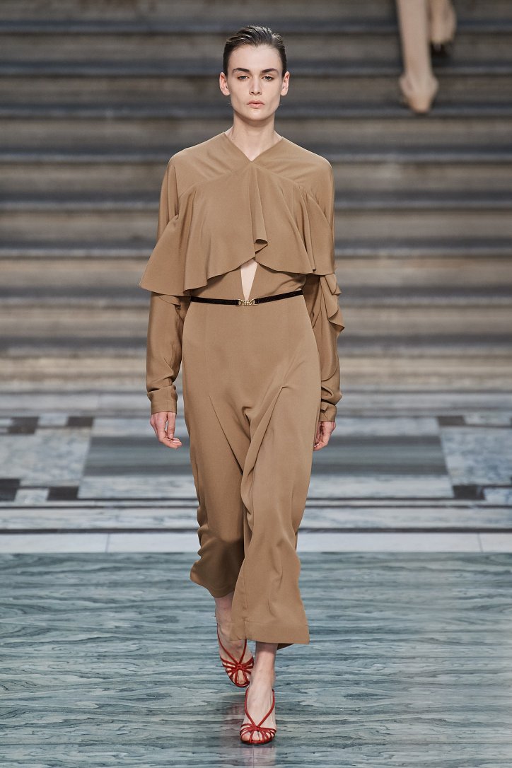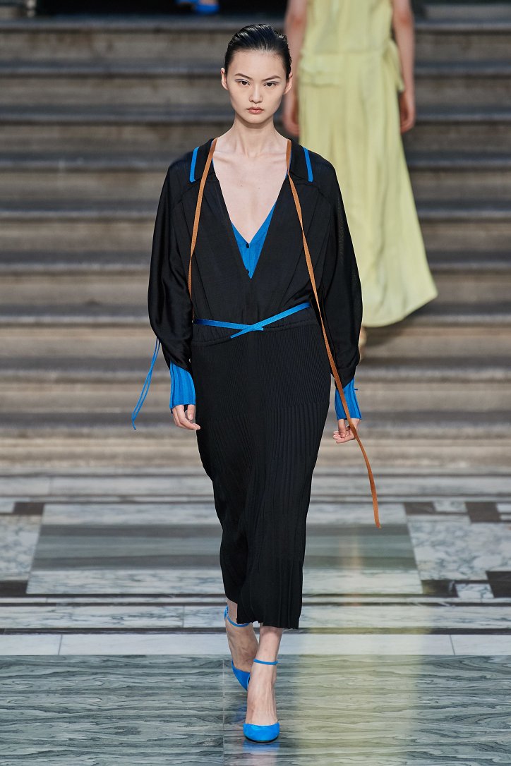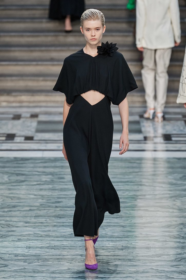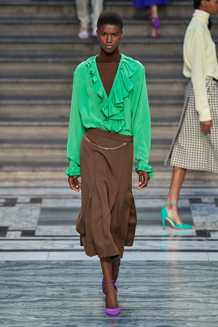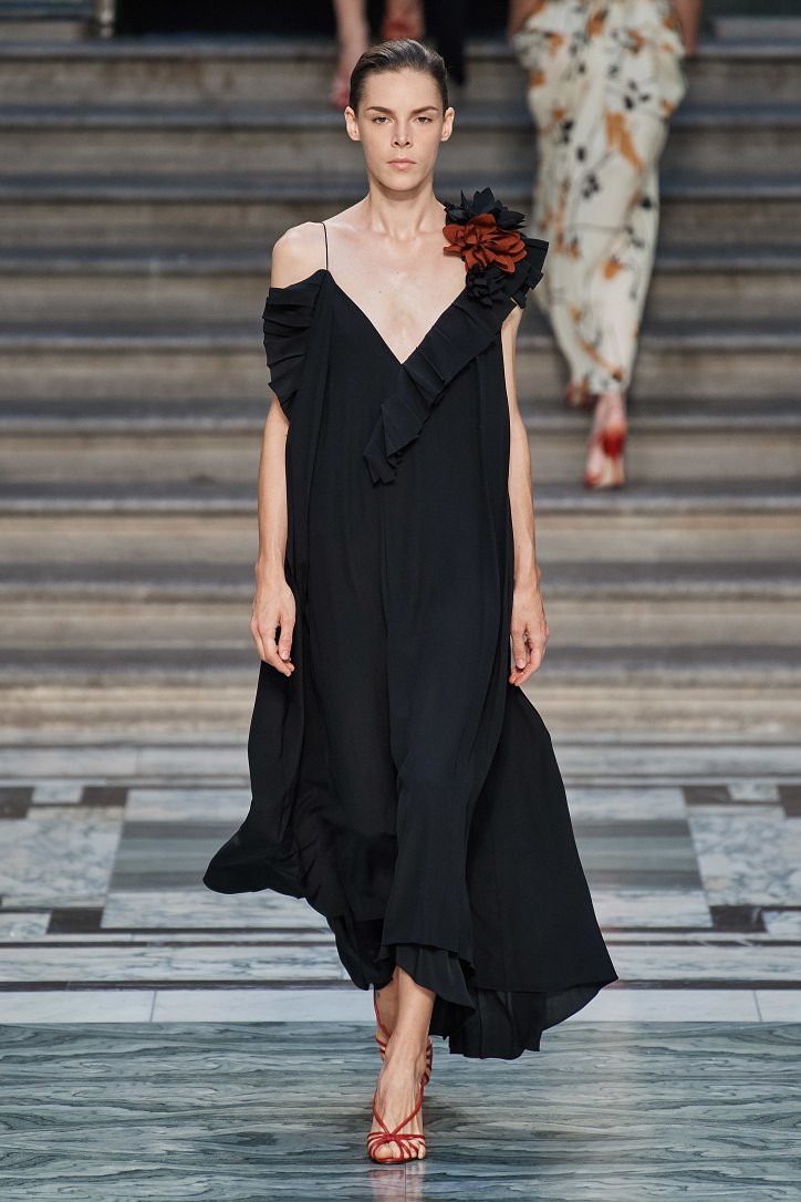 Дизайнер смогла по-настоящему удивить публику, сделав ставку на легкие летящие силуэты и простые формы. Главным героем коллекции стало платье: без пояса и акцента на талии, с глубоким вырезом и длиной миди, длинными, почти скрывающими ладони, рукавами с манжетами и танцующими при ходьбе оборками. Простоту и объемность силуэтов компенсировали яркие оттенки фиолетового, лимонного, неоново-зеленого, мятного и розового, которые дизайнер смело объединяла в пары или комбинировала с коричневым и палево-бежевым.