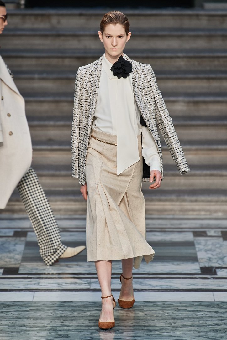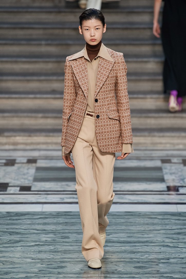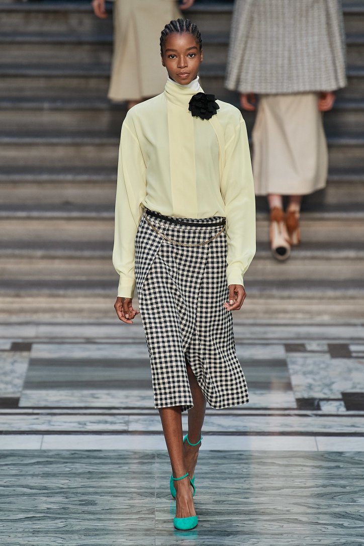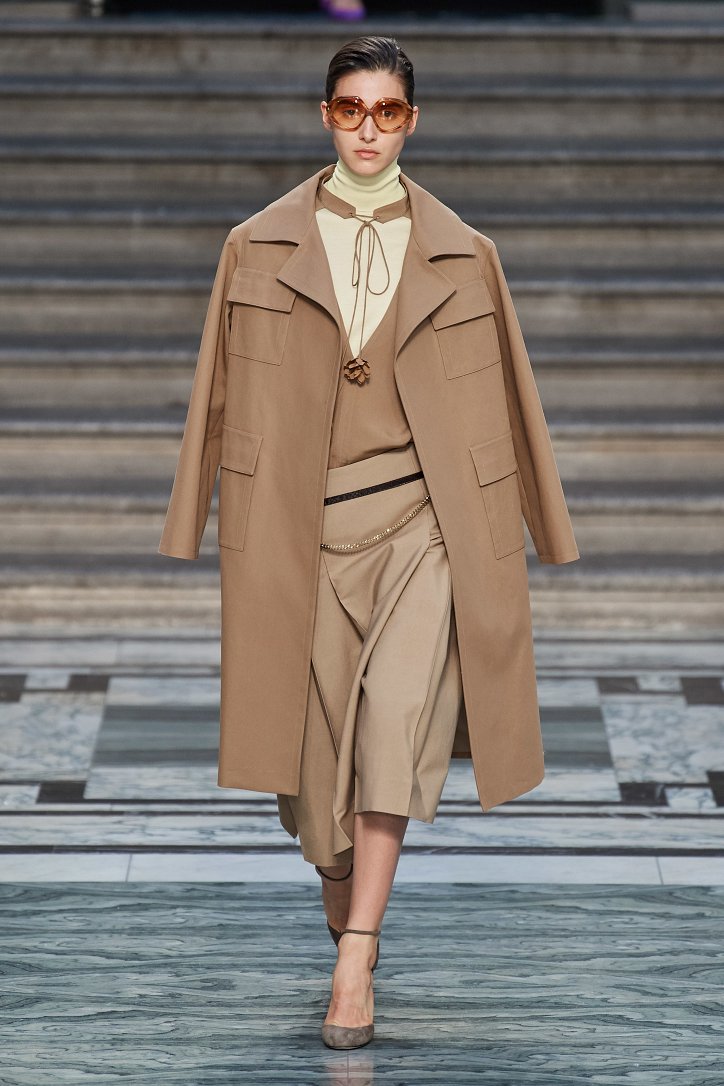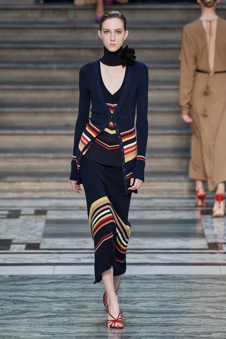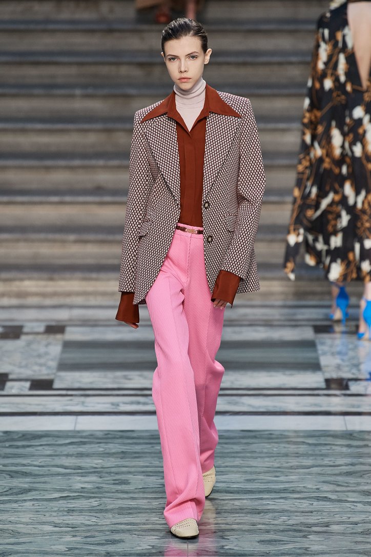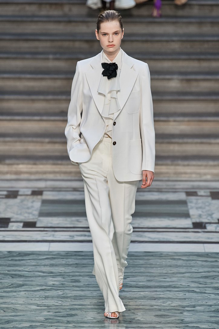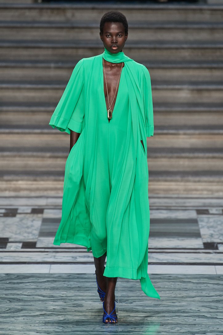Дизайнер смогла по-настоящему удивить публику, сделав ставку на легкие летящие силуэты и простые формы. Главным героем коллекции стало платье: без пояса и акцента на талии, с глубоким вырезом и длиной миди, длинными, почти скрывающими ладони, рукавами с манжетами и танцующими при ходьбе оборками. Простоту и объемность силуэтов компенсировали яркие оттенки фиолетового, лимонного, неоново-зеленого, мятного и розового, которые дизайнер смело объединяла в пары или комбинировала с коричневым и палево-бежевым.