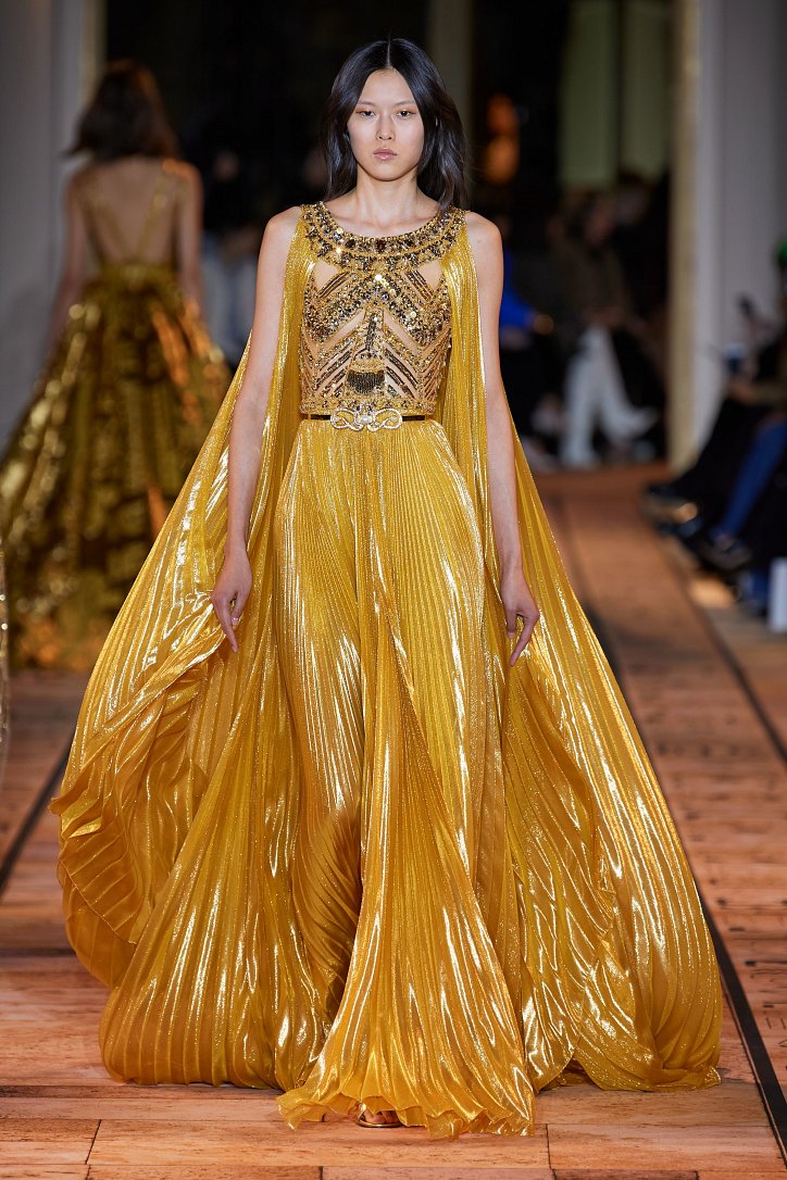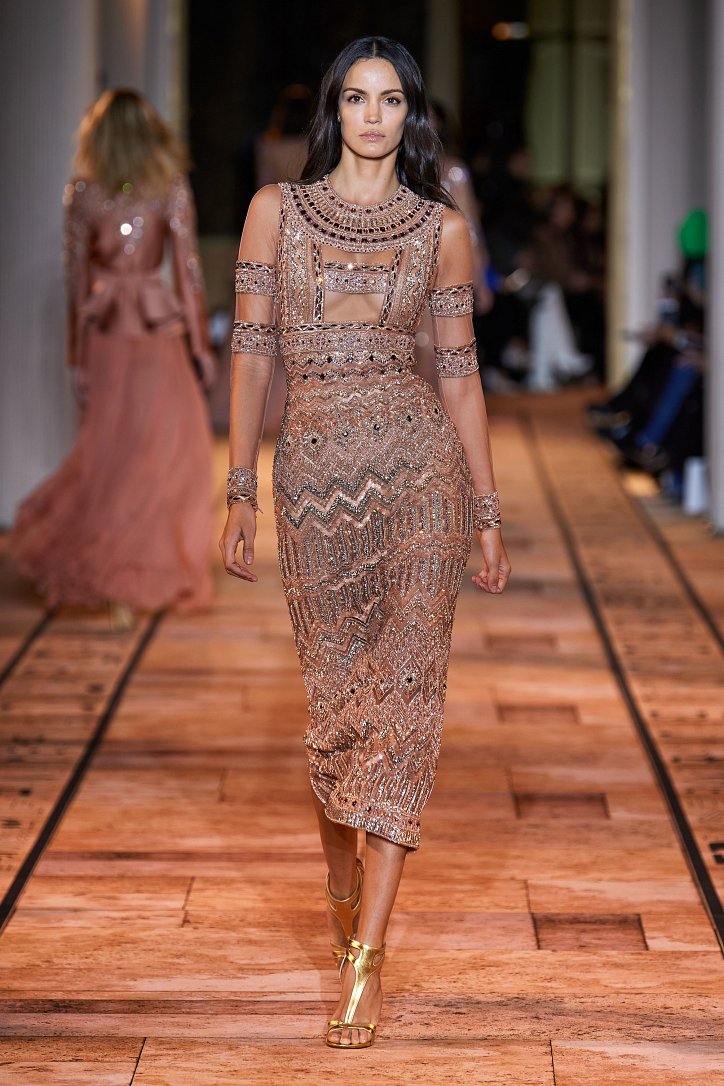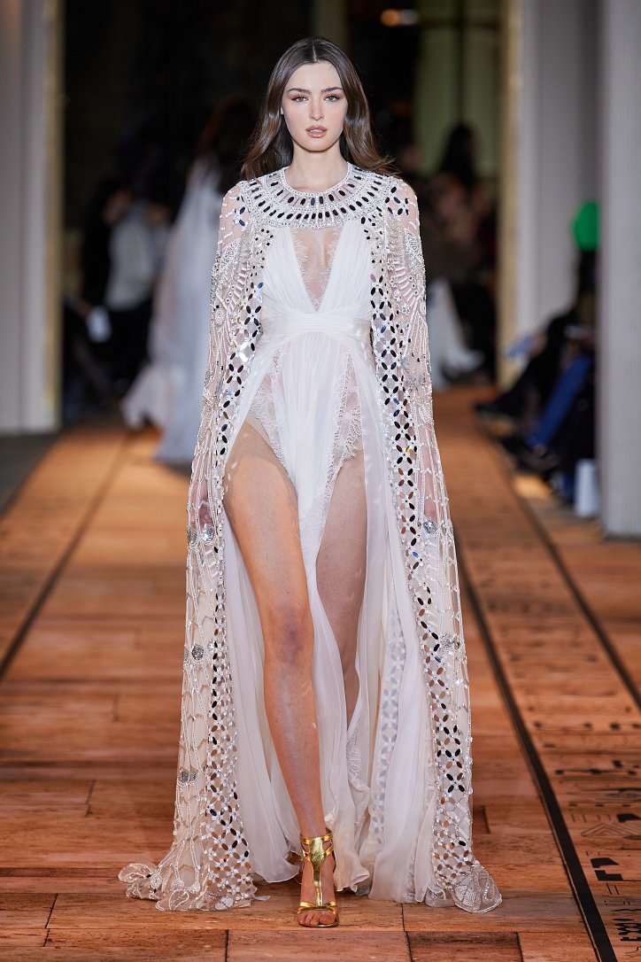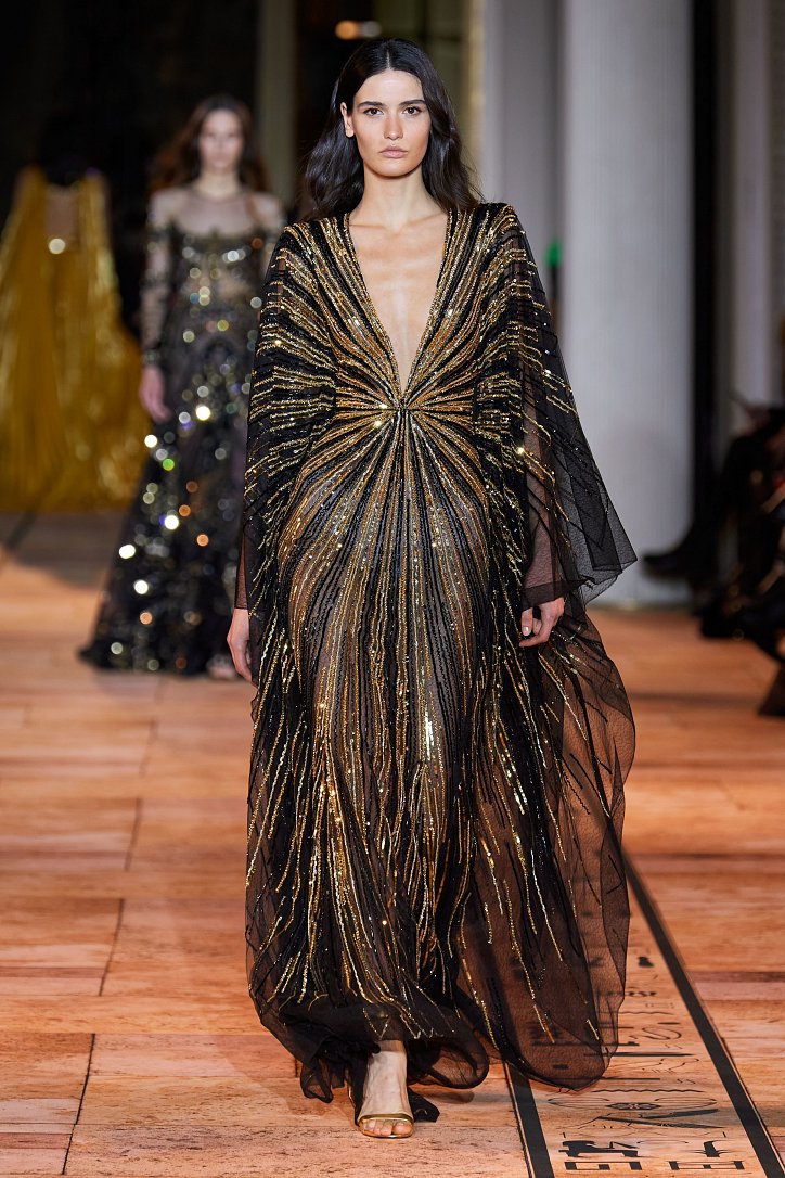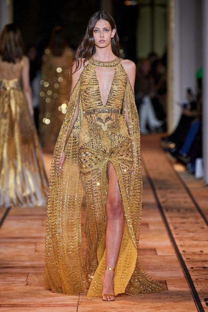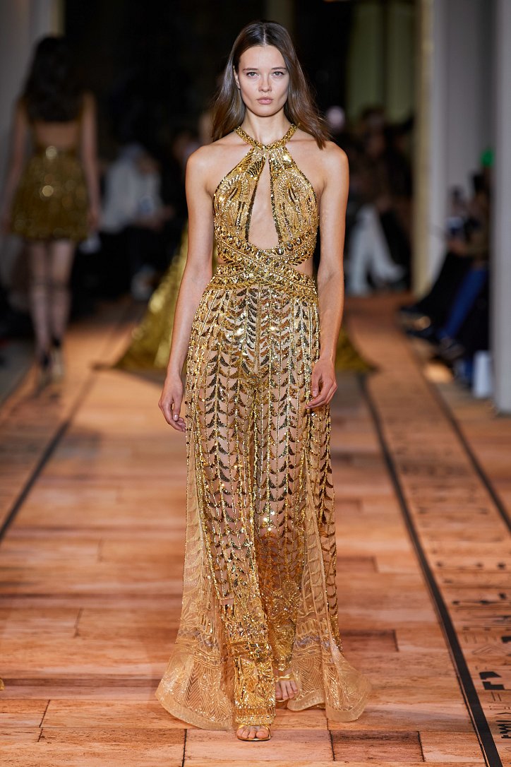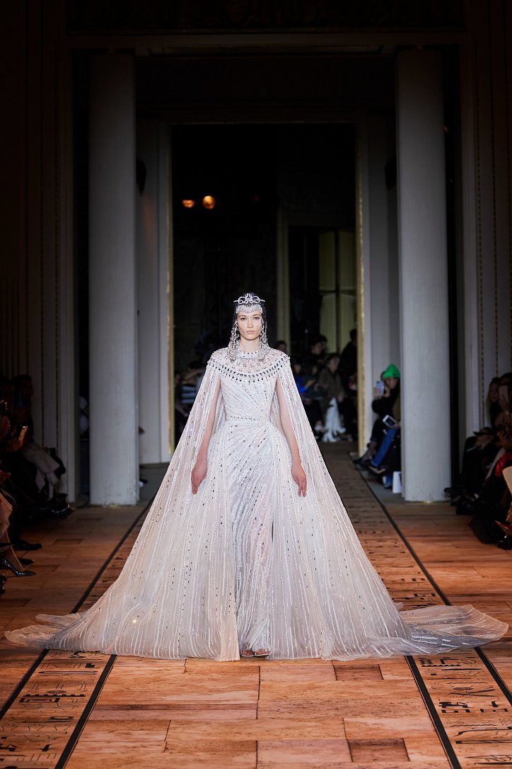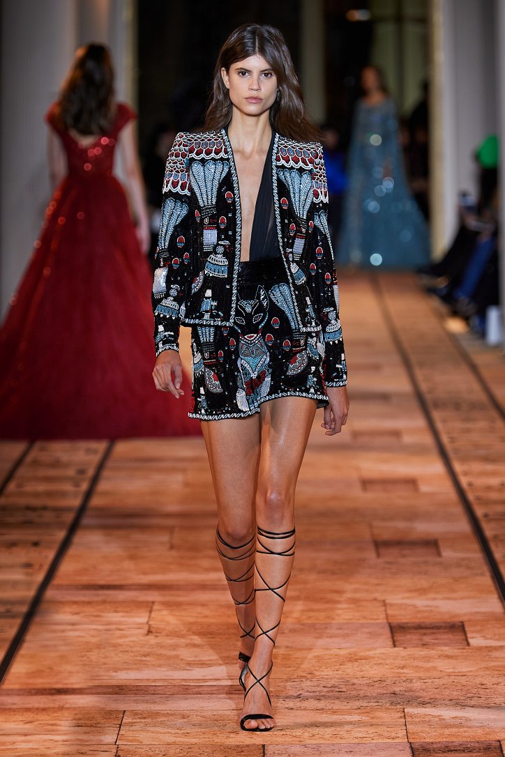 Вдохновение для своей новой кутюрной коллекции Zuhair Murad искал в Древнем Египте: об этом напрямую заявлял самый первый лук, состоящий из топа и юбки, полностью расшитых разноцветными кристаллами, бисером и пайетками. И это была совсем не абстрактная вышивка, а узнаваемые всеми рисунки с египетской символикой, которая придала мистическую окраску всей коллекции.