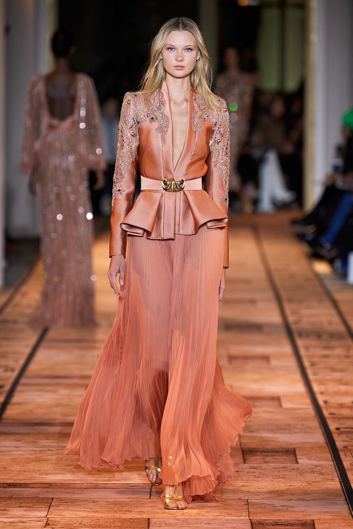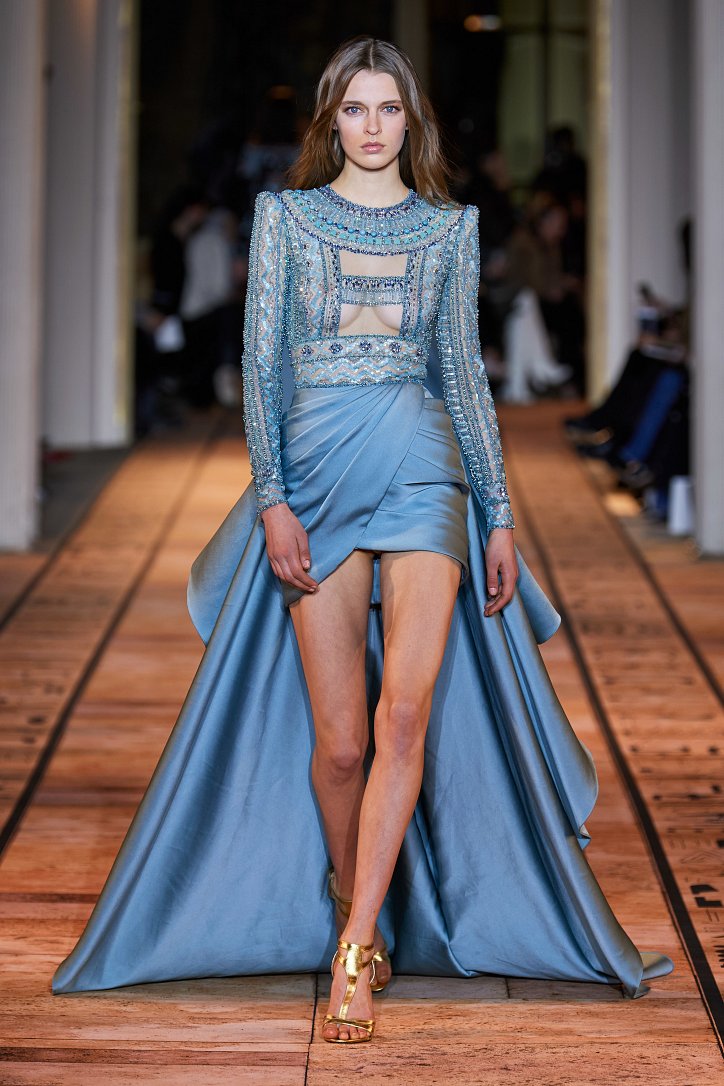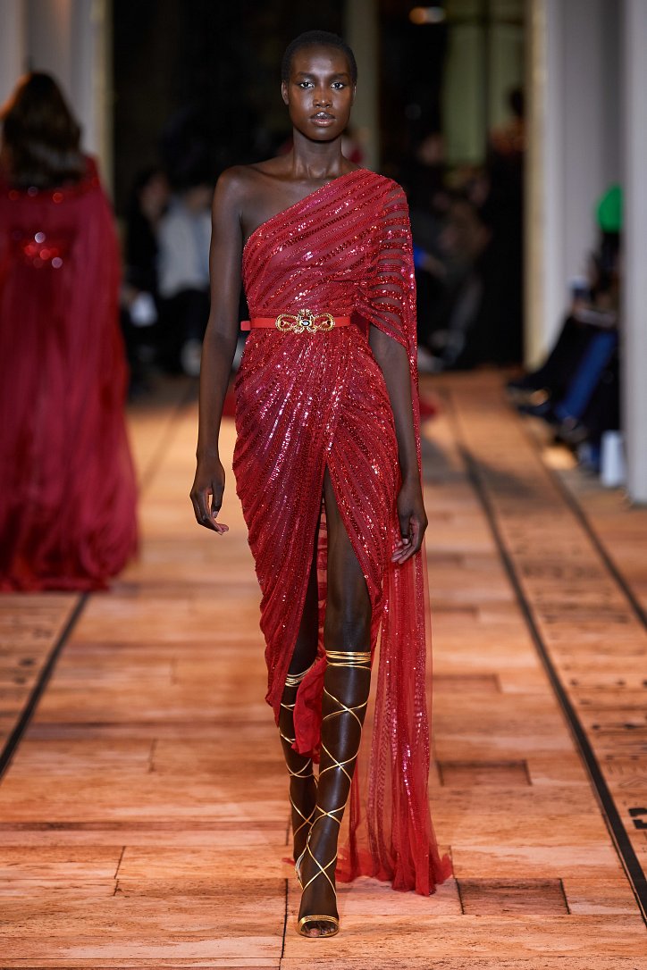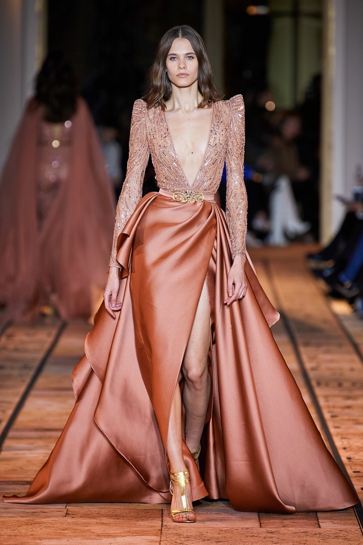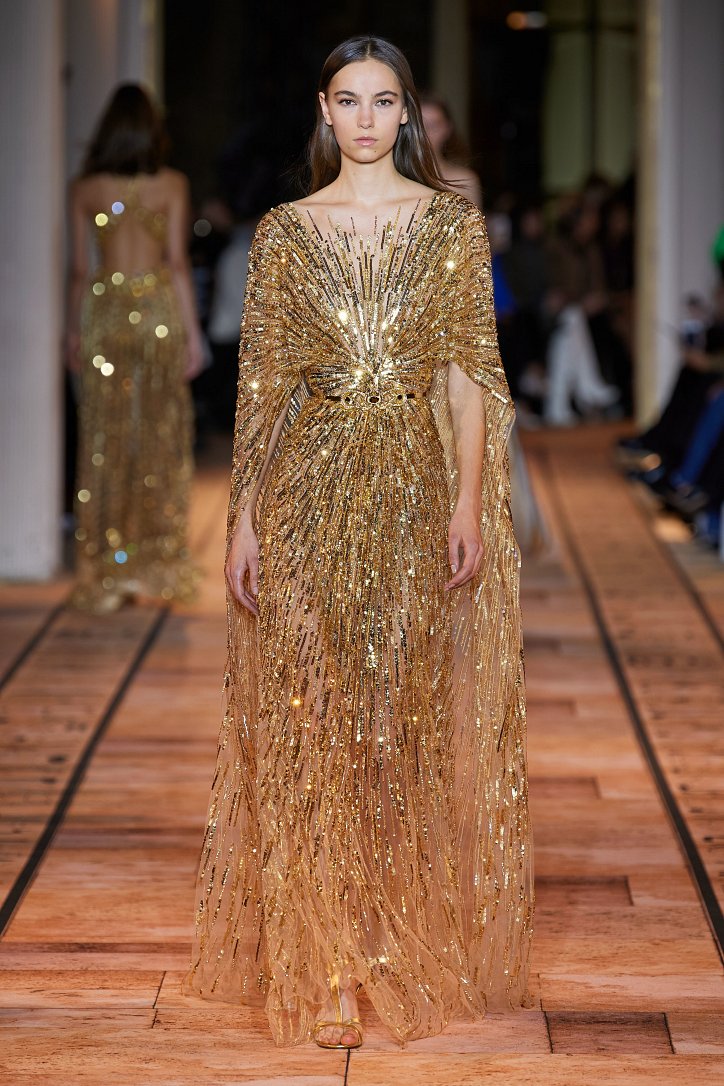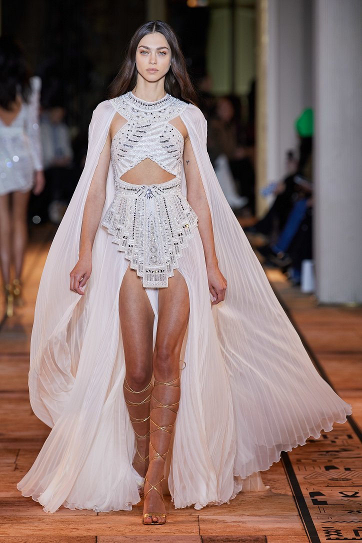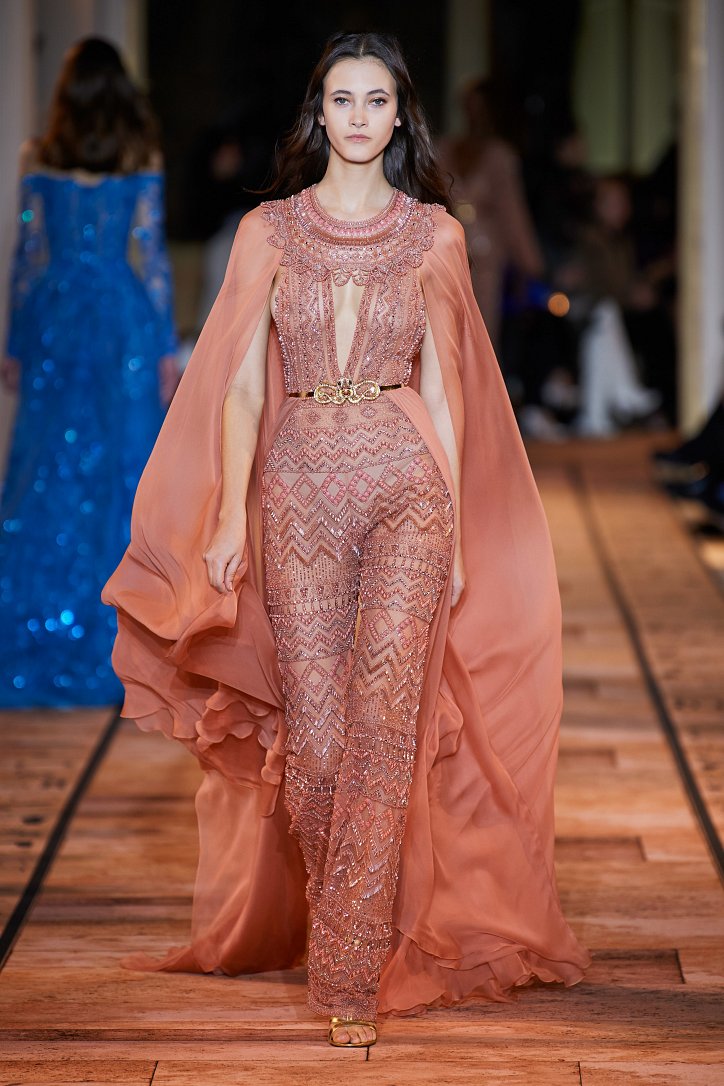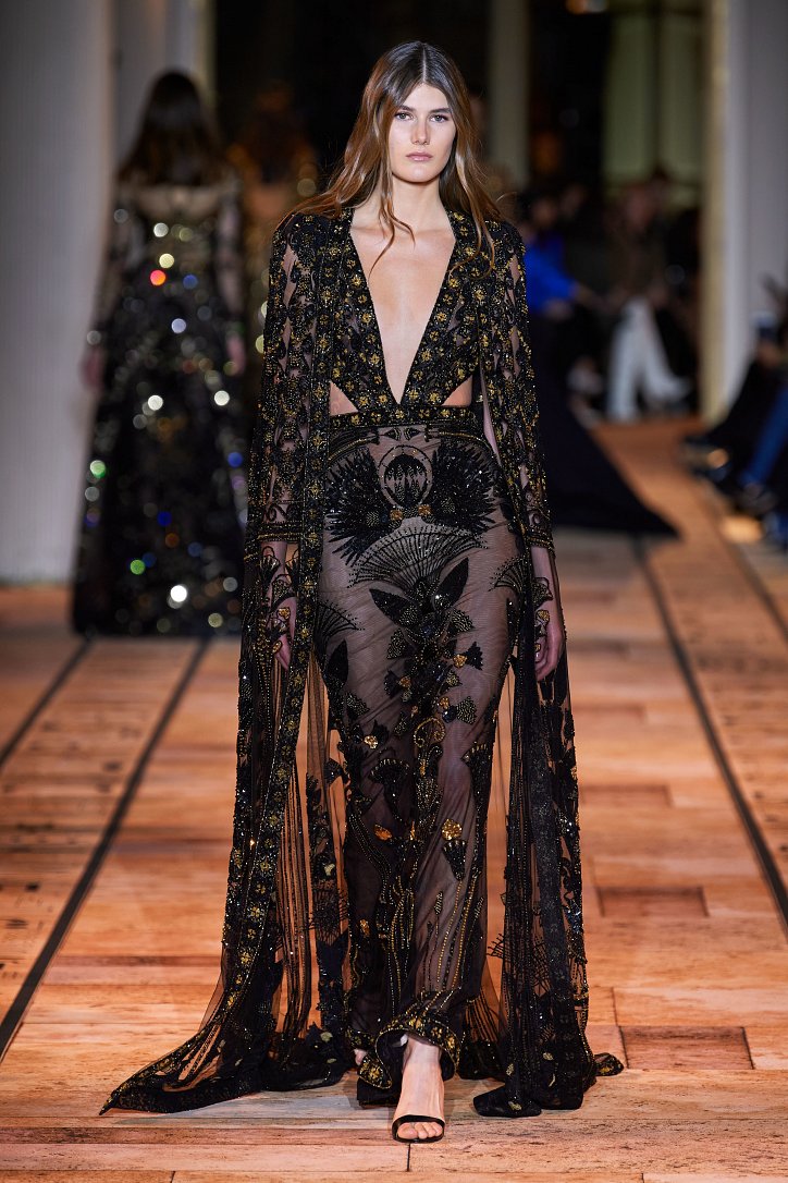 Вдохновение для своей новой кутюрной коллекции Zuhair Murad искал в Древнем Египте: об этом напрямую заявлял самый первый лук, состоящий из топа и юбки, полностью расшитых разноцветными кристаллами, бисером и пайетками. И это была совсем не абстрактная вышивка, а узнаваемые всеми рисунки с египетской символикой, которая придала мистическую окраску всей коллекции.