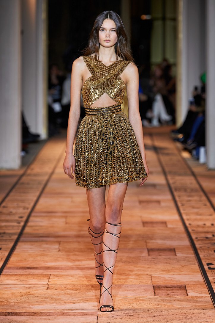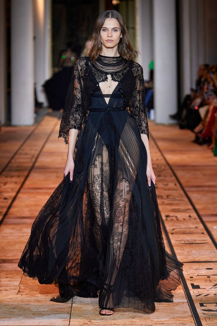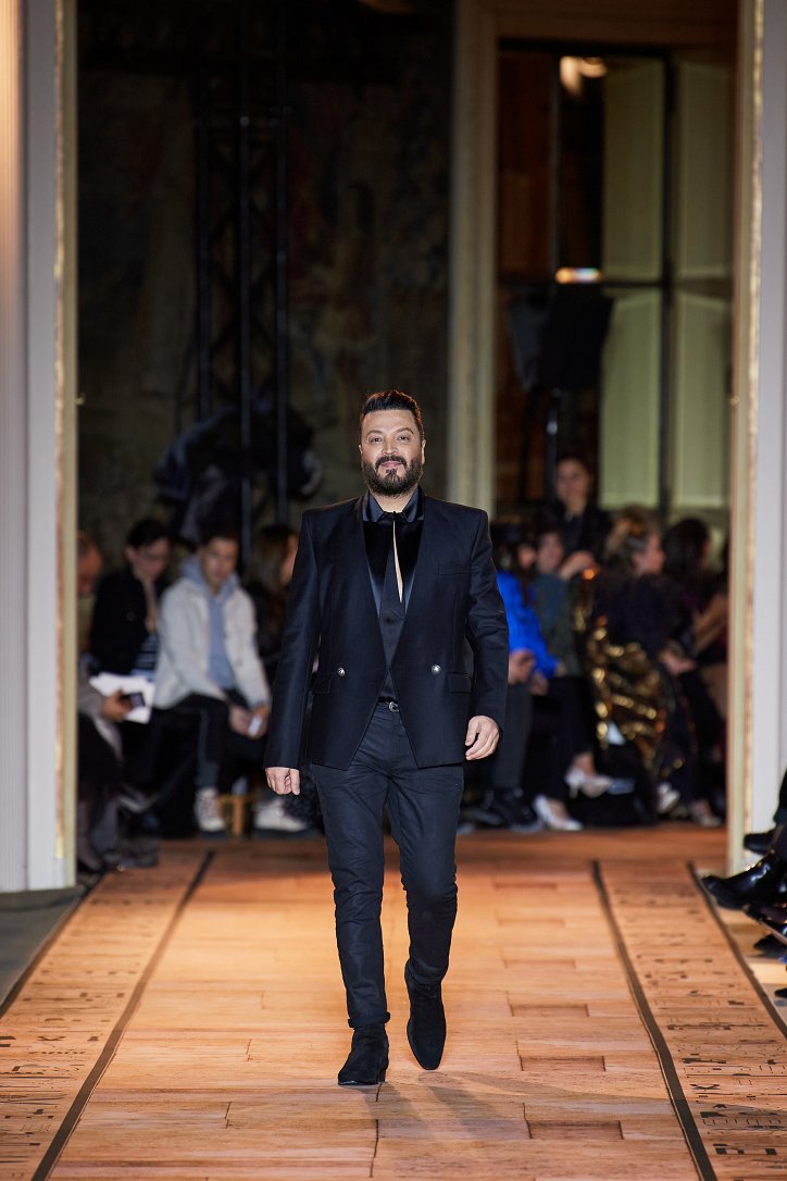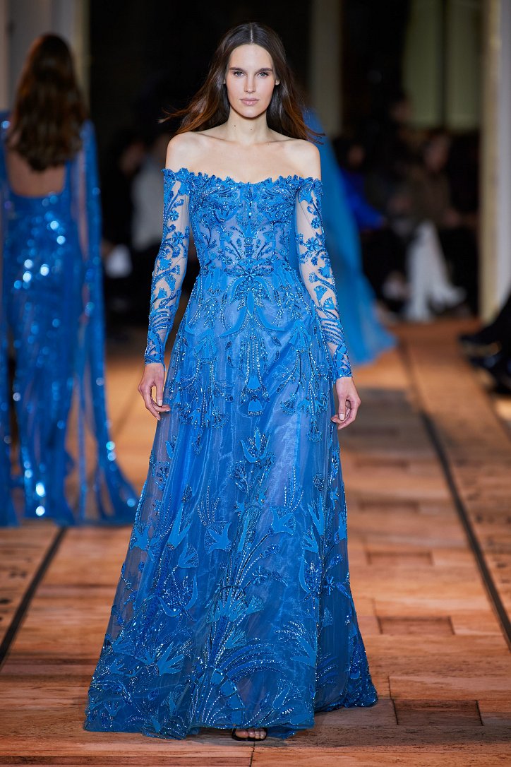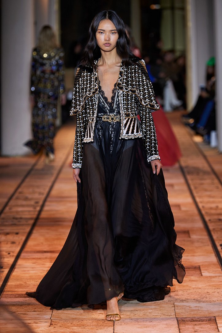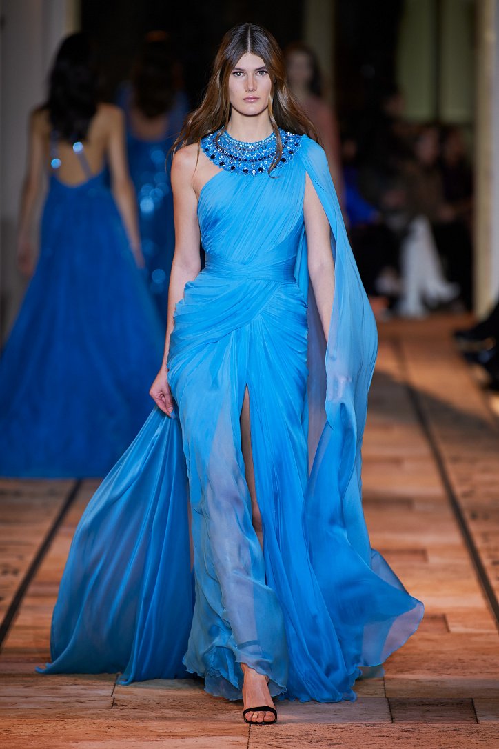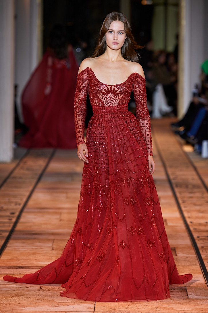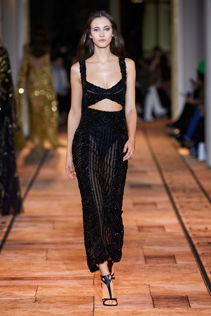 Вдохновение для своей новой кутюрной коллекции Zuhair Murad искал в Древнем Египте: об этом напрямую заявлял самый первый лук, состоящий из топа и юбки, полностью расшитых разноцветными кристаллами, бисером и пайетками. И это была совсем не абстрактная вышивка, а узнаваемые всеми рисунки с египетской символикой, которая придала мистическую окраску всей коллекции.